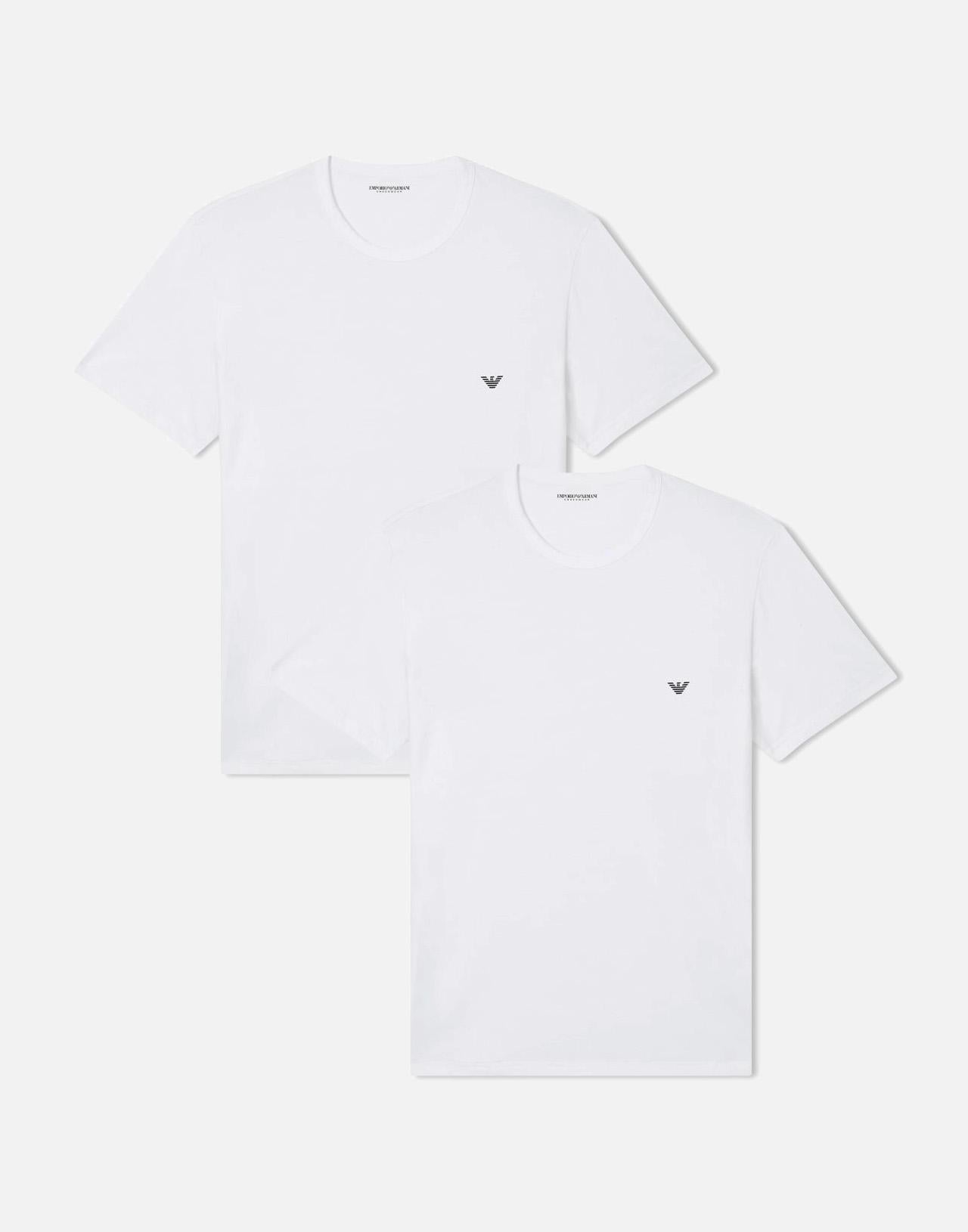 Set due t-shirt intime uomo Emporio Armani in cotone stretch color bianco, morbide e aderenti per un comfort ottimale. Presentano maniche corte, girocollo e mini logo a contrasto sul petto, simbolo di stile e discreta eleganza. Il taglio slim fit segue armoniosamente la silhouette, ideale sotto camicie o maglie.