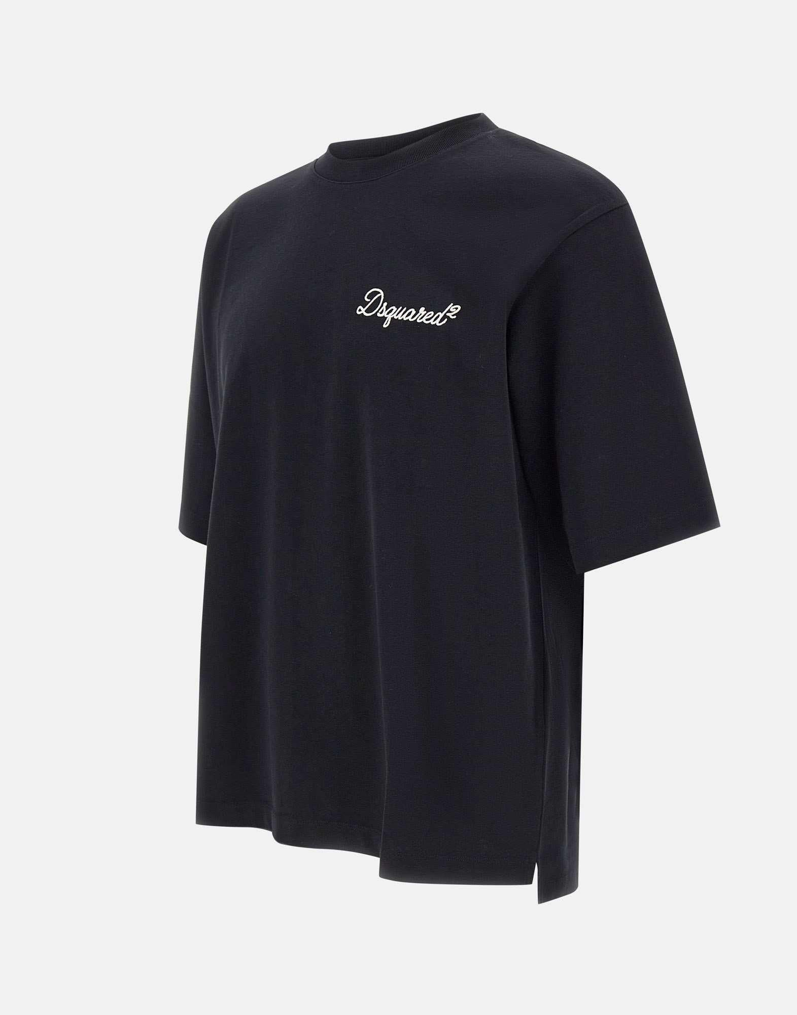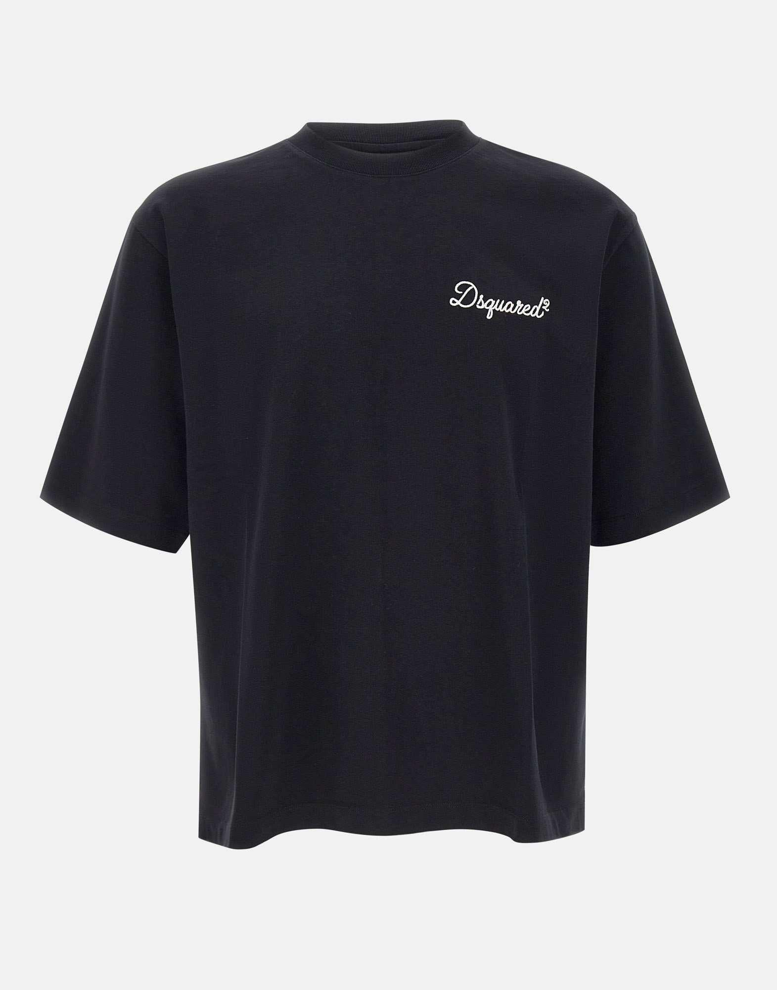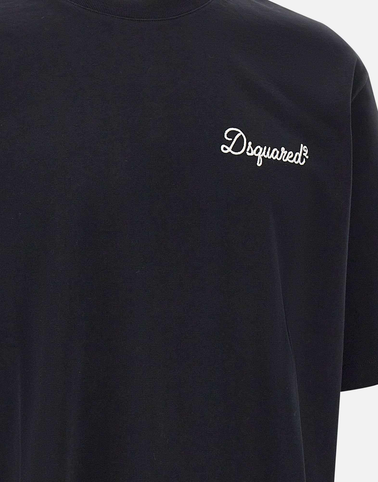 T-shirt uomo Dsquared2 "Signature" in 100% cotone, color nero, pensata con una vestibilità loose per un comfort rilassato e contemporaneo. Il modello presenta girocollo a costine e il classico logo Dsquared2 ricamato in bianco sul petto, dettaglio iconico che definisce il carattere del capo.