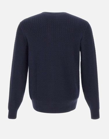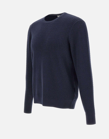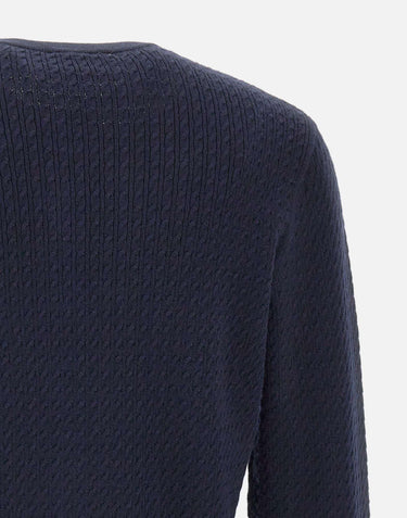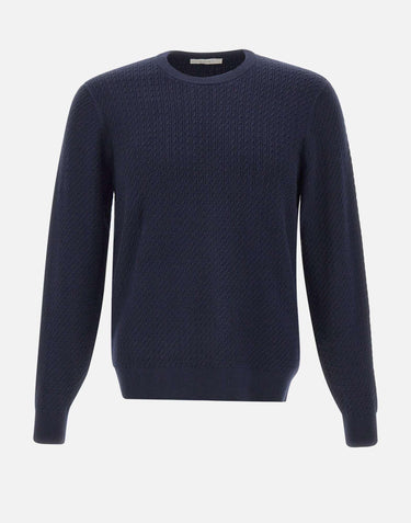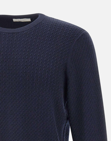 Maglia uomo Diktat in morbido misto cashmere e viscosa, blu, con girocollo e maniche lunghe. La lavorazione a trecce dona texture e carattere al capo, mentre i bordi a costine su collo, polsini e fondo assicurano una vestibilità regolare e confortevole. Perfetta per un look casual-chic nelle stagioni più fredde.