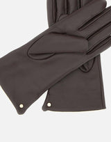 Guanti Gianni Chiarini in pelle, foderati con soffice lana, color testa di moro, rivetto logato color oro. Taglia unica