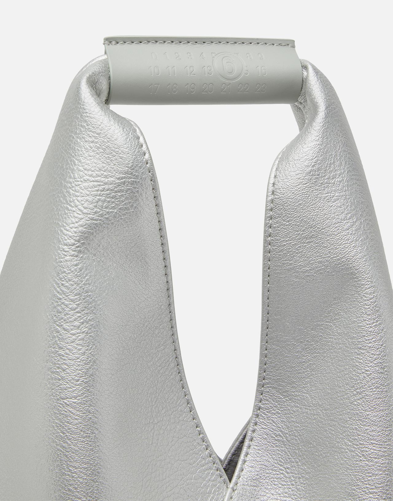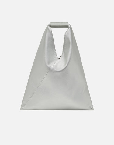 Borsa a mano MM6 Maison Margiela modello "Japanese Bag Small", realizzata in materiale effetto pelle color argento. La silhouette triangolare si ispira alla tradizionale tecnica giapponese dell'origami, con bottoni laterali che permettono di trasformarne la forma piegandola in diversi modi. Il design presenta manico superiore con firma numerica impressa e iconica cucitura bianca sul retro. Dimensioni: 34x39 cm (manico incluso). Custodia inclusa.