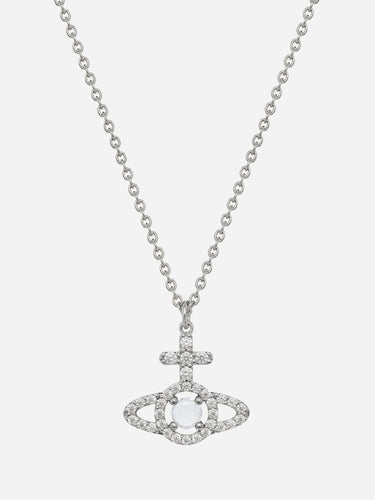 Collana donna Vivienne Westwood "Olympia Cubic Zirconia Pendant Necklace" ispirata a un design d'archivio, caratterizzata da un ciondolo Orb con cristallo sfaccettato al centro, illuminato da un pavé brillante che ne esalta la luminosità. Realizzata con placcatura argentata e finitura lucida, presenta motivo pianeta e dettagli in cristallo per un look elegante e distintivo. La catenina e regolabile e completata da chiusura a moschettone, con piastrina ovale a rilievo come dettaglio firma. Peso 5,9 g, lunghezza totale catena 44 cm, Orb 2 cm.