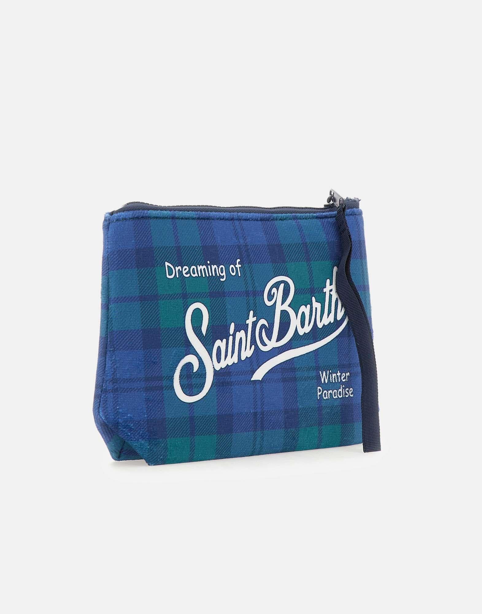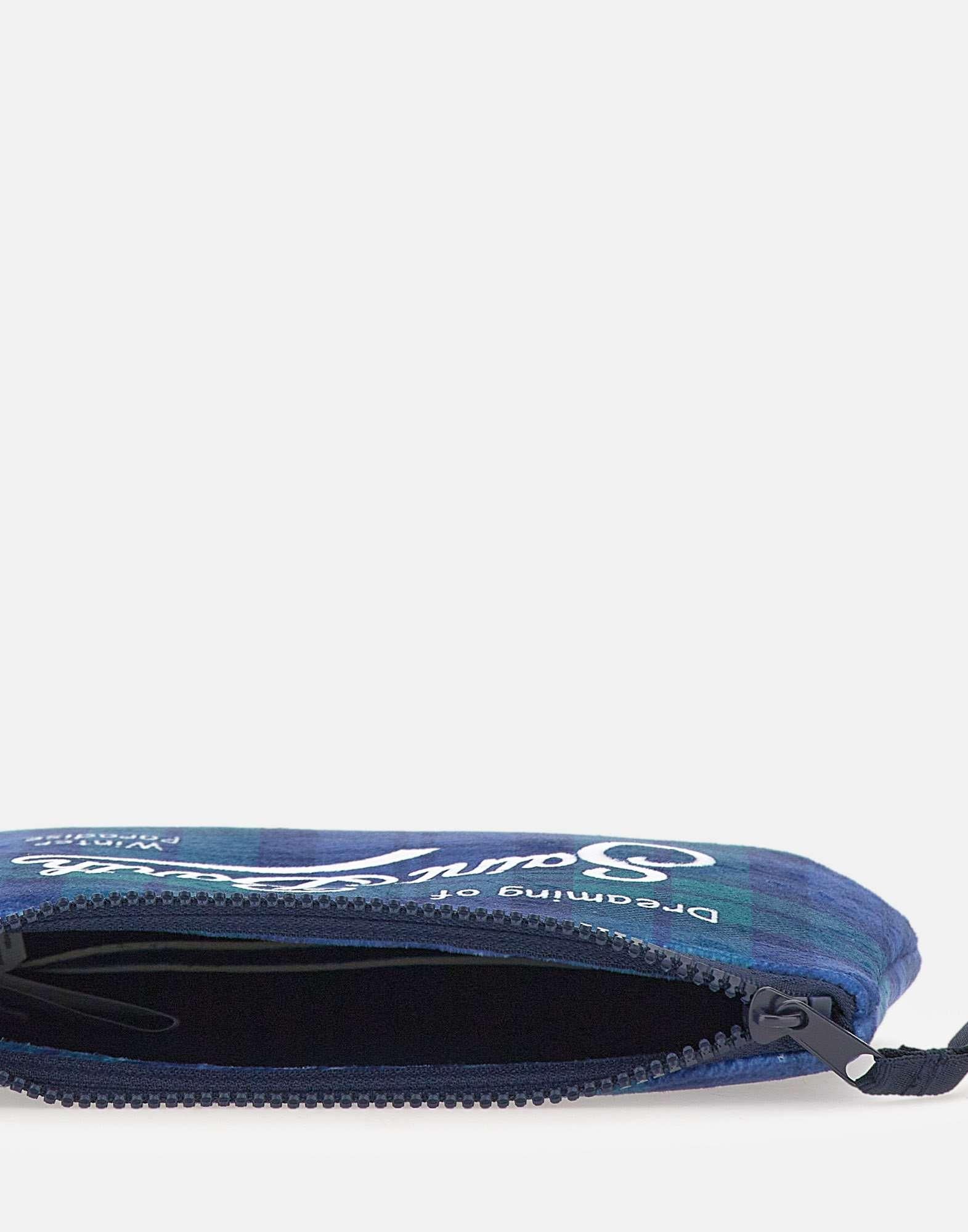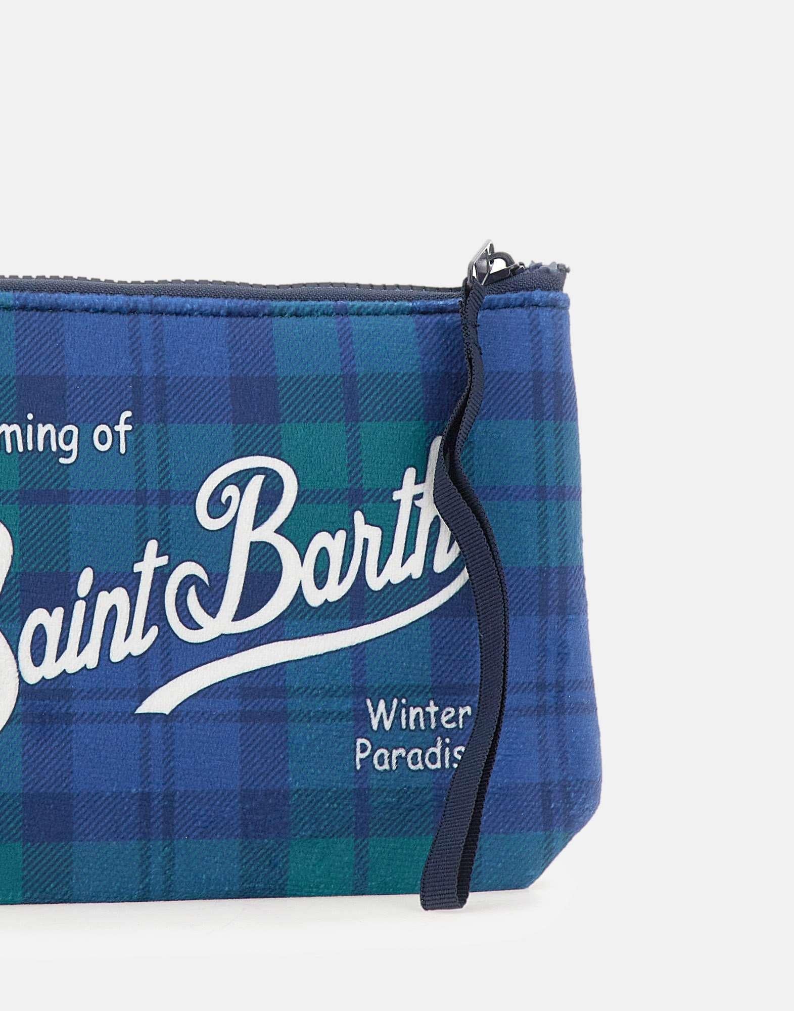 Pochette "Aline Tartan" multicolor nei toni blu e verde, realizzata in tessuto super morbido effetto velluto. Caratterizzata da loghi a contrasto sul fronte e sul retro e chiusura superiore con zip. Un accessorio iconico e versatile, perfetto per aggiungere un tocco distintivo a ogni look. Misure: 22×16×7 cm.