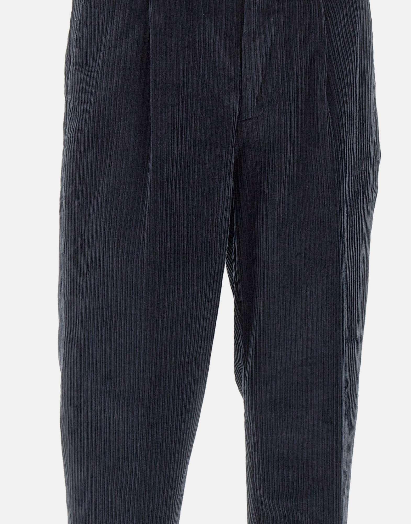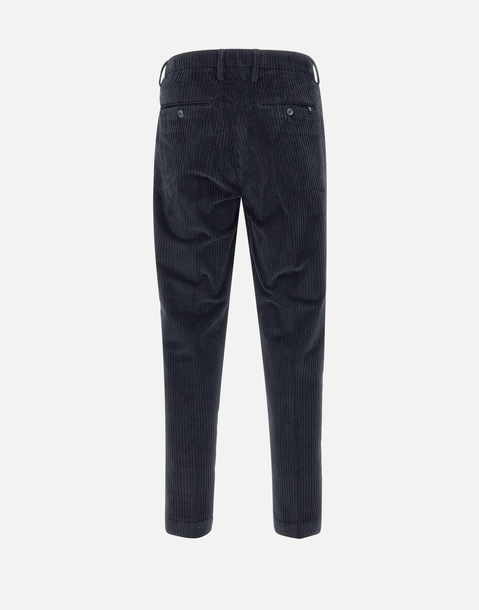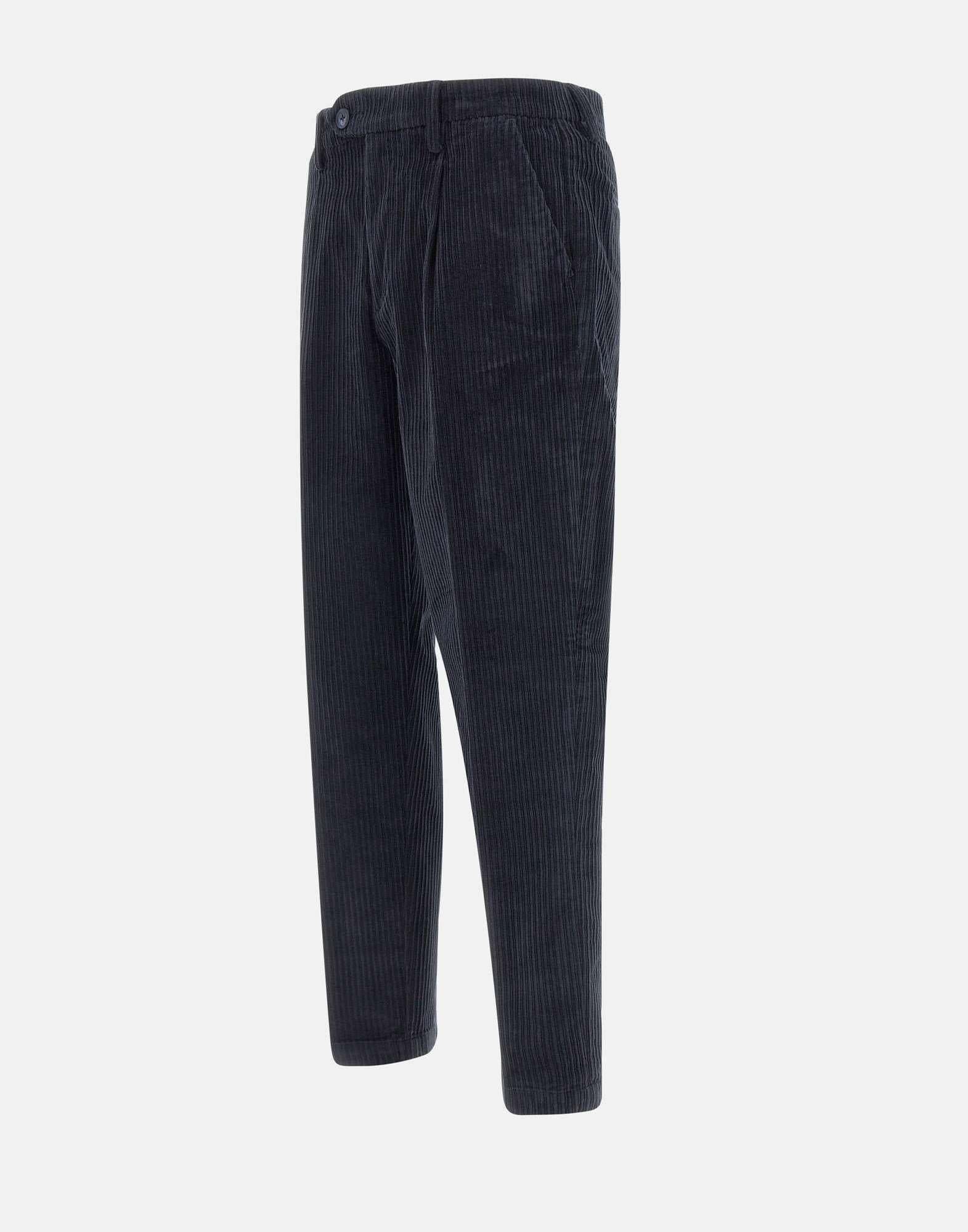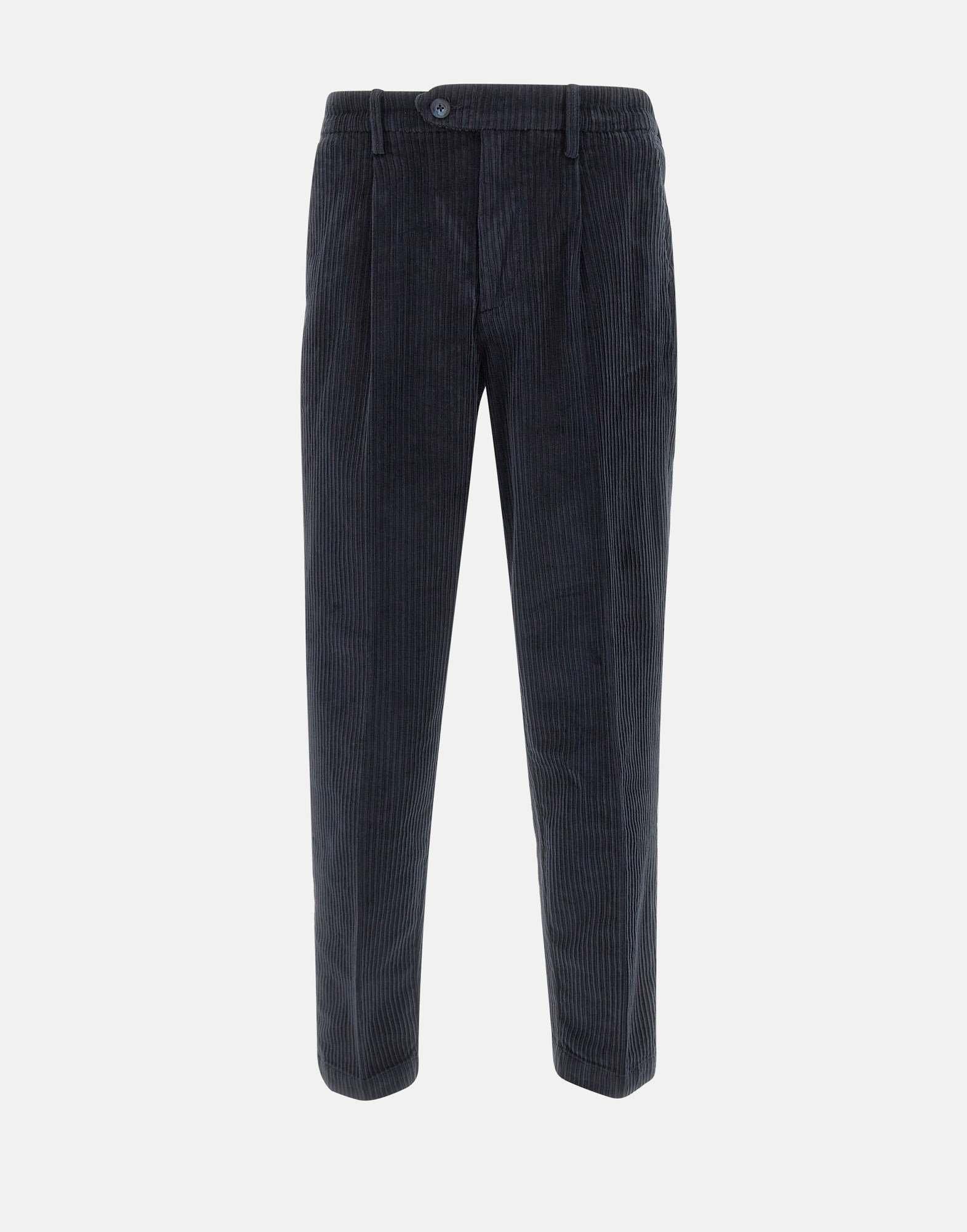 Pantaloni Re-Hash "Marc chinos", realizzati in velluto stretch a costine di colore blu. Il modello chino presenta pince frontali, tasche laterali e tasche posteriori con bottoni, oltre a chiusura con zip e bottoni e passanti per cintura. Il fondo da 17 cm e la vestibilità slim fit donano al capo uneleganza raffinata e contemporanea, ideale per look casual-chic. Made in Italy.