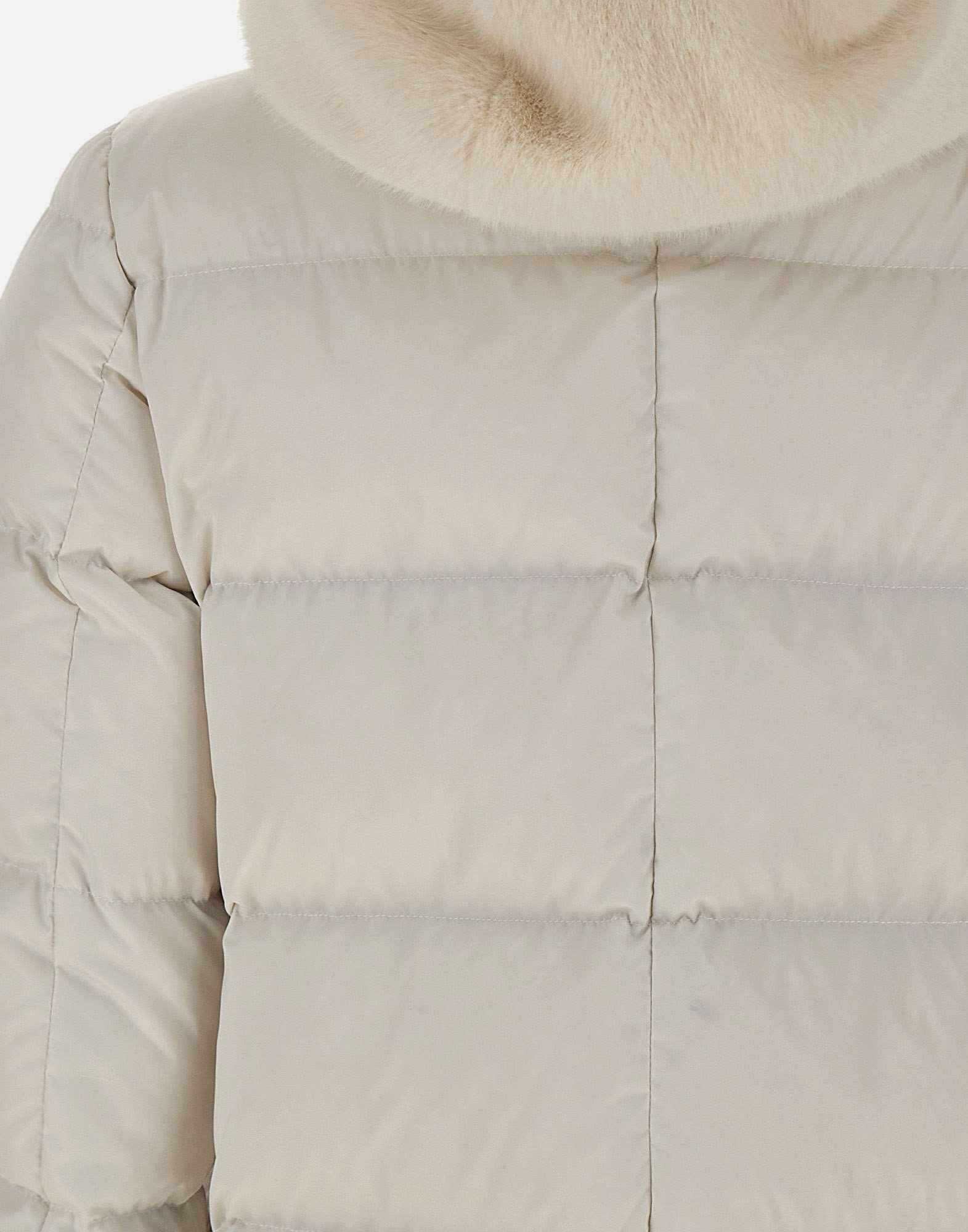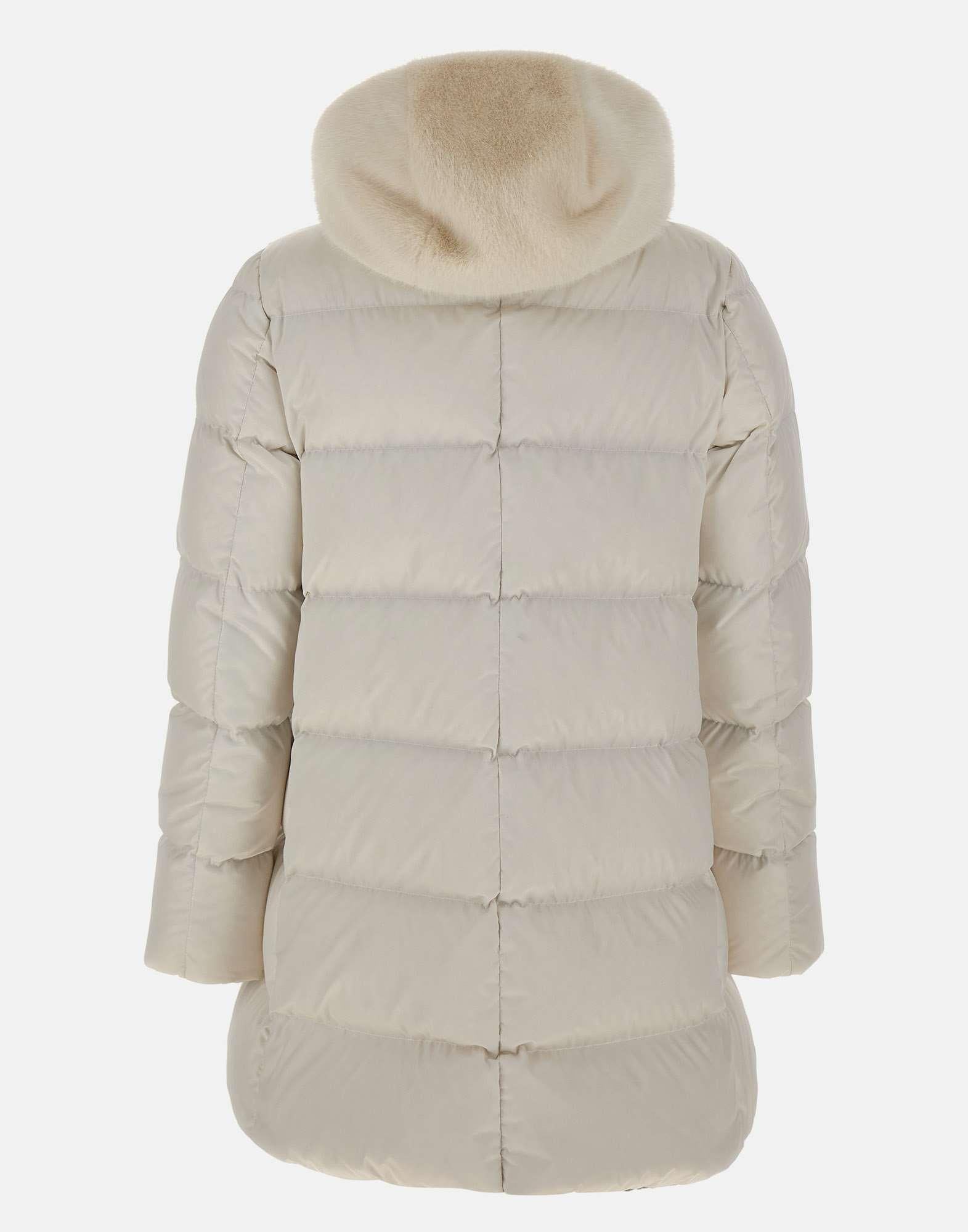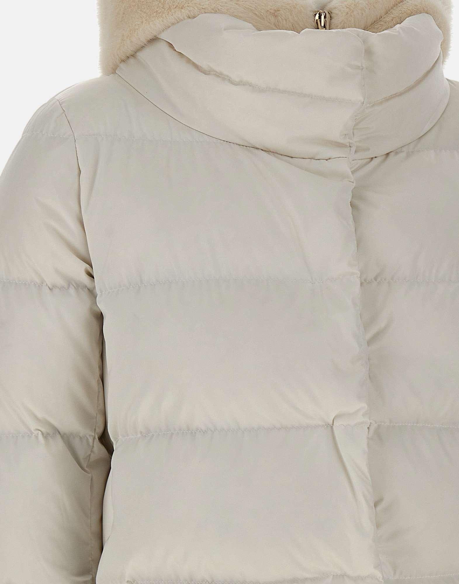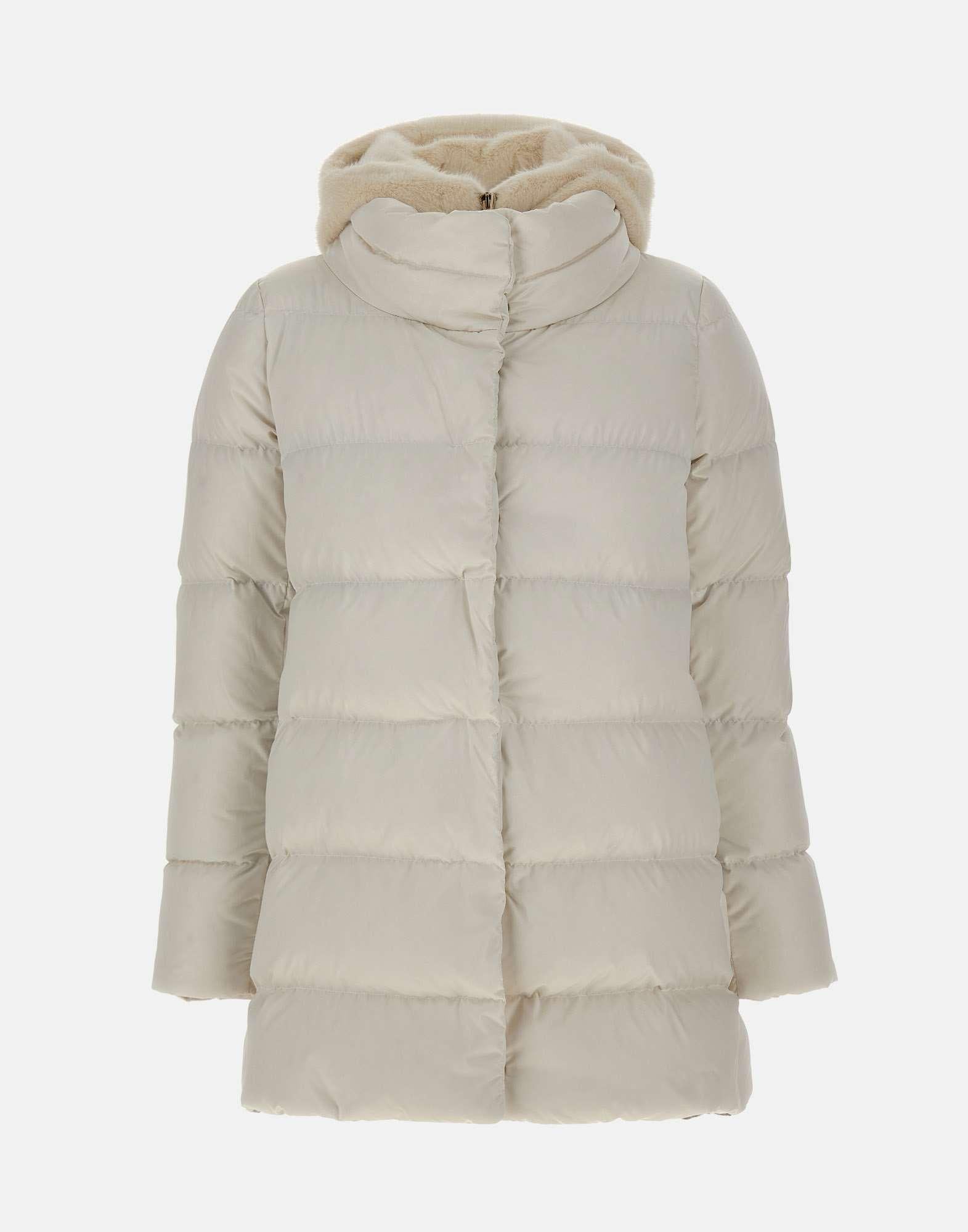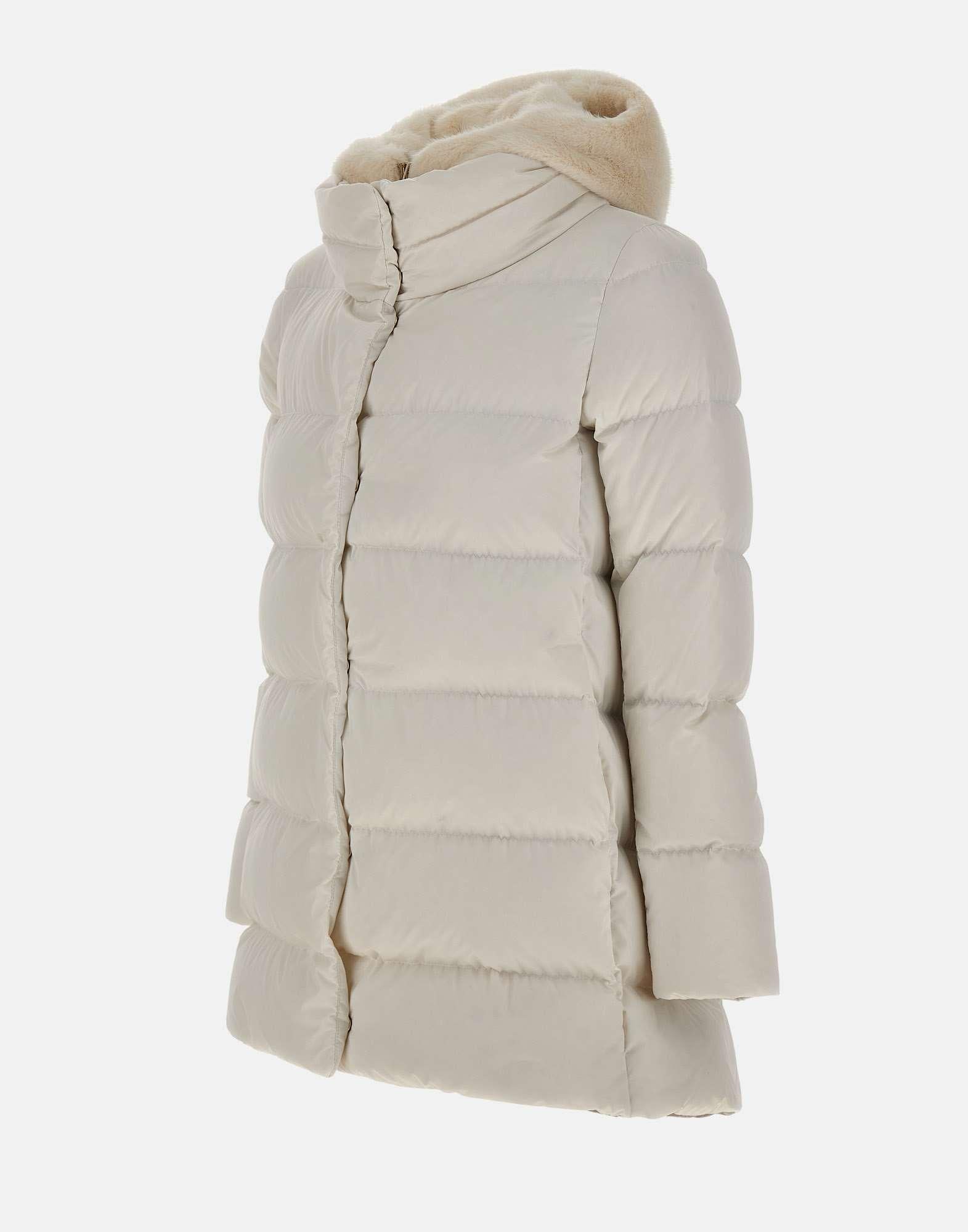 Piumino Herno "A-Shape" colore bianco, realizzato in raso ad alta densità dalla texture lucida e morbida al tatto. Dotato di pettorina removibile con cappuccio, rifinita in pelliccia sintetica effetto castorino per un look sofisticato e accogliente. Presenta trapuntatura orizzontale, chiusura coperta con zip e bottoni a pressione e tasche laterali a filetto. Imbottitura in piuma d’oca per un comfort termico ottimale. Vestibilità regolare.