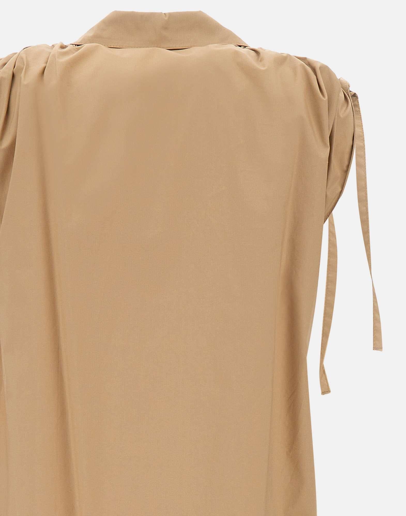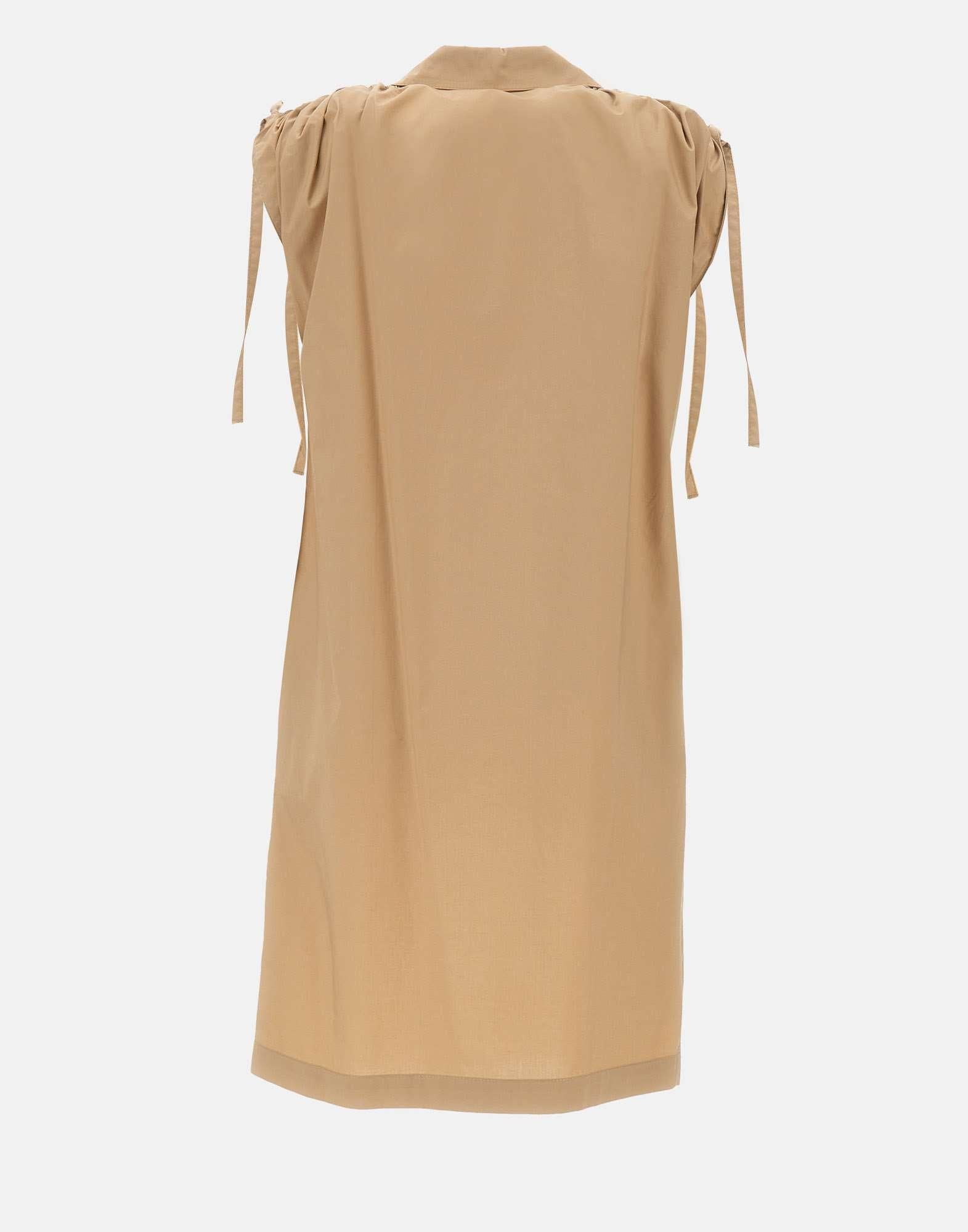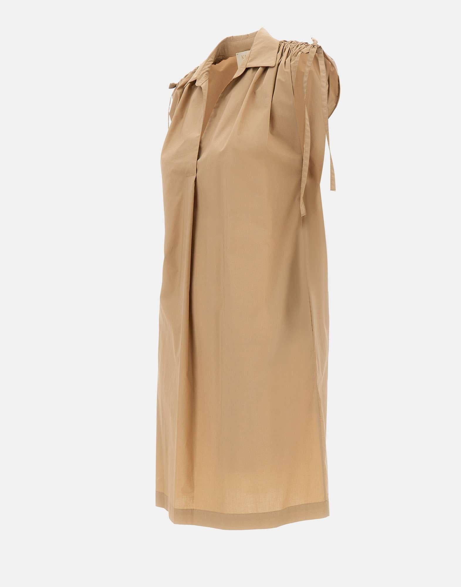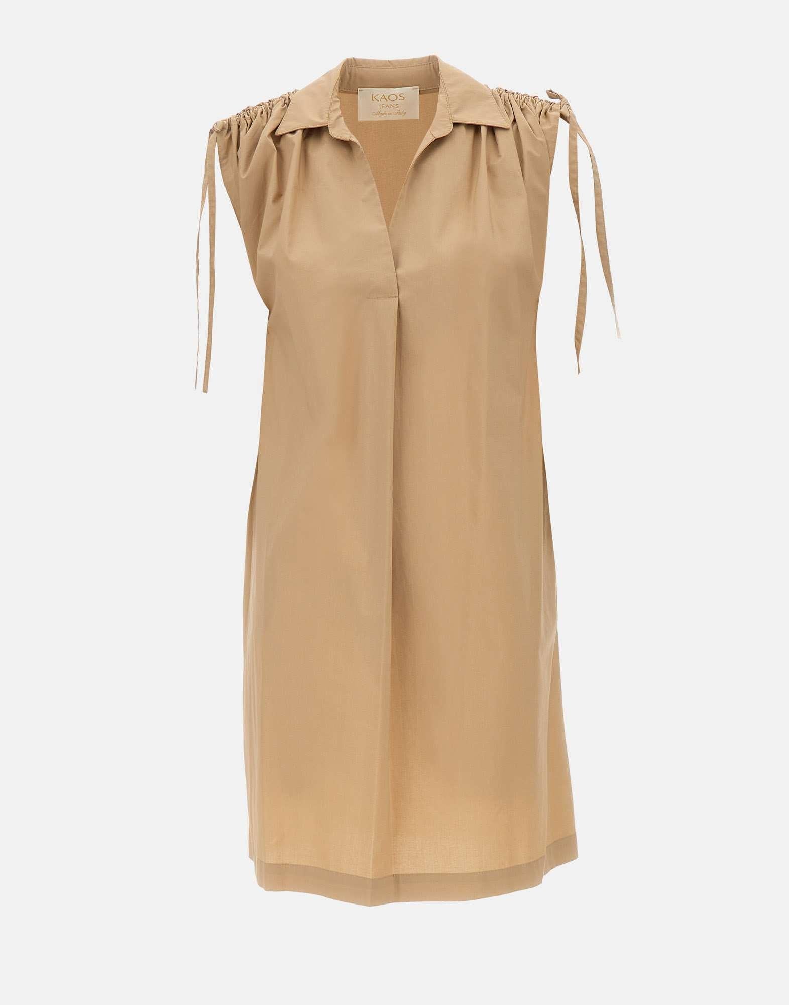 Abito Kaos in popeline di cotone, caffè, colletto a camicia senza bottoni e scollo a V, smanicato, dettaglio super romantico con fiocchetti e arricciature sulle spalle, vestibilità morbida ma regolare, made in Italy