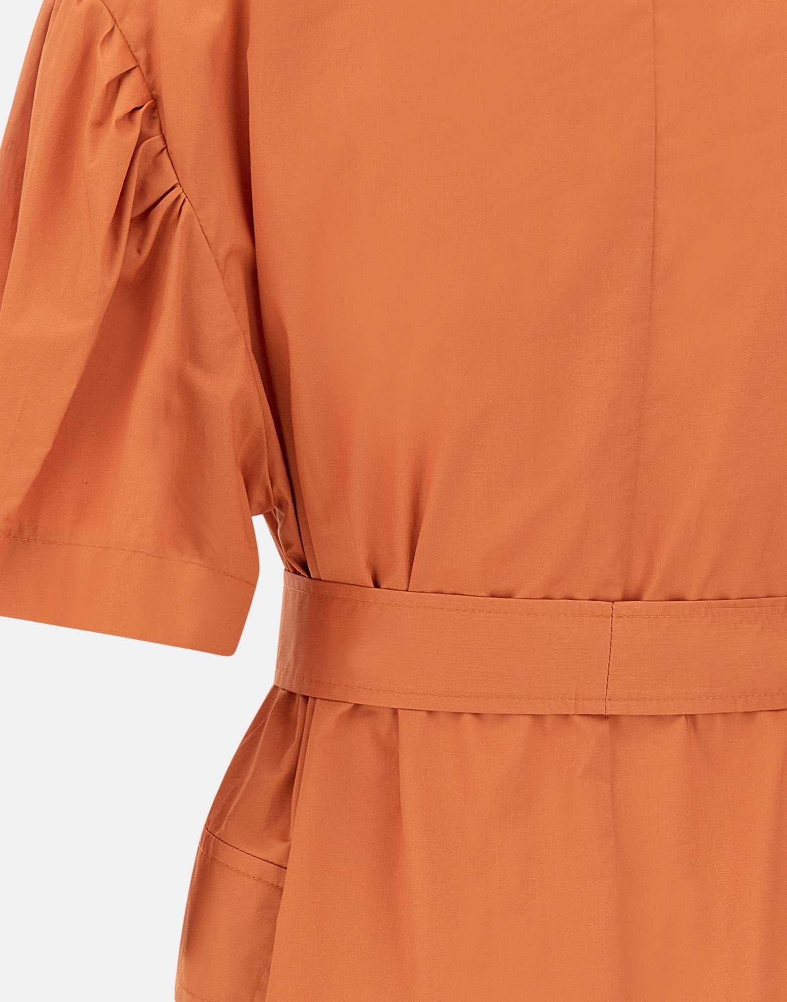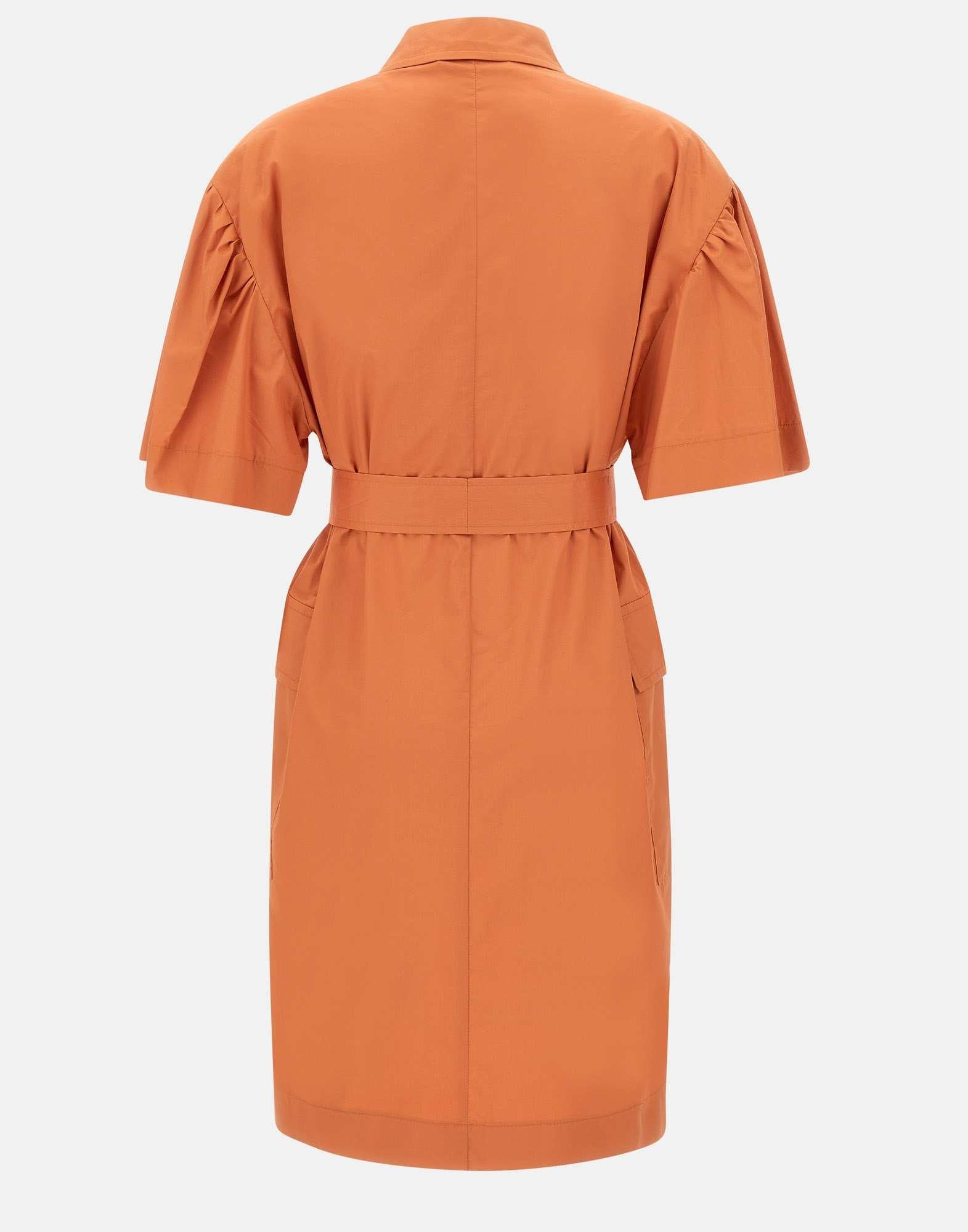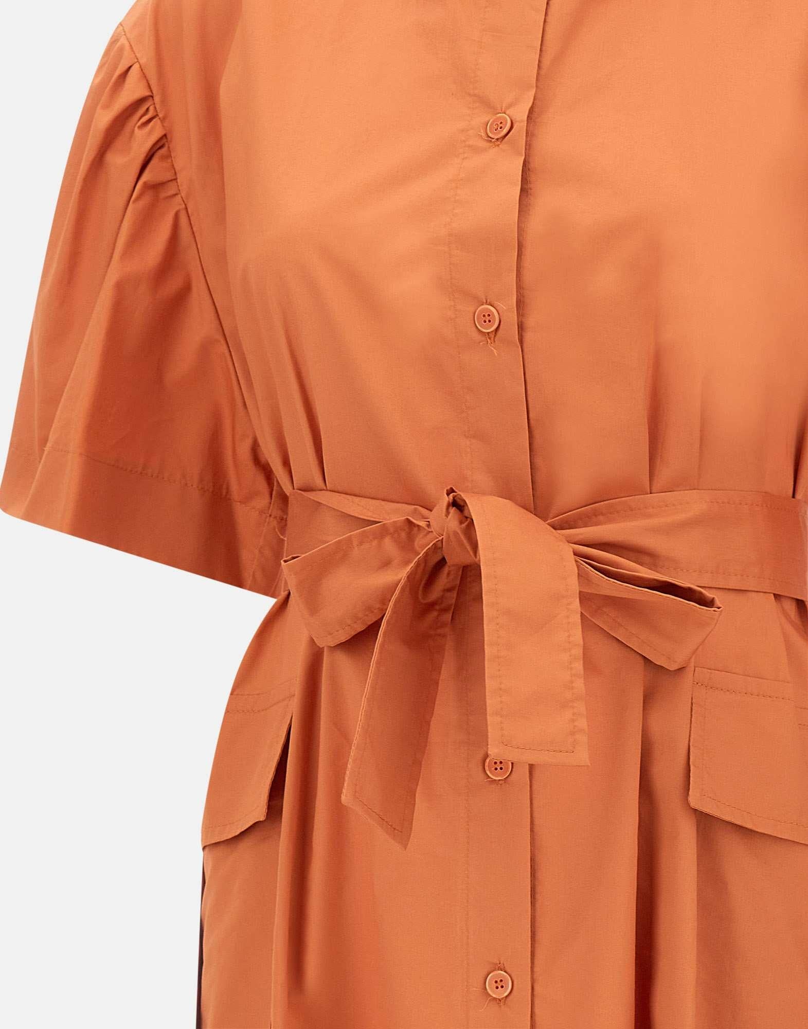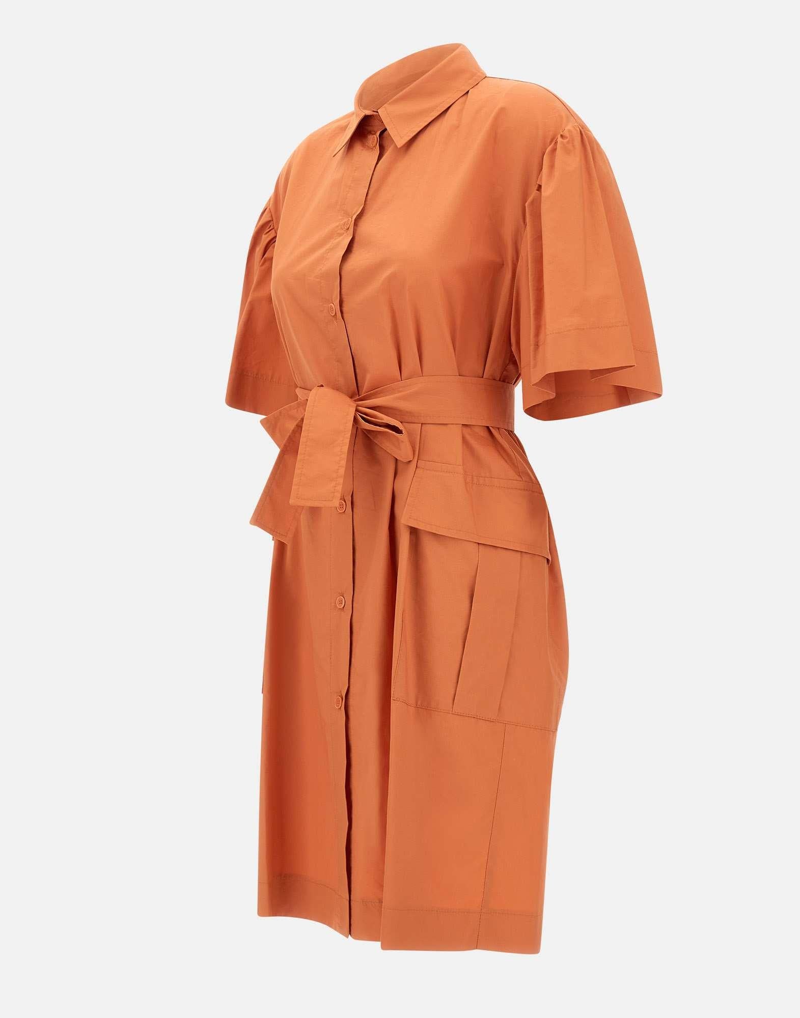 Abito Kaos in popeline di cotone, arancio, modello chemisier, maniche corte, colletto classico, chiusura con bottoni in tinta, tasche laterali con patta, linea leggermente ad uovo, cintura inclusa, regular fit, made in Italy.