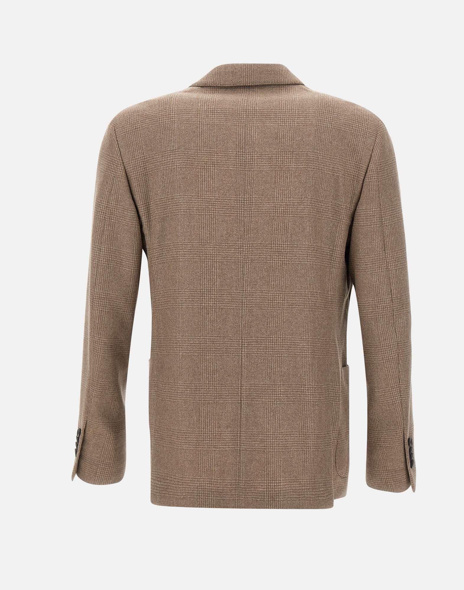 Blazer Lardini uomo in puro cashmere Loro Piana, caffelatte su fantasia tartan, chiusura doppiopetto con bottoni a contrasto, polsini con bottoni, collo con rever a lancia, foderato in viscosa e cupro, tasche frontali, taschino sul petto, spacchi laterali sul retro, tasche interne, regular fit, made in Italy