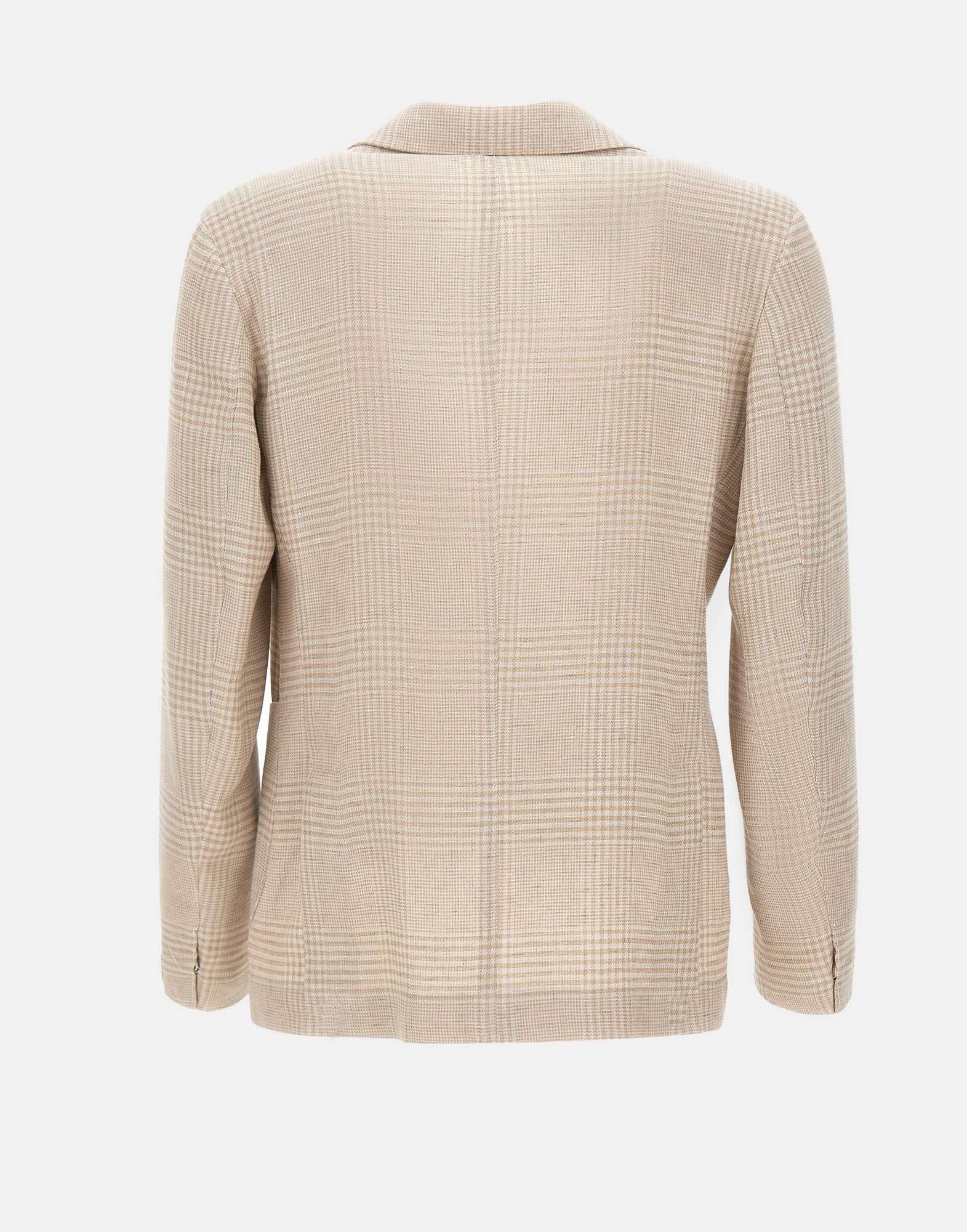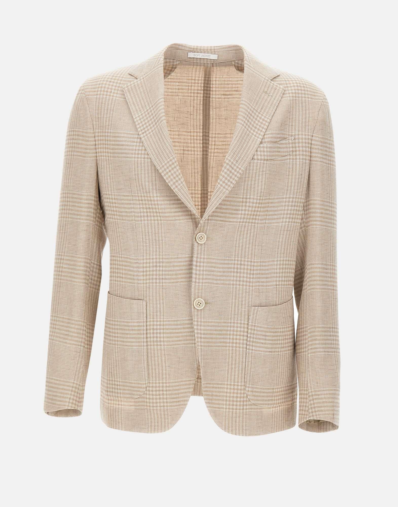 Blazer uomo Eleventy realizzato in pregiato tessuto di lino e lana con motivo principe di Galles nei toni del beige, caratterizzato da un'eleganza raffinata e da una costruzione soft destrutturata che ne esalta il fascino contemporaneo. Il modello monopetto presenta una vestibilità slim che definisce la silhouette con naturalezza, mentre il bottone singolo sulla manica, segno distintivo del brand ispirato alla tradizione della sartoria napoletana, aggiunge un dettaglio iconico e ricercato. Completano il design due tasche a toppa, taschino pochette e doppio spacco sul retro, elementi che valorizzano questo blazer Made in Italy con equilibrio tra stile sartoriale e versatilità.