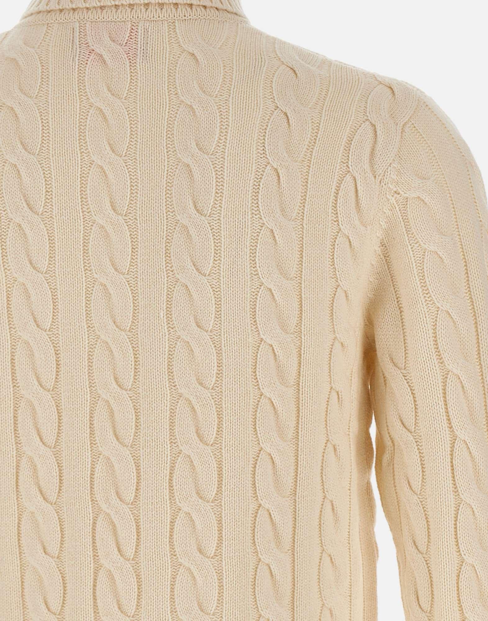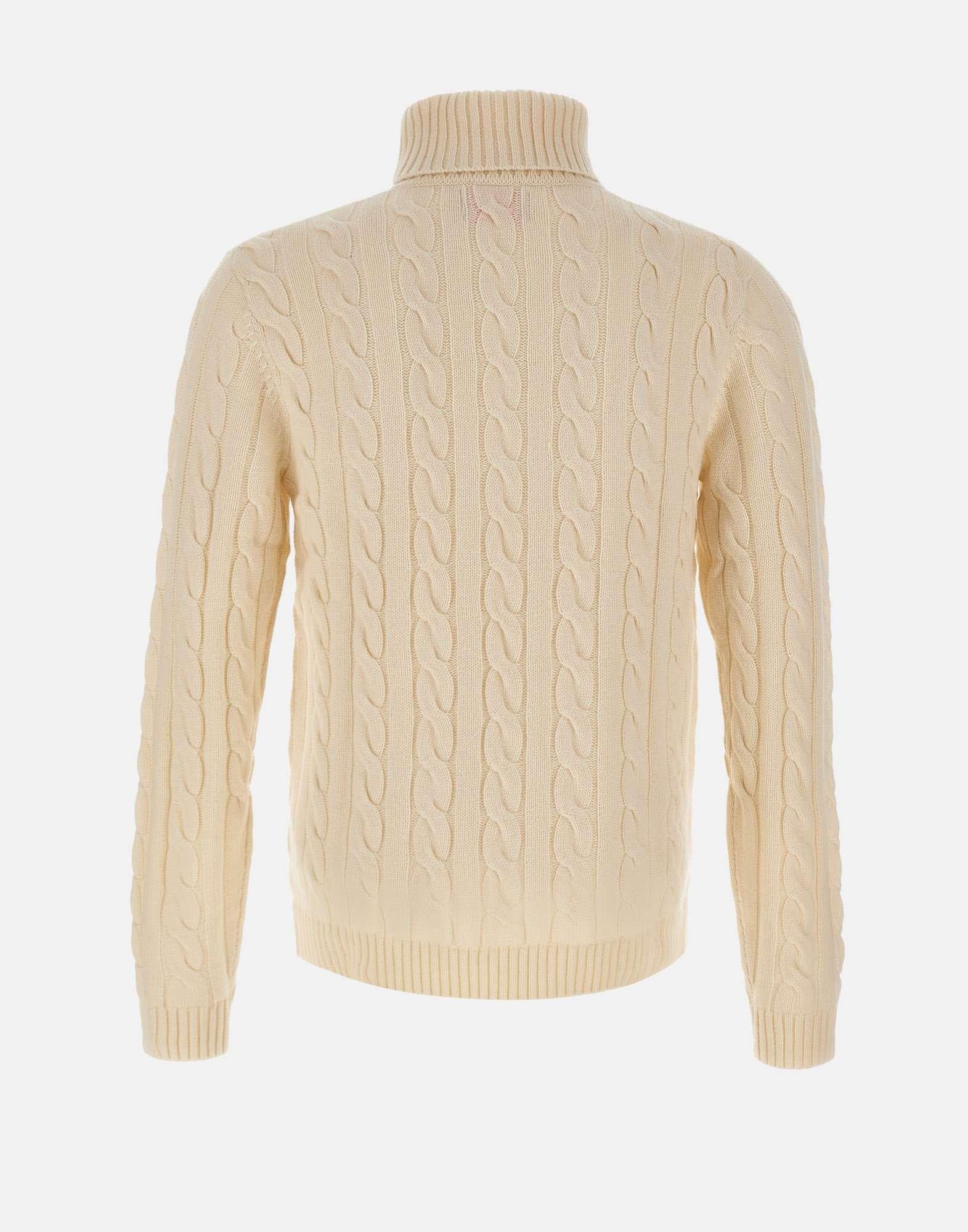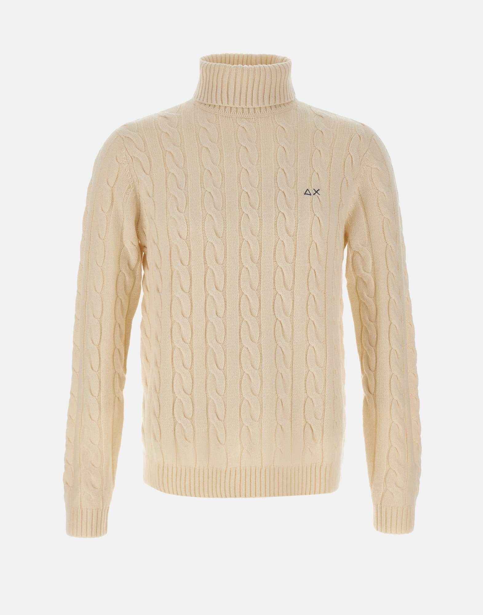 Maglia uomo Sun68 "Cable Knit" in filato di misto lana e cashmere color panna, realizzata con lavorazione a trecce per un effetto caldo e raffinato. Presenta collo dolcevita, maniche lunghe e bordi a costine che assicurano comfort e vestibilità ottimale. Il logo ricamato sul petto completa il design con un tocco distintivo. Regular fit, perfetta per look casual eleganti e versatili.