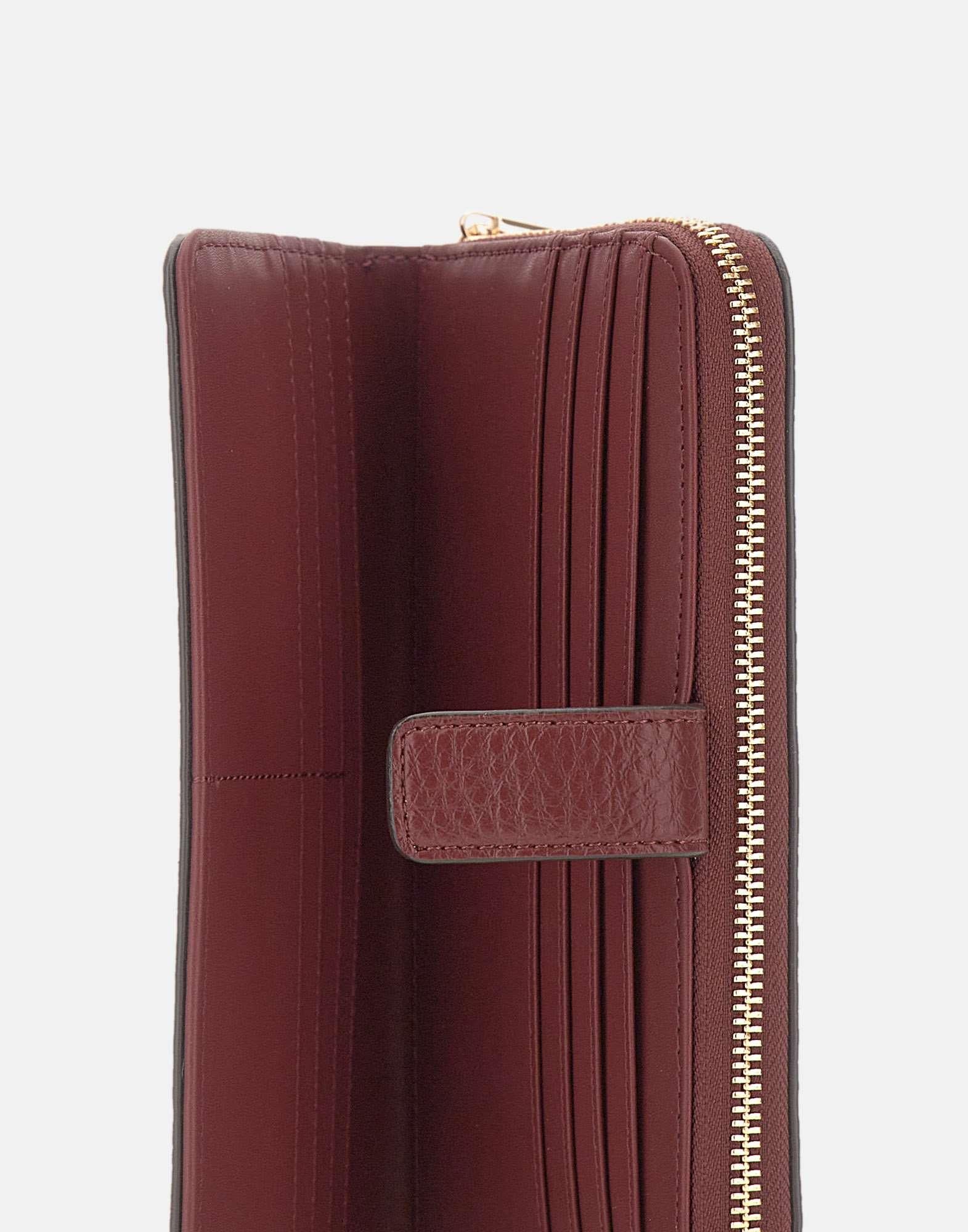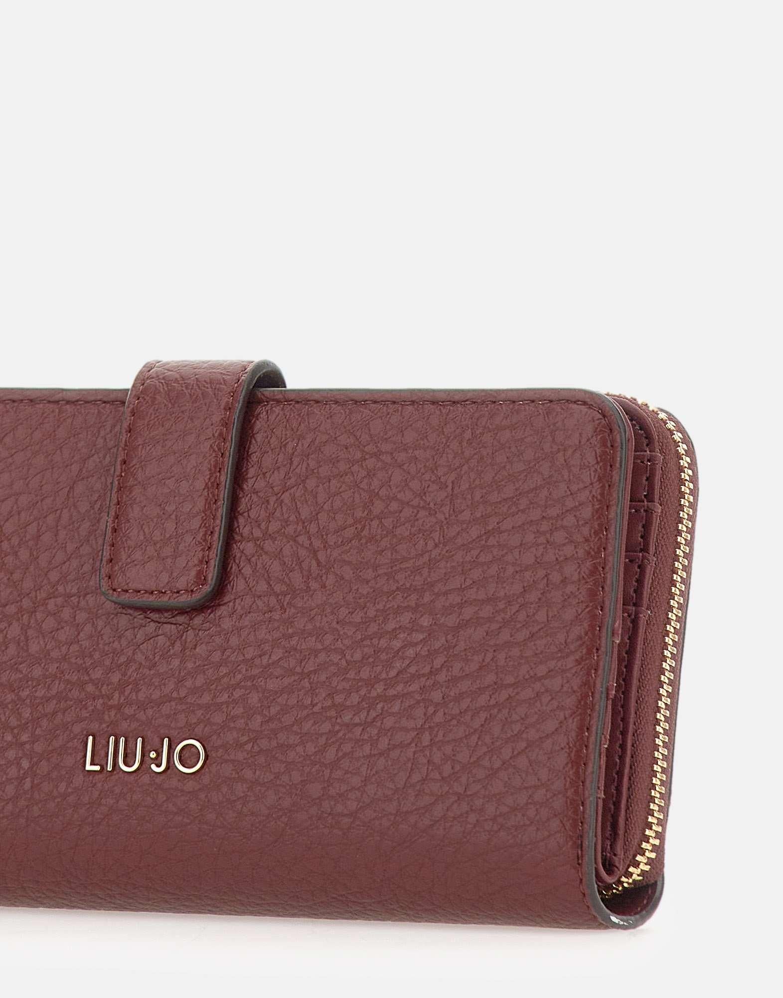 Portafoglio Liu-Jo "Caliwen" in ecopelle borgogna con stampa effetto bottalato, elegante e funzionale. Presenta logo in metallo sul davanti, scomparto interno per carte e tessere chiuso da bottone, scomparto chiuso da zip con altri scomparti per carte e tasca portamonete. Appartenente alla linea "Liu Jo Better", è realizzato con materiali e processi sostenibili. Dimensioni: 19 x 2 x 10 cm.