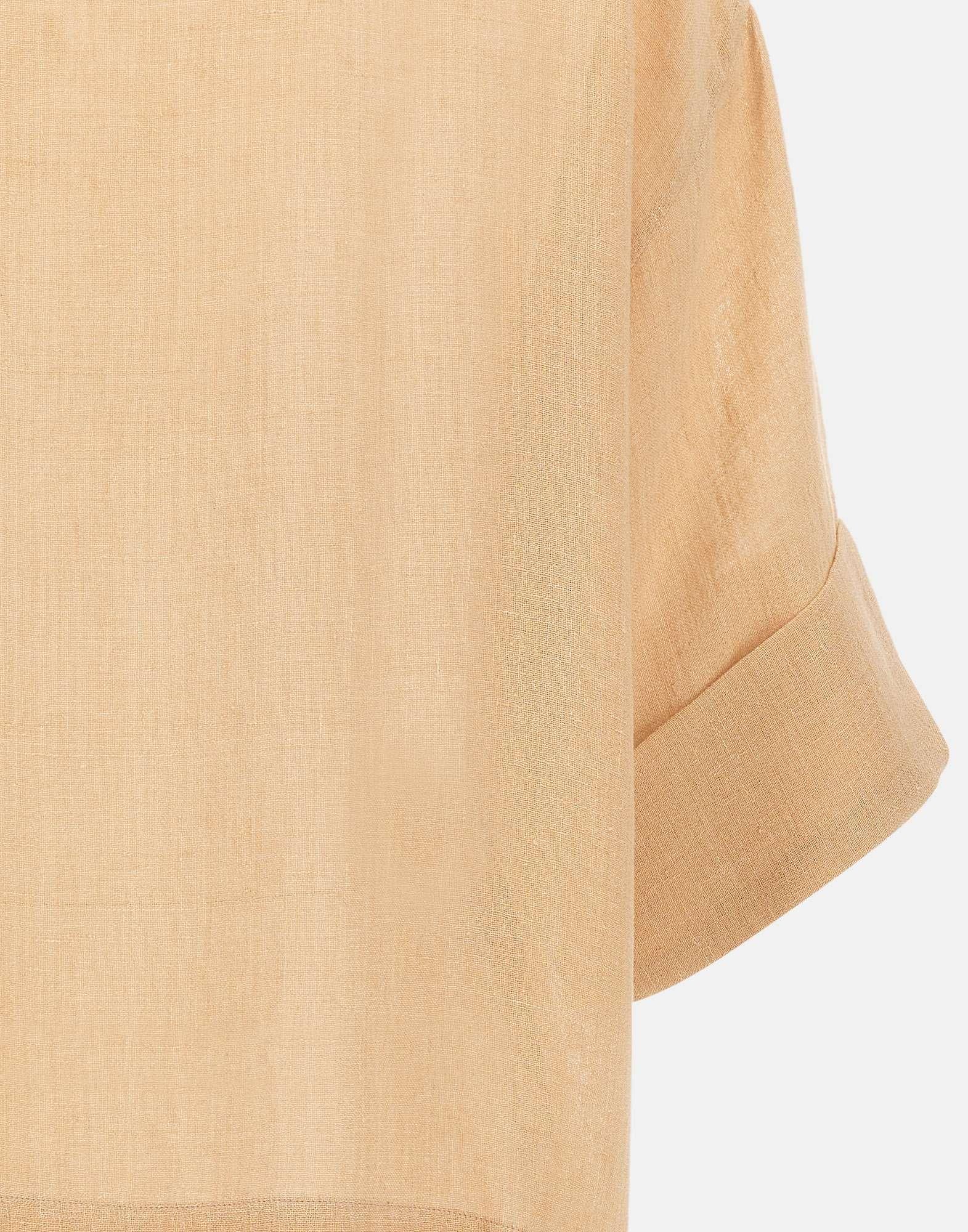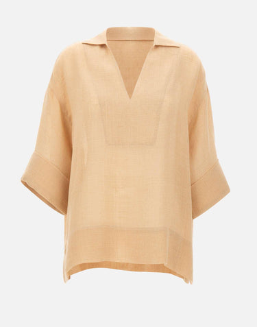 Camicia donna Eleventy realizzata in tessuto di lino garzato leggero color beige, ideale per la stagione più calda grazie alla sua mano fresca e ariosa. Il modello presenta un profondo scollo a V con colletto, maniche a 3/4 e spalle scese che ne accentuano l'attitudine rilassata e contemporanea. Gli spacchi laterali donano ulteriore fluidità alla linea, mentre la vestibilità over assicura comfort e naturale eleganza. Una camicia donna in lino versatile e raffinata, perfetta per completare look estivi dal gusto essenziale. Made in Italy.