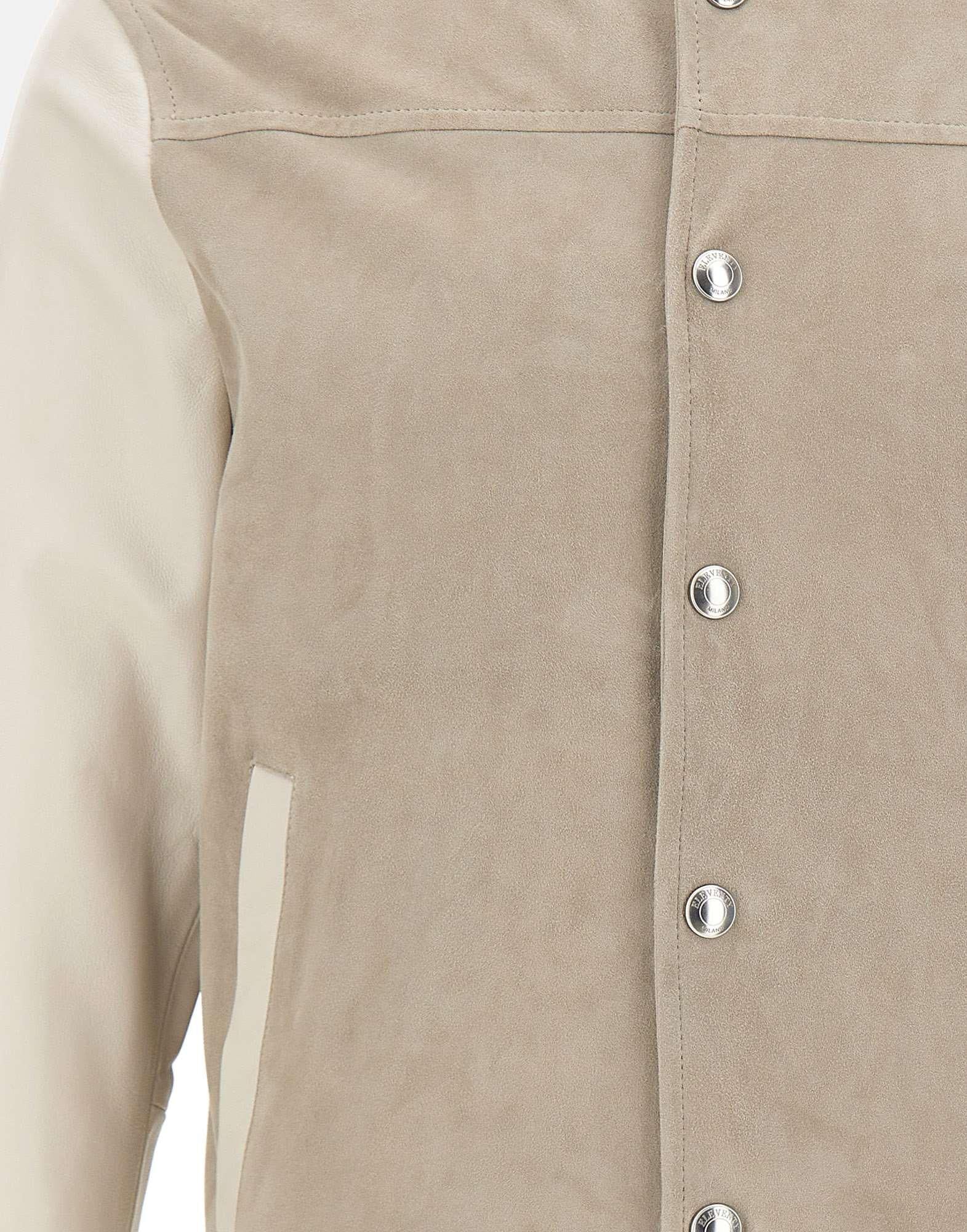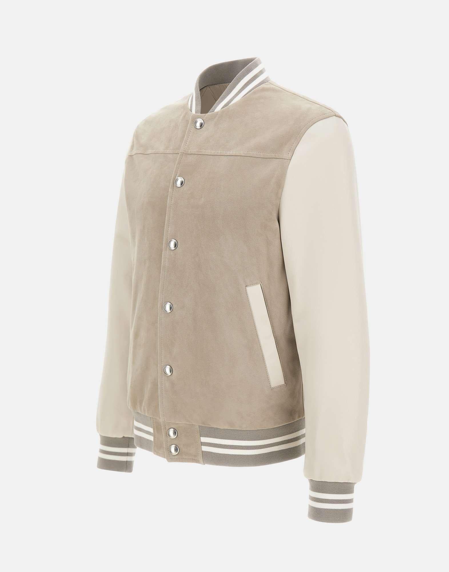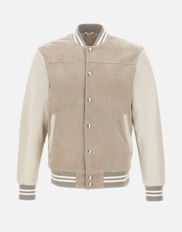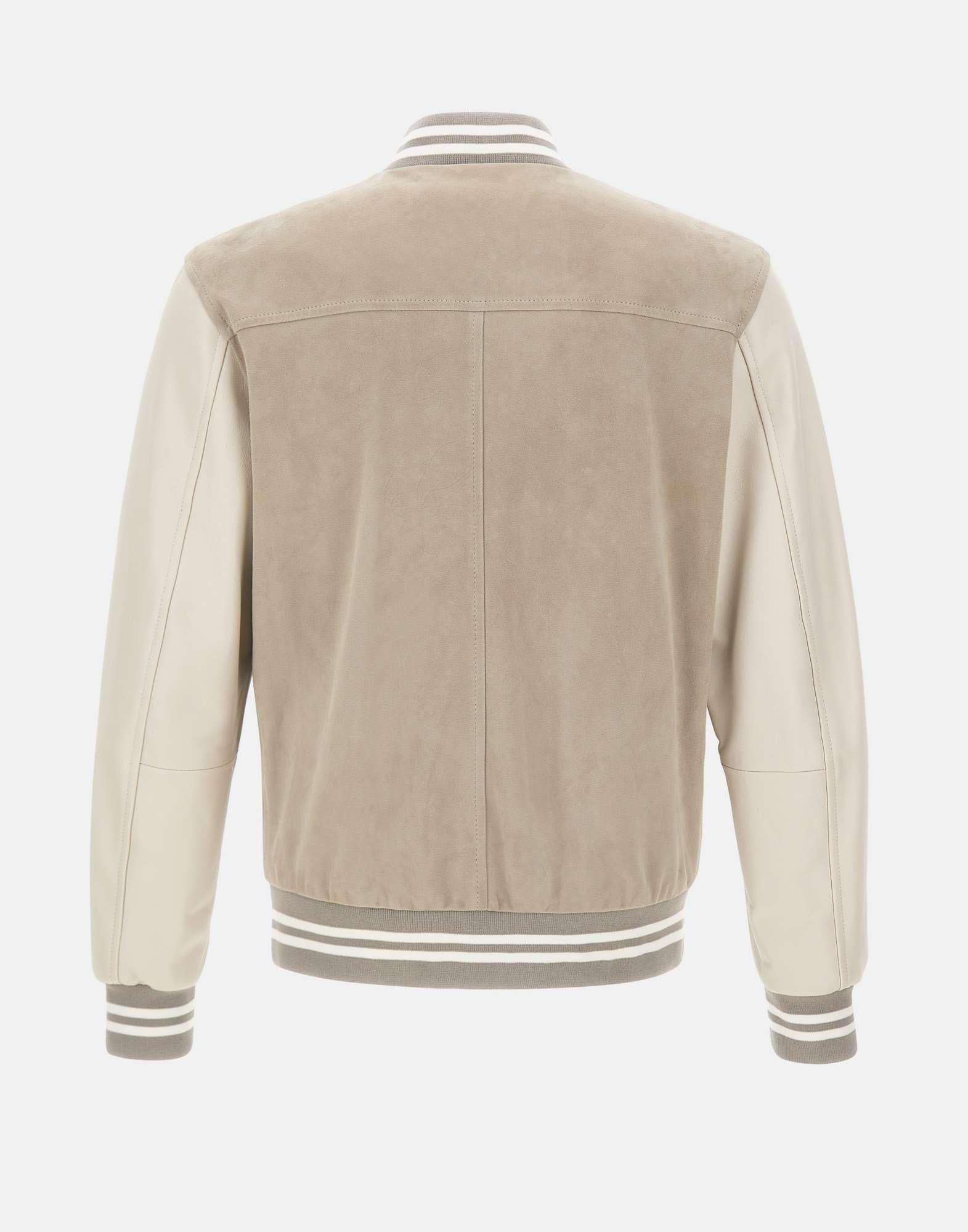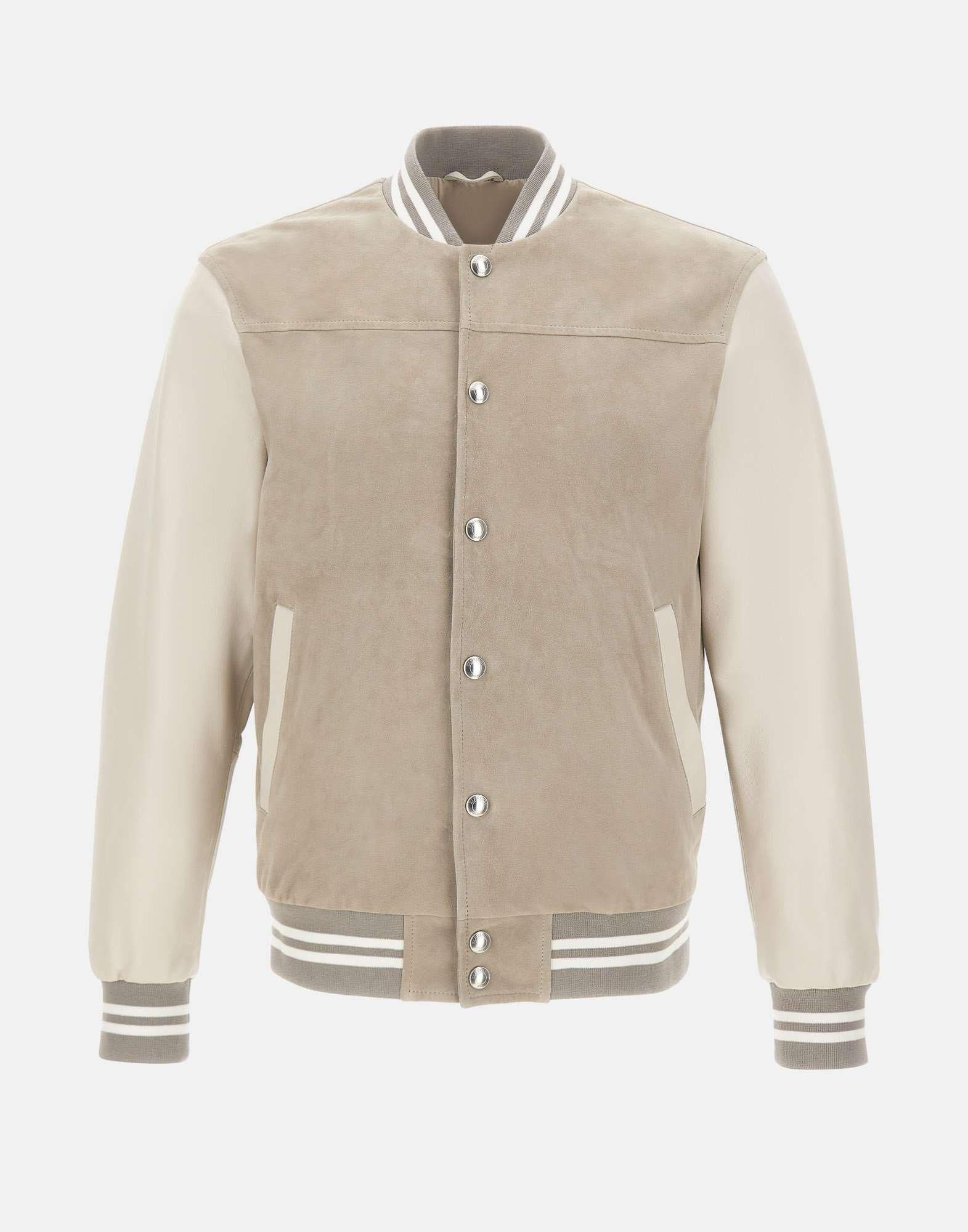Giacca bomber uomo Eleventy realizzata in pelle scamosciata color grigio, arricchita da maniche e filetti delle tasche in nappa color panna che creano un raffinato contrasto materico. Il modello presenta colletto, orlo e polsini a costine con righe bianche e grigie, dettaglio che aggiunge un accento sportivo ed elegante. La chiusura con bottoni logati a pressione e le tasche laterali a filetto con bottoni a pressione garantiscono funzionalità e pulizia delle linee. Interamente foderata, offre comfort e una struttura curata. Vestibilità regolare, ideale per completare look casual e sofisticati. Made in Italy.