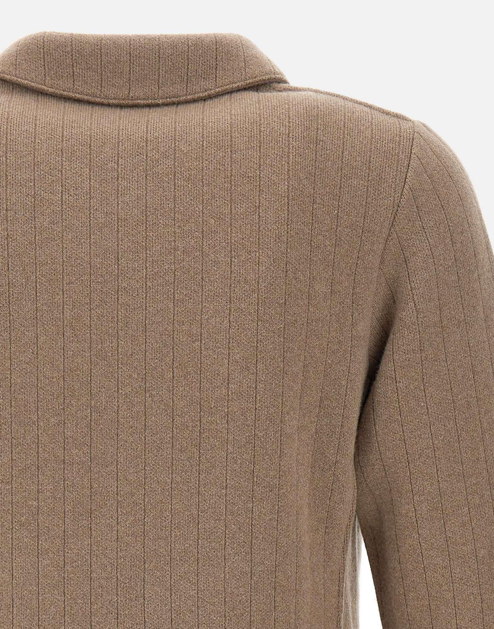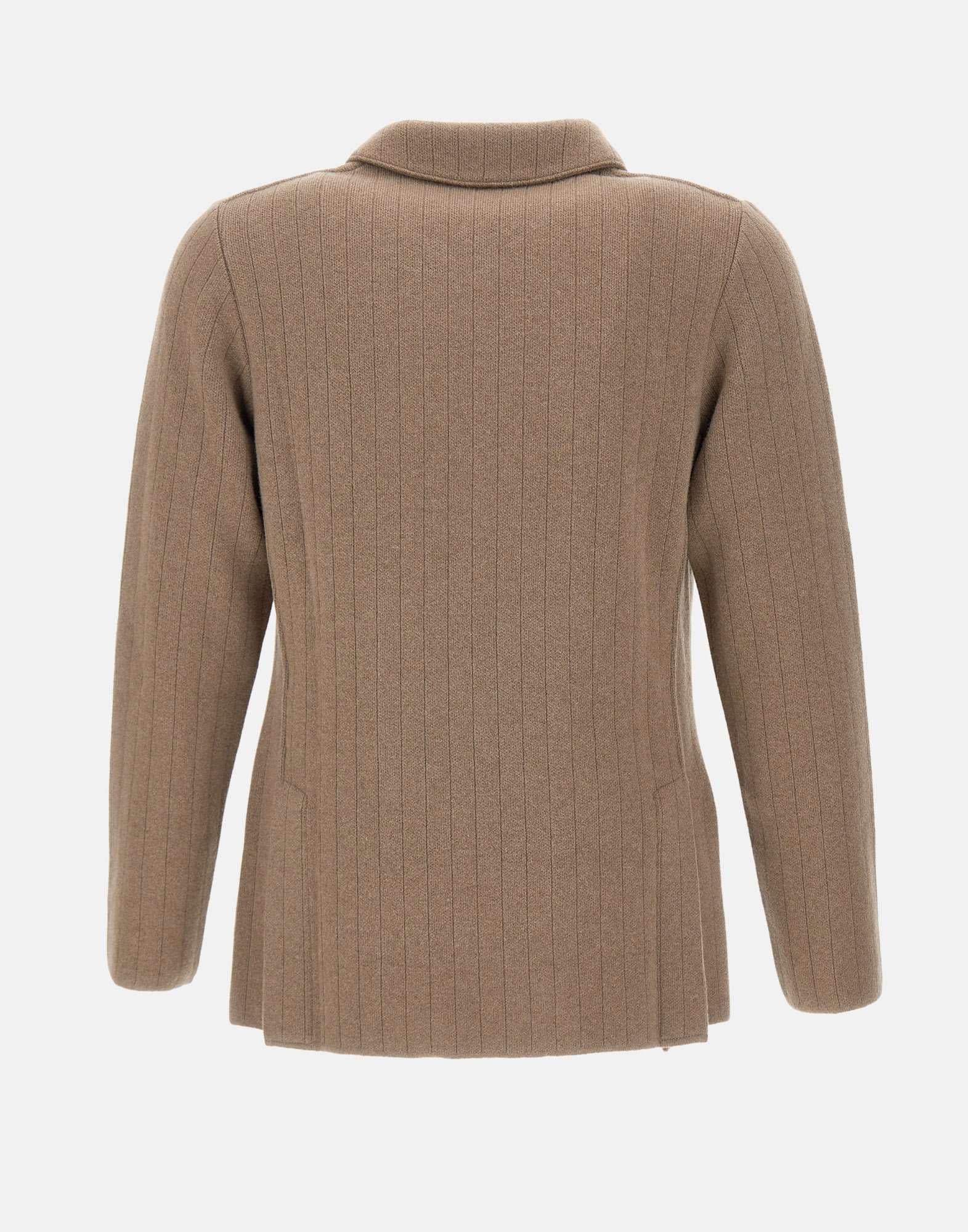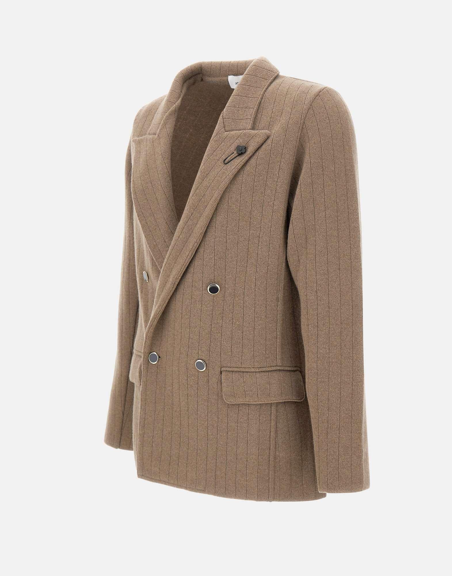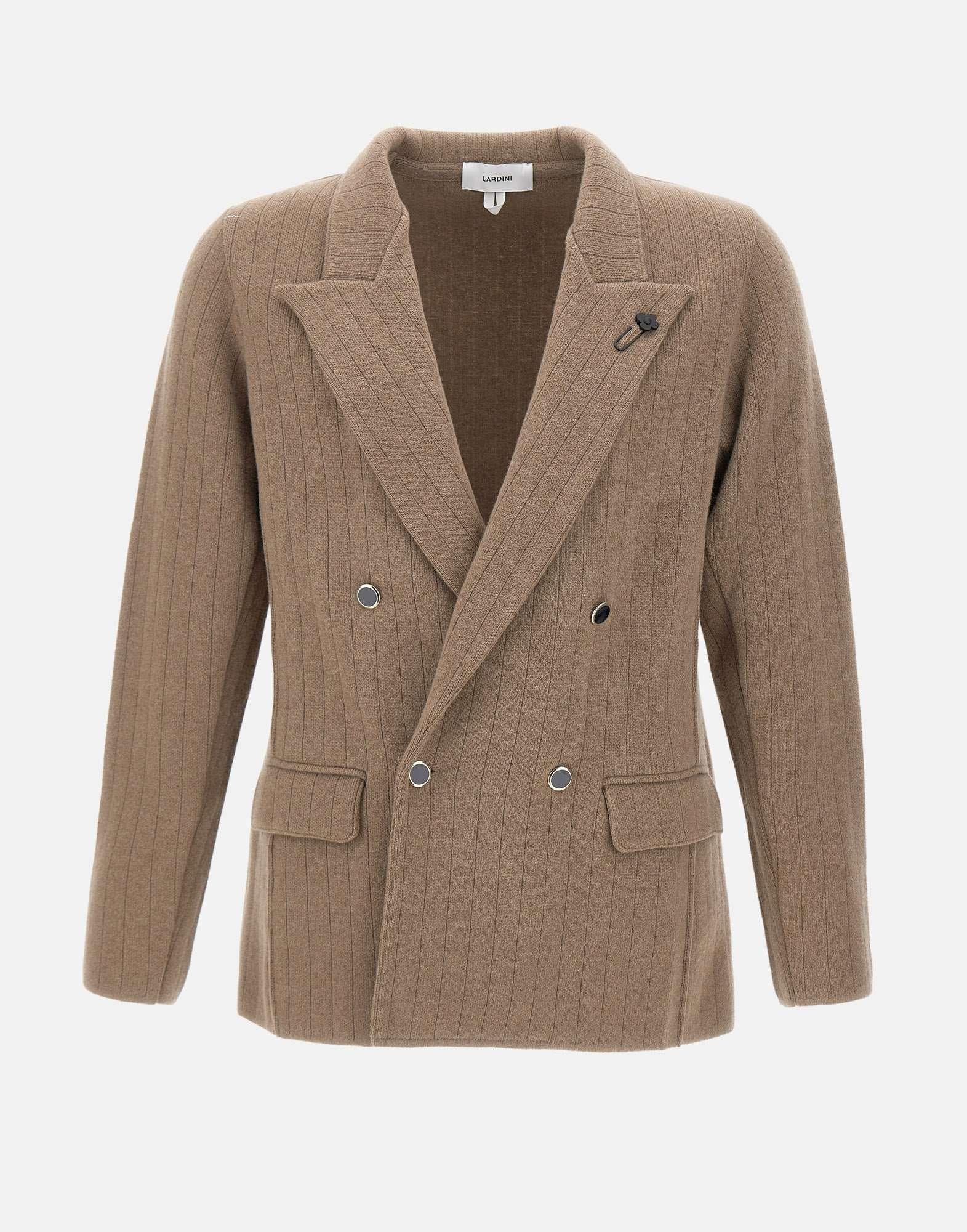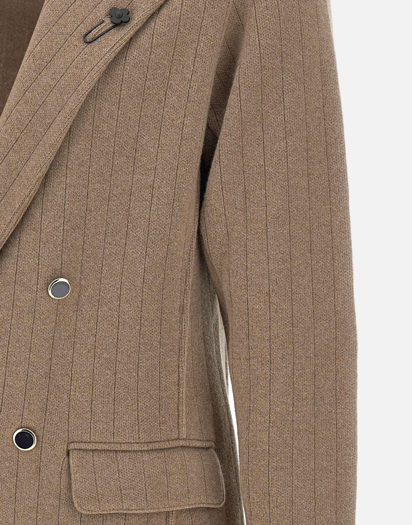 Giacca Lardini da uomo realizzata in un pregiato mix di lana e cashmere, dal colore tortora e con trama a coste che ne esalta la profondità materica. Il design doppiopetto con bottoni gioiello e rever a lancia dona uneleganza senza tempo, completata dalliconica spilletta del brand. Presenta tasche anteriori con pattina, spacchi laterali e una vestibilità regular fit, per un look raffinato e contemporaneo.