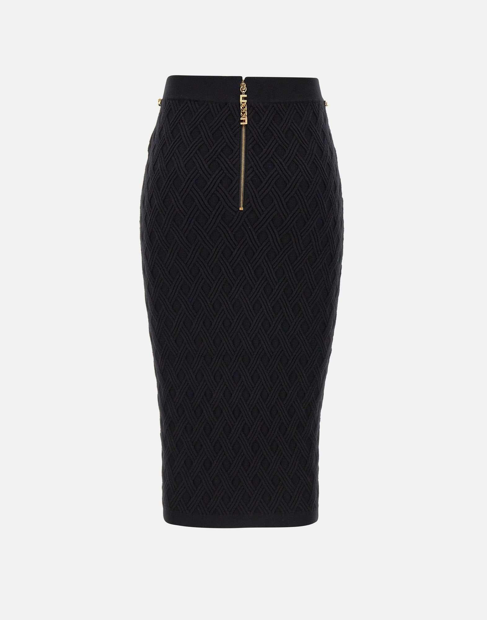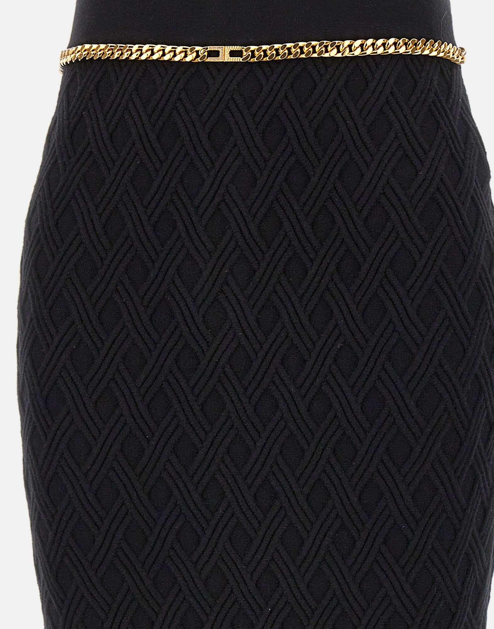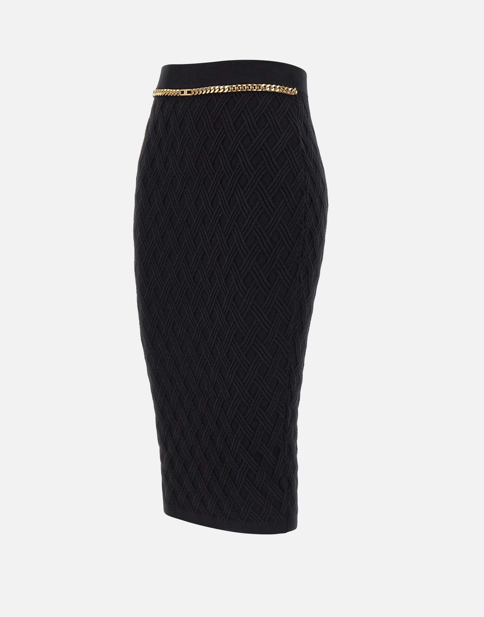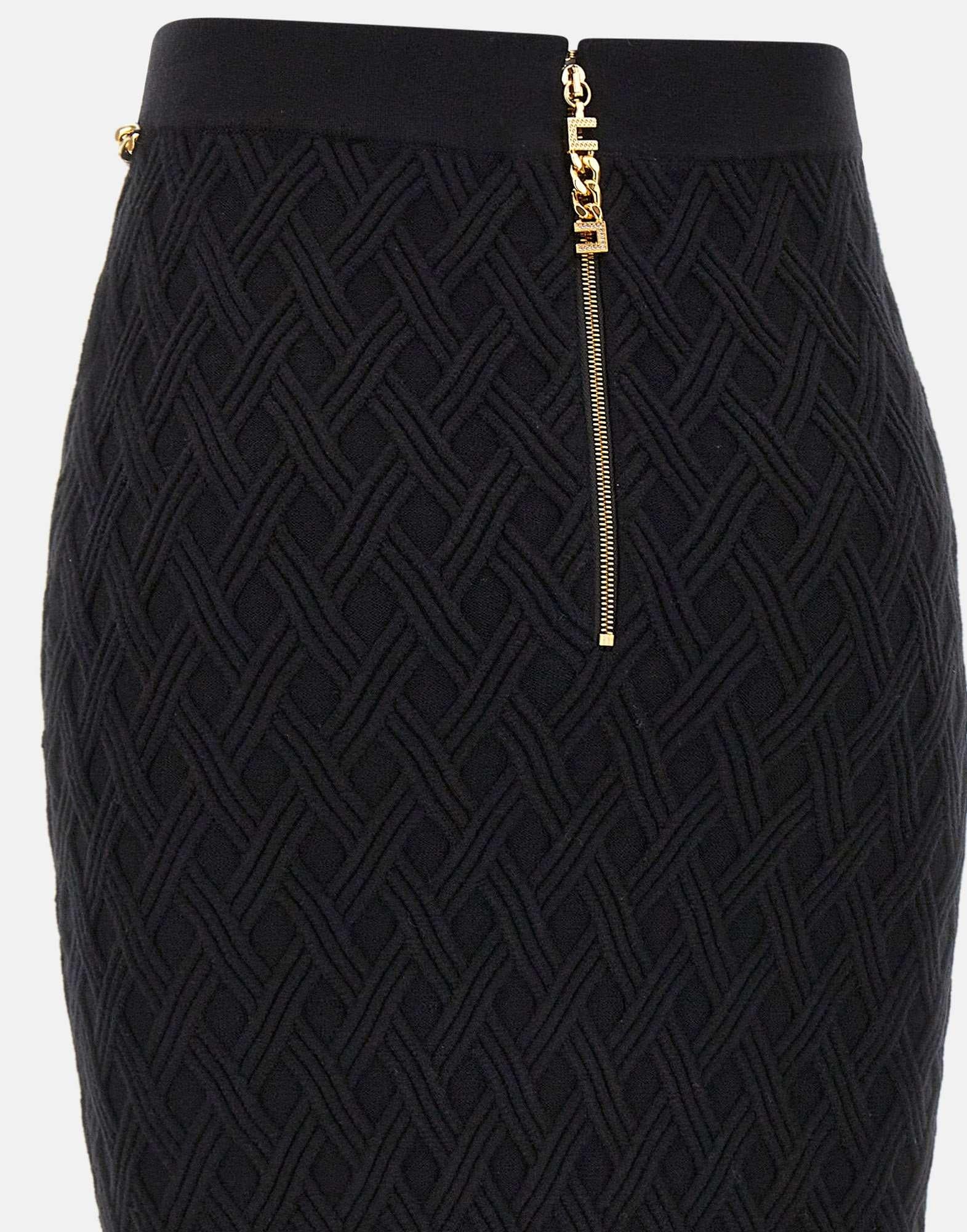 Gonna Elisabetta Franchi "Daily" in maglia misto viscosa nera, caratterizzata da lavorazione 3D a rombi che avvolge la silhouette con effetto tubino. Vita alta impreziosita da catena diamantata con logo e strass, che dona luce e raffinatezza. Chiusura con zip posteriore. Lunghezza 70 cm per la taglia 40 IT. Vestibilità slim.