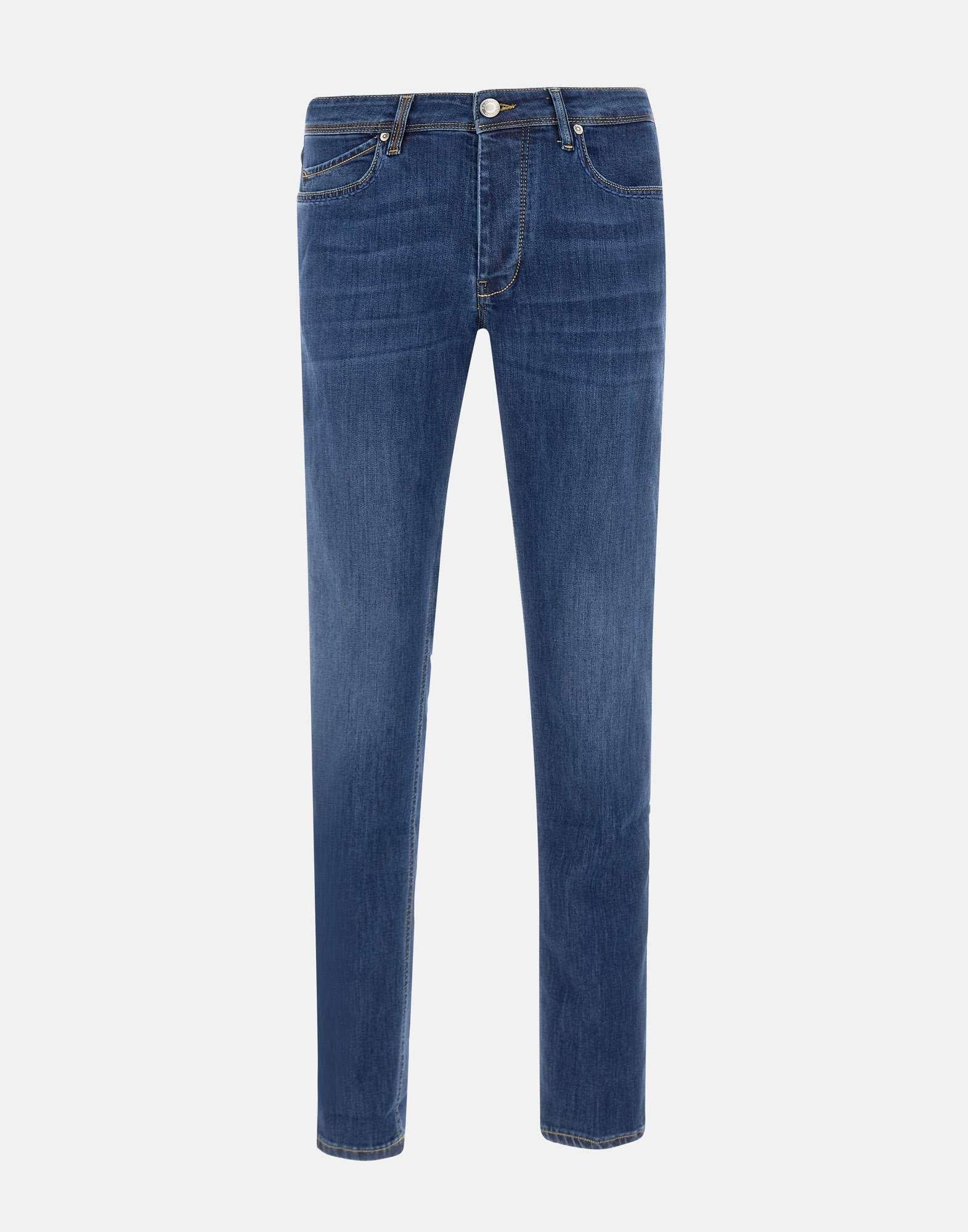 Jeans uomo Re-Hash "Rubens-B", blu denim scuro, profili con effetto washed, vita con passanti per cintura, modello cinque tasche, chiusura con bottone logato silver e zip, patch logo nera in pelle sul retro, slim fit. Made in Italy.