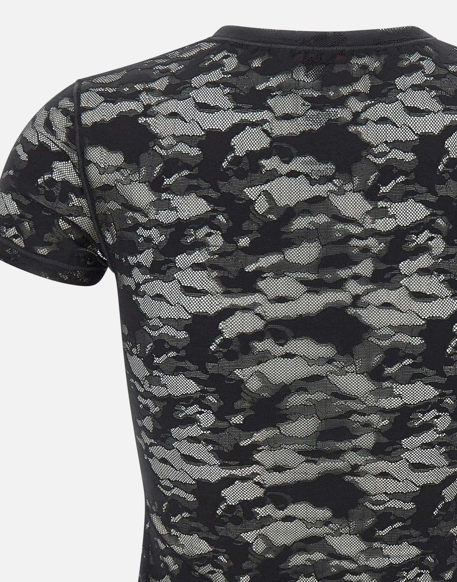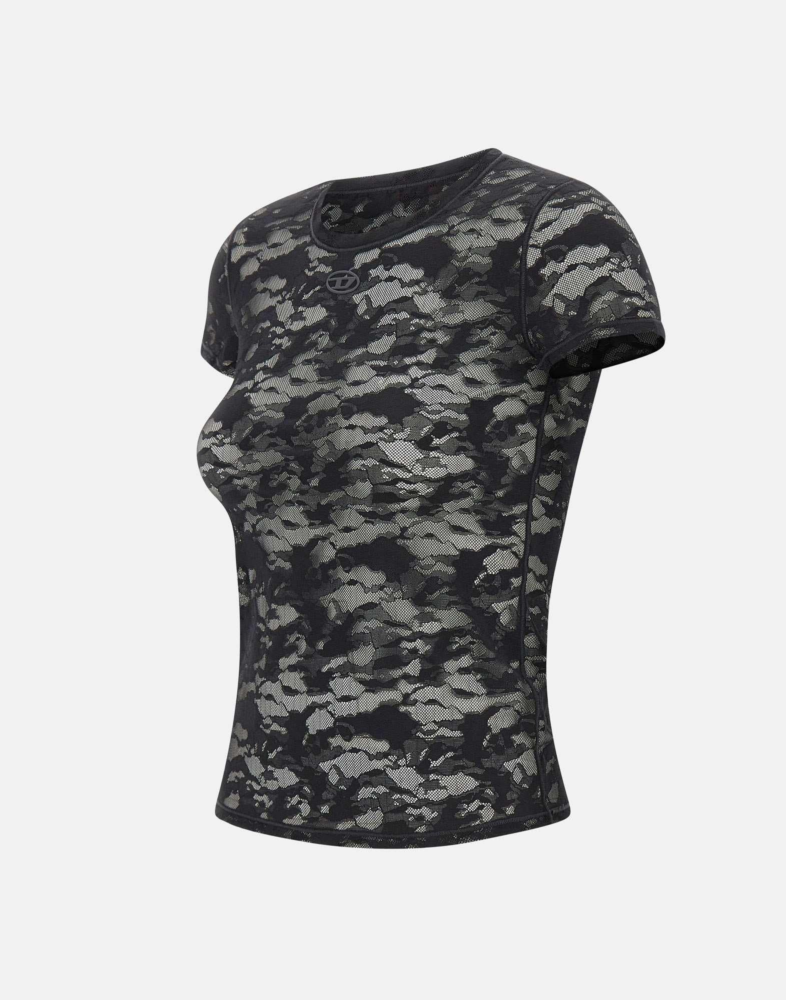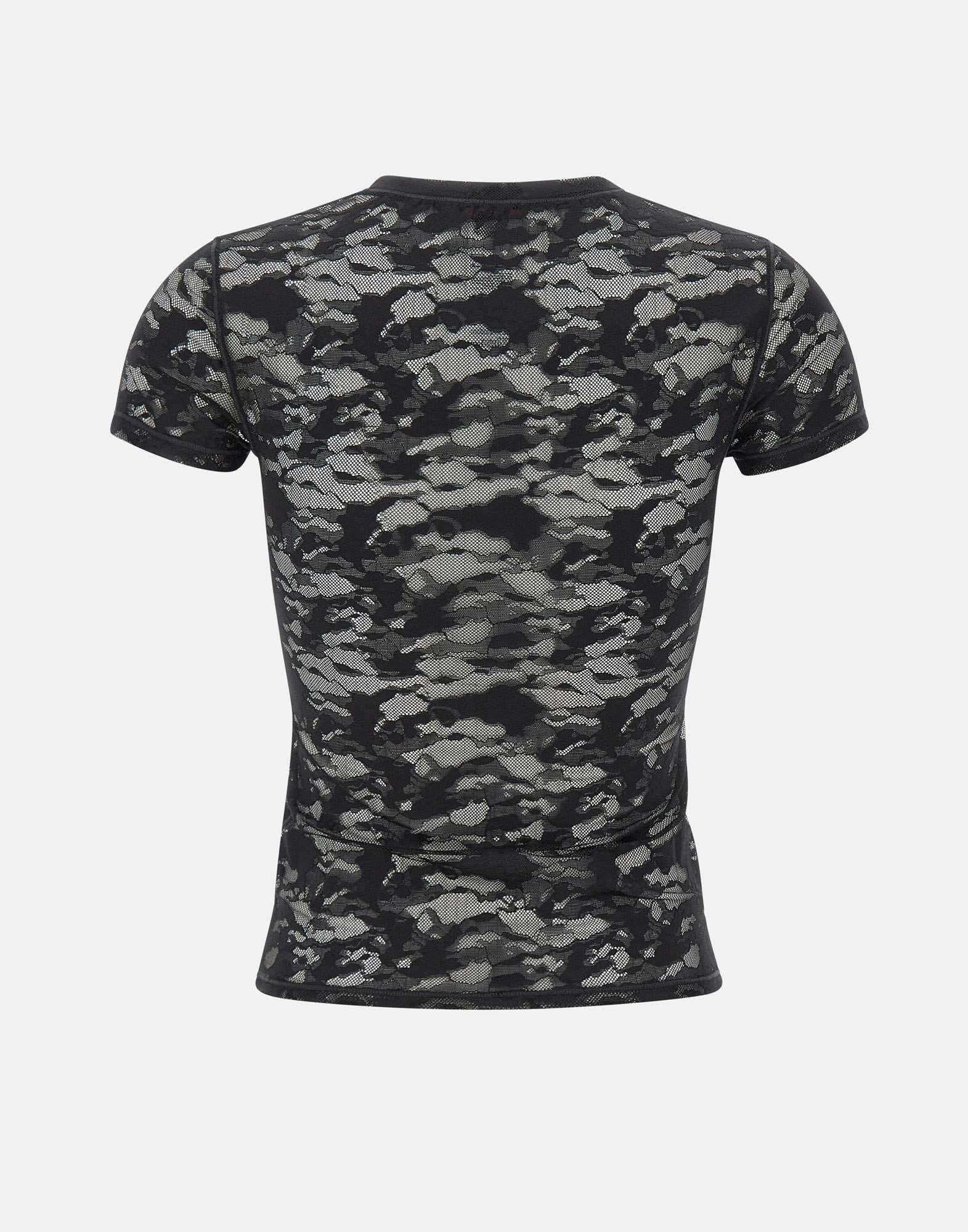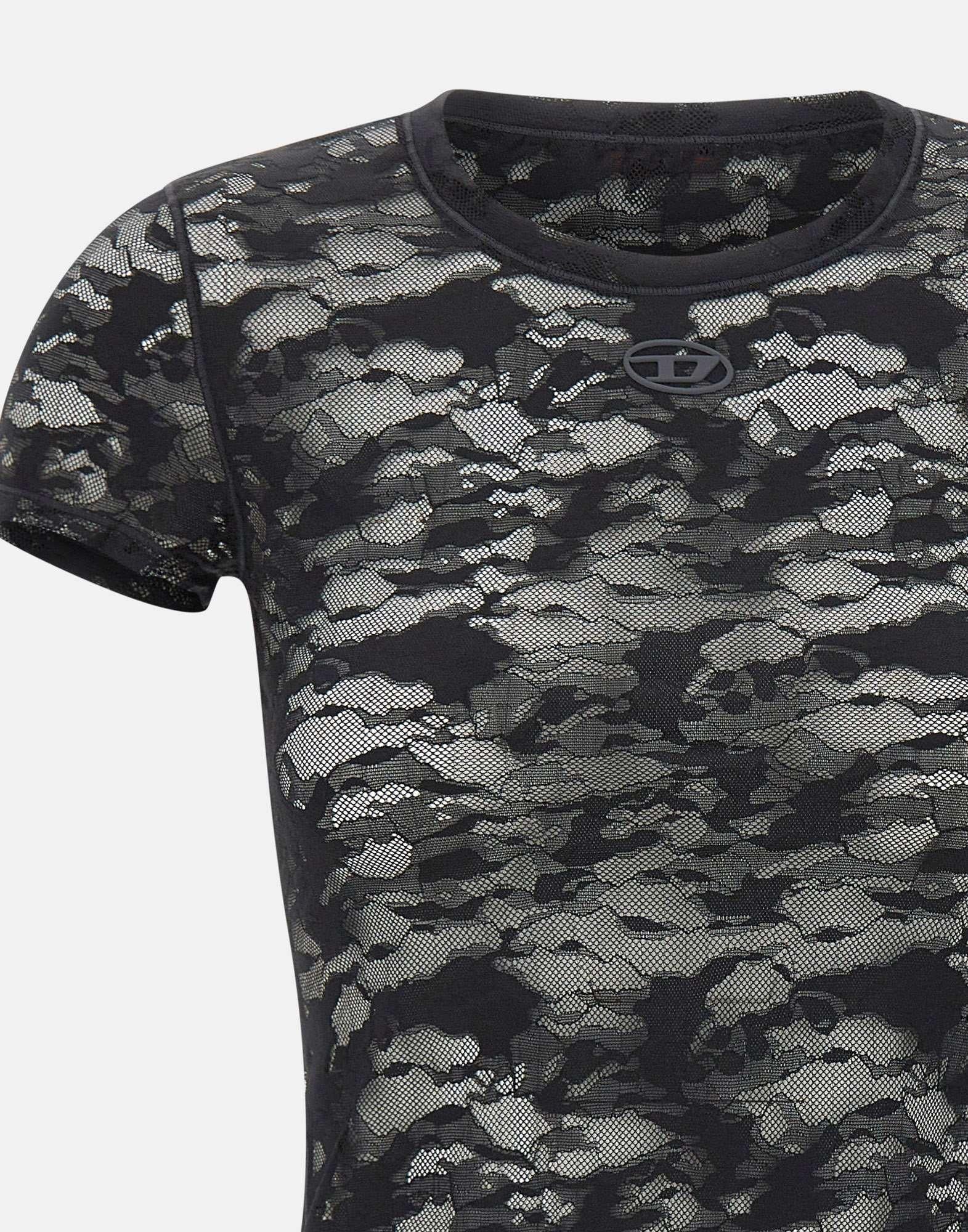 "Kasia-utlt" Diesel, color nero, in morbido pizzo stretch su motivo mimetico e ispirazione utility, logo oval D, manica corta ad aletta, girocollo, regular fit.