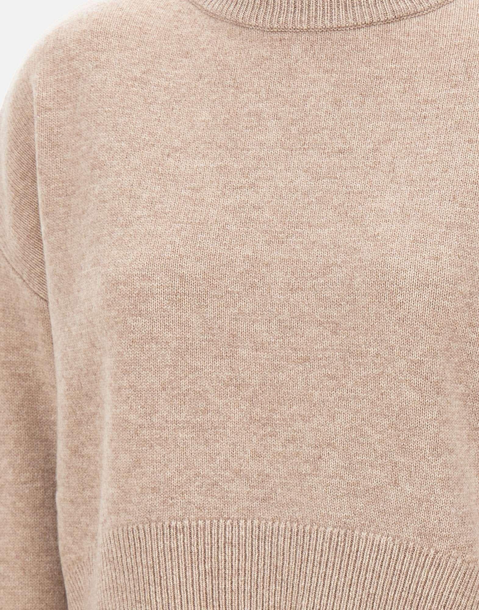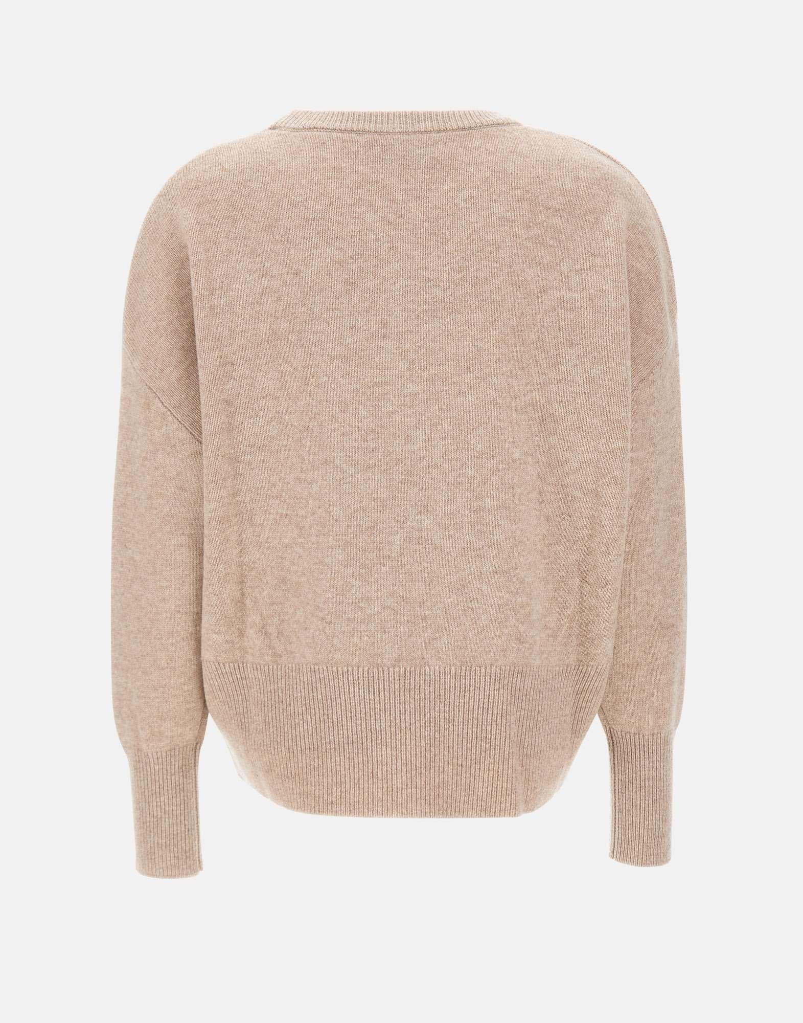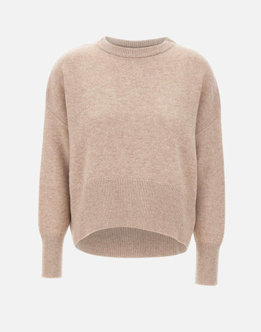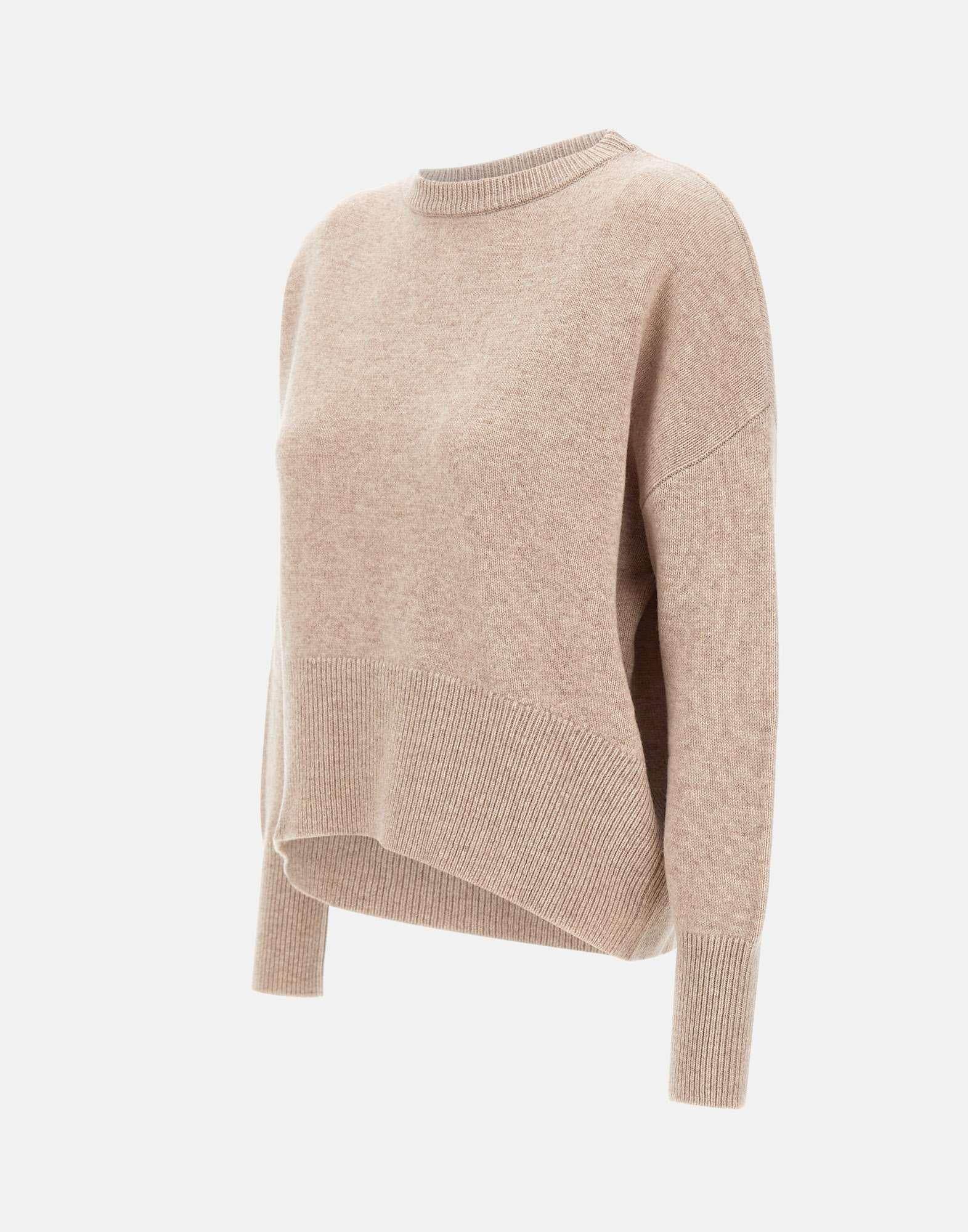 Maglia donna Kaos in lana color beige, caratterizzata da una vestibilità morbida e da un design asimmetrico, corto sul davanti e piu lungo sul retro. Il modello presenta girocollo e profili a costine che definiscono la struttura con un tocco essenziale. Una maglia calda e contemporanea, ideale per look quotidiani dal comfort naturale.