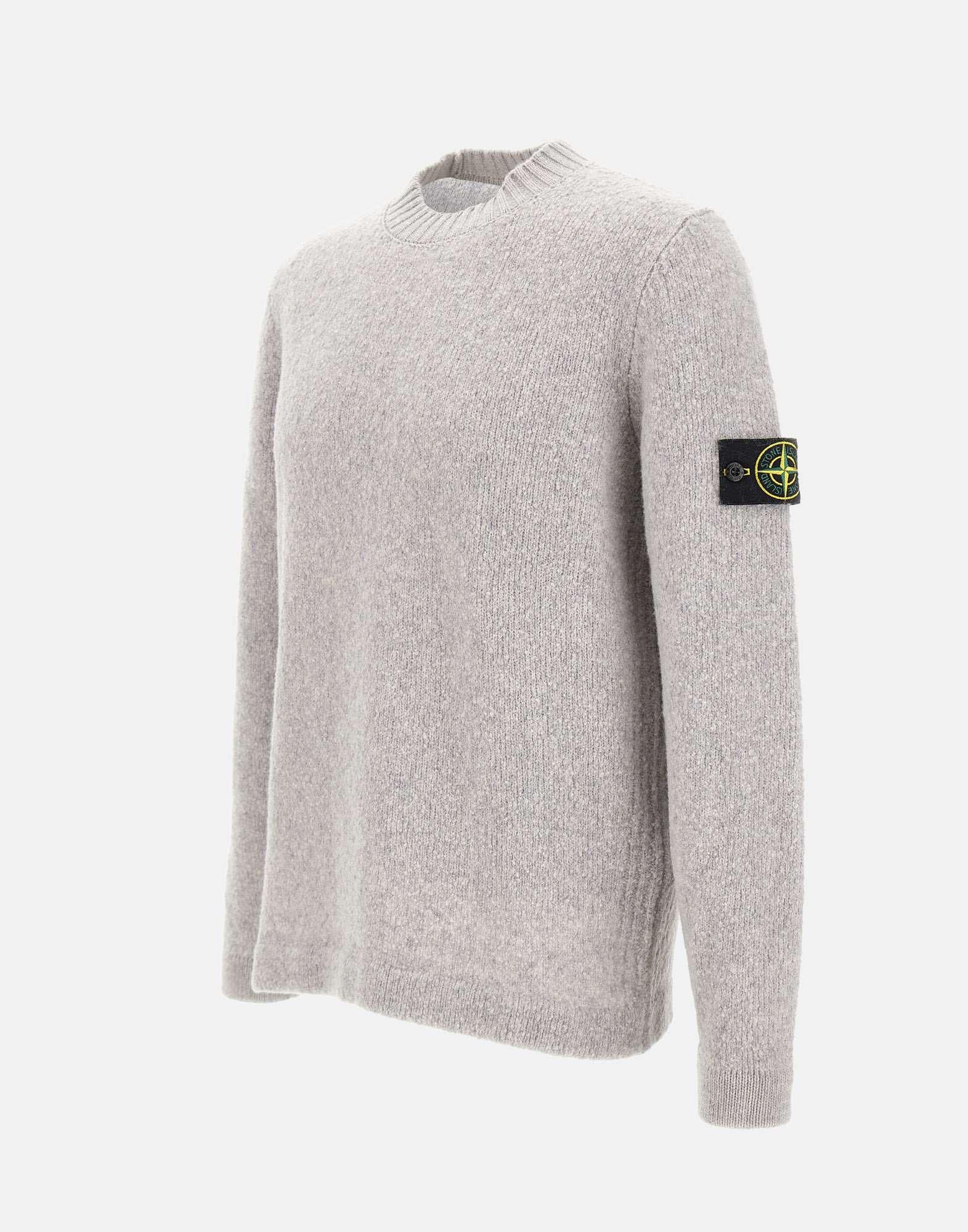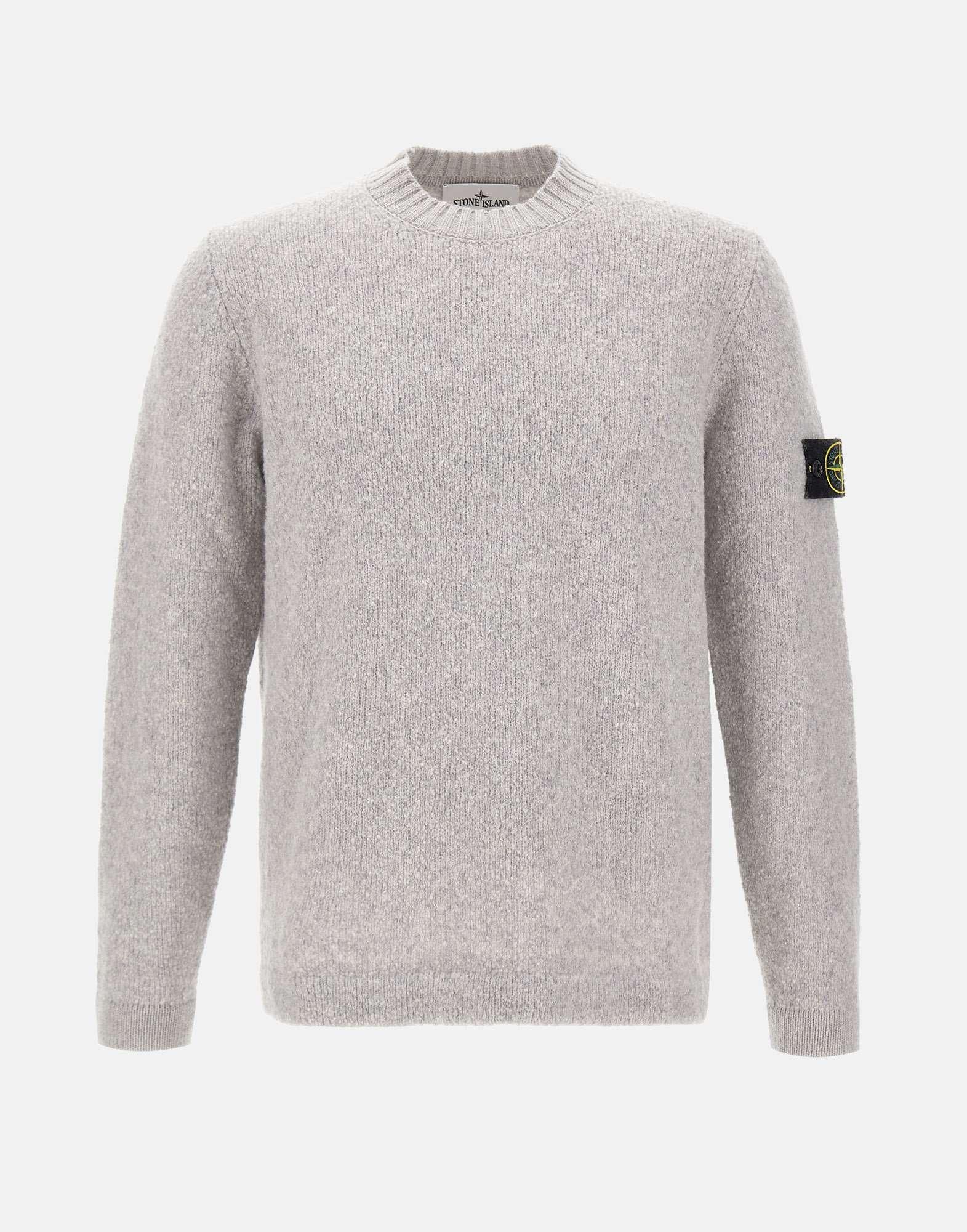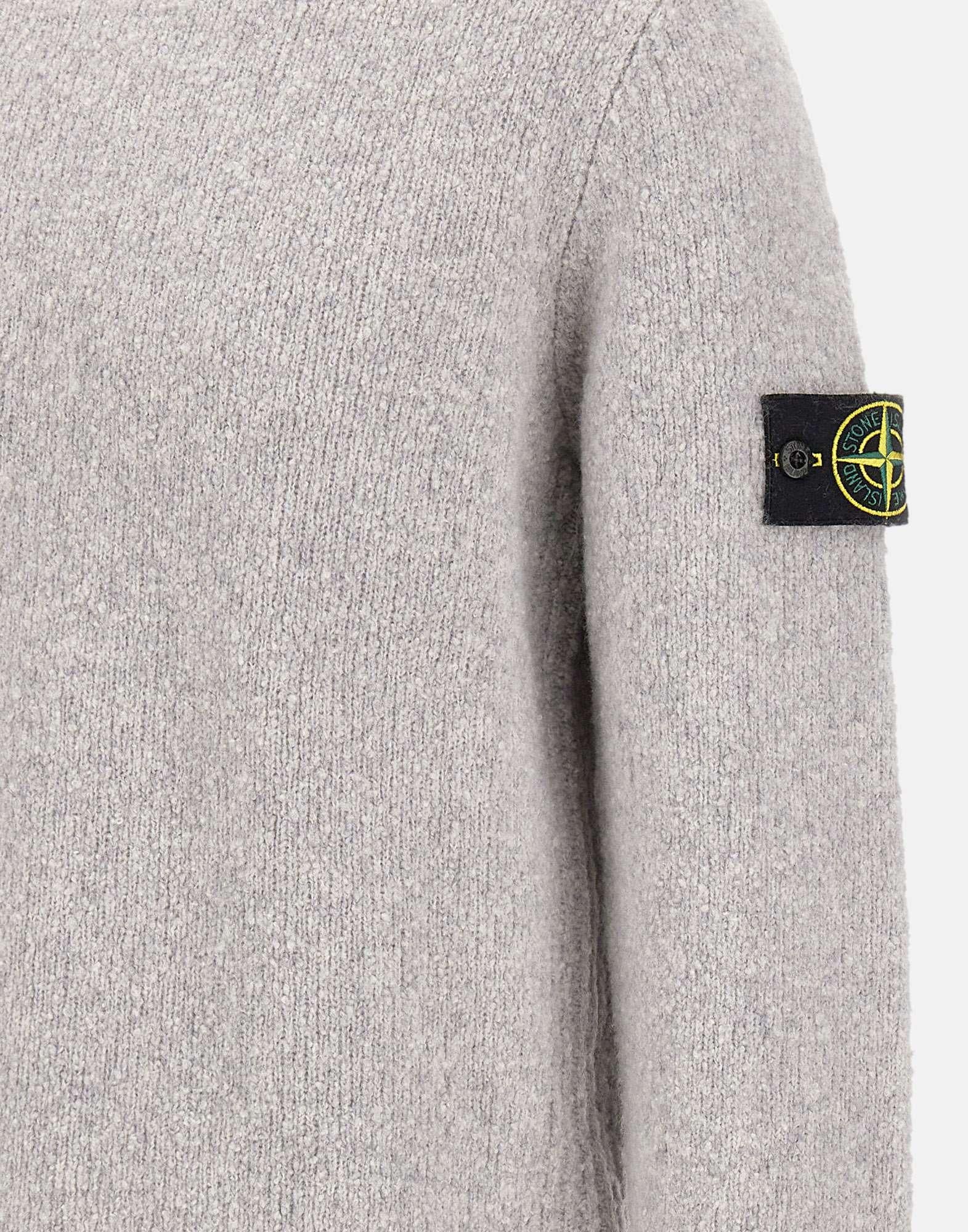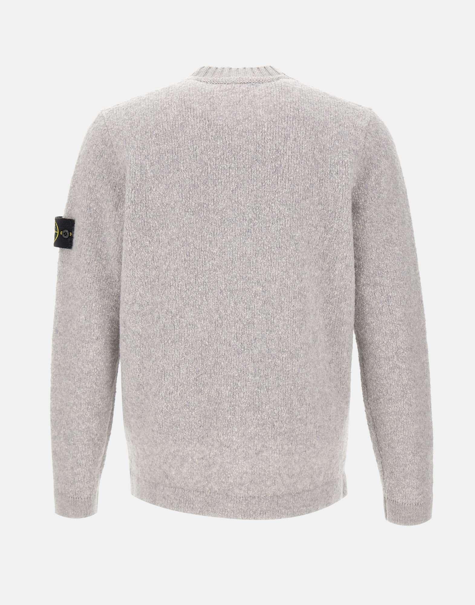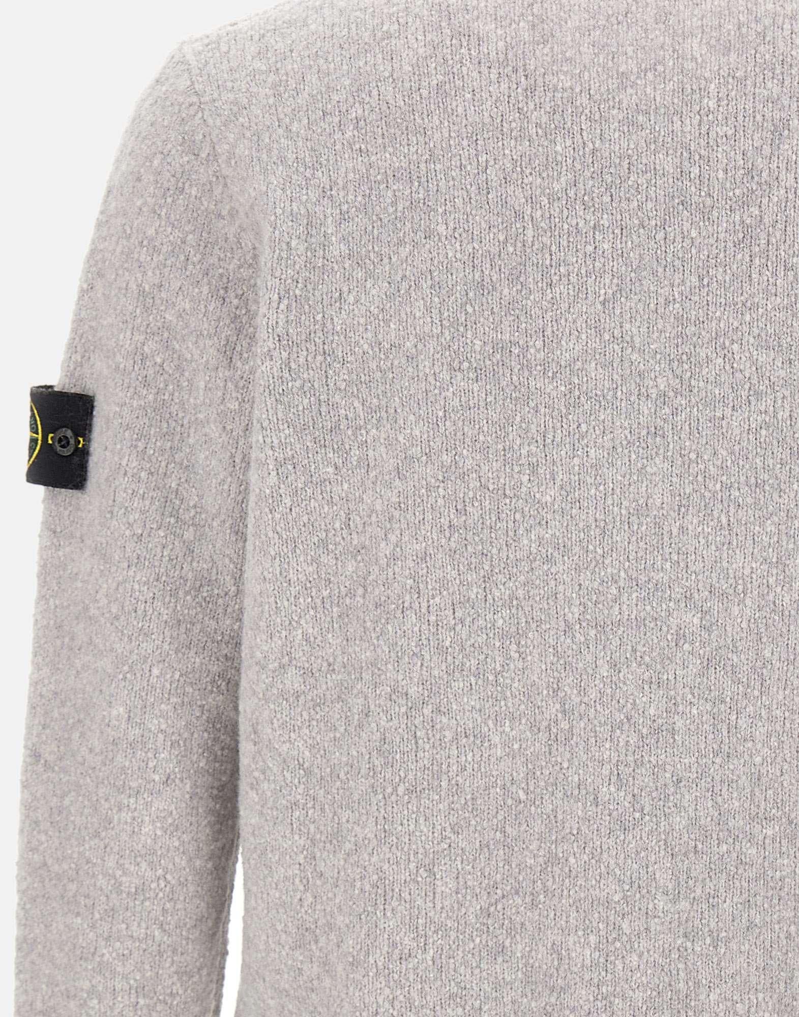 Maglione "Fancy yarn" Stone Island uomo, grigio, misto lana e nylon con texture garzata, maglia rasata finezza 5, maniche lunghe, girocollo, fascia a costine sui lati, badge Stone Island sulla manica sinistra. Vestibilità regolare. Lavare a mano.