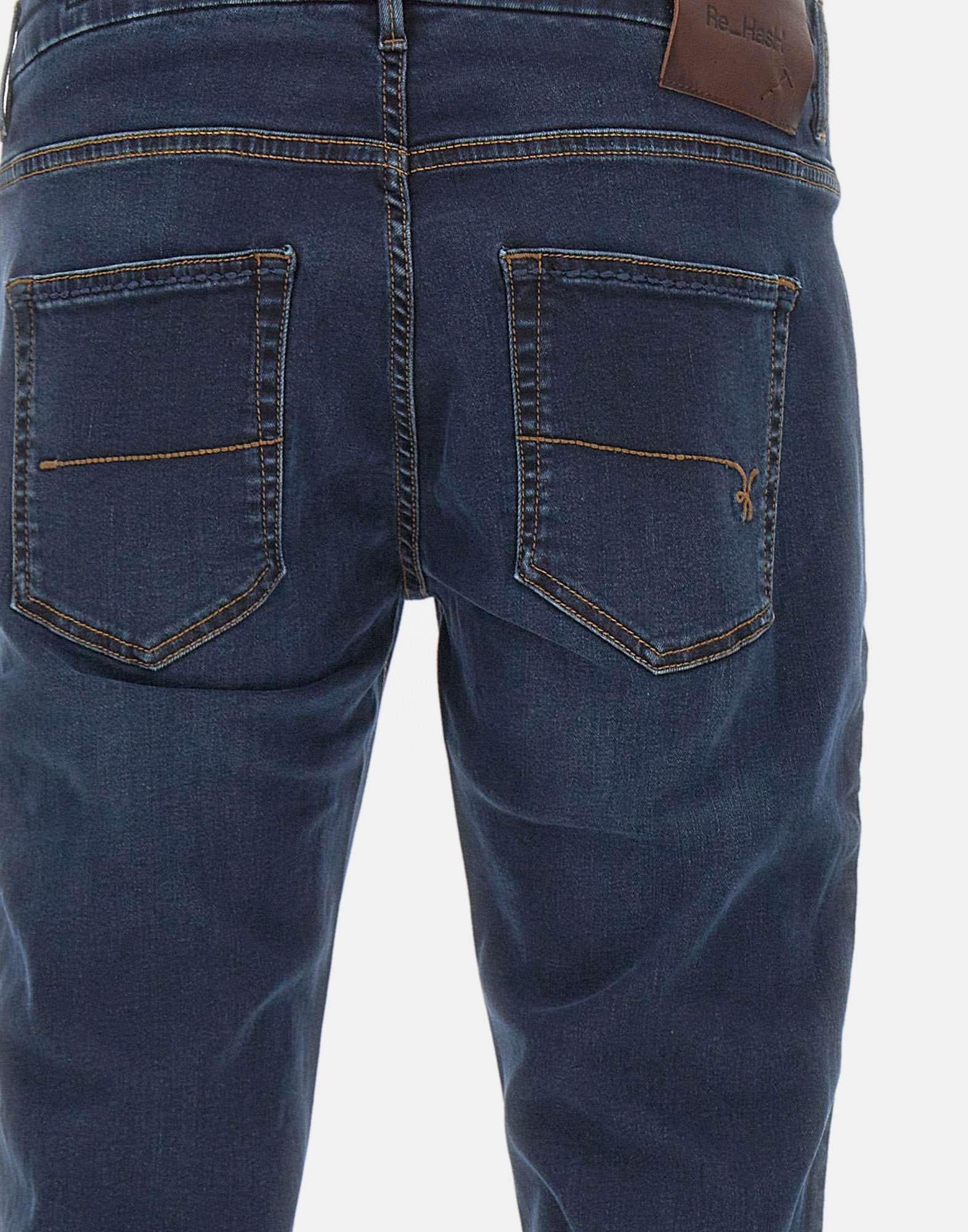 Jeans Re-Hash "Mariotto" in denim di cotone stretch blu nero, caratterizzati da una mano soft touch che garantisce comfort e vestibilità perfetta. Presentano cinque tasche, chiusura con zip e bottone logato, passanti per cintura e impunture a contrasto che ne esaltano il taglio sartoriale. Fondo 17 cm, interno gamba 80 cm (taglia 33). Un modello dal look pulito e contemporaneo. Slim fit. Made in Italy.