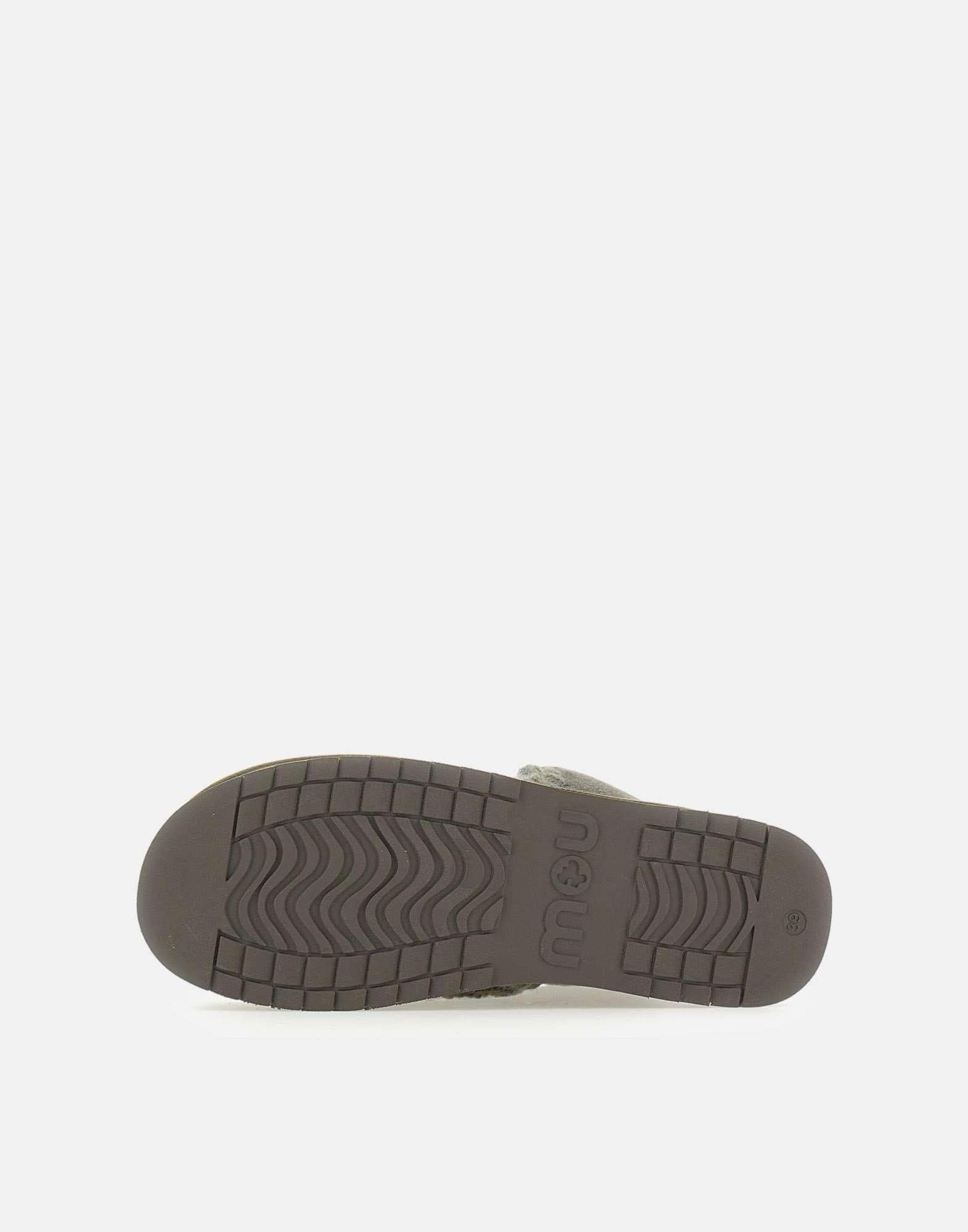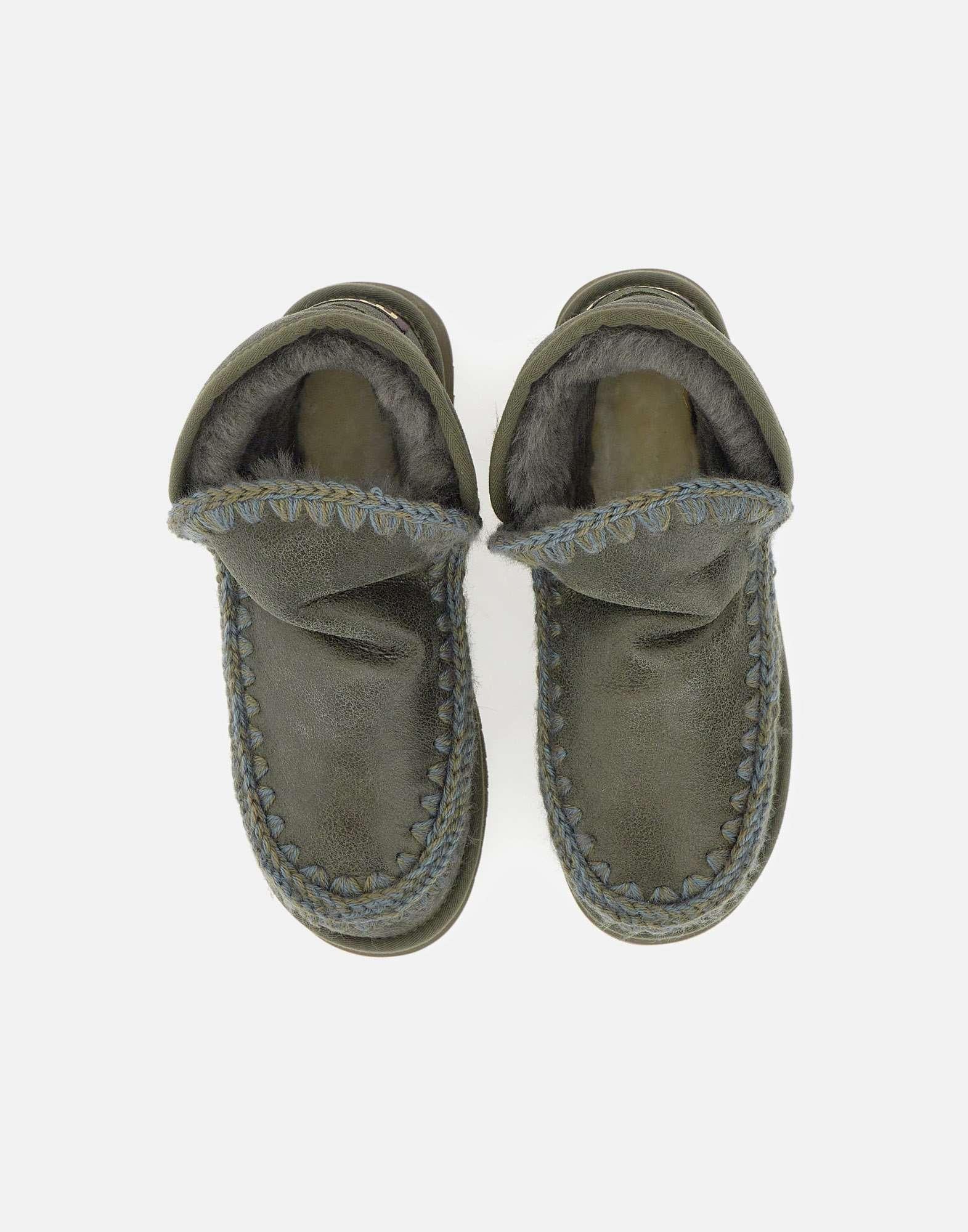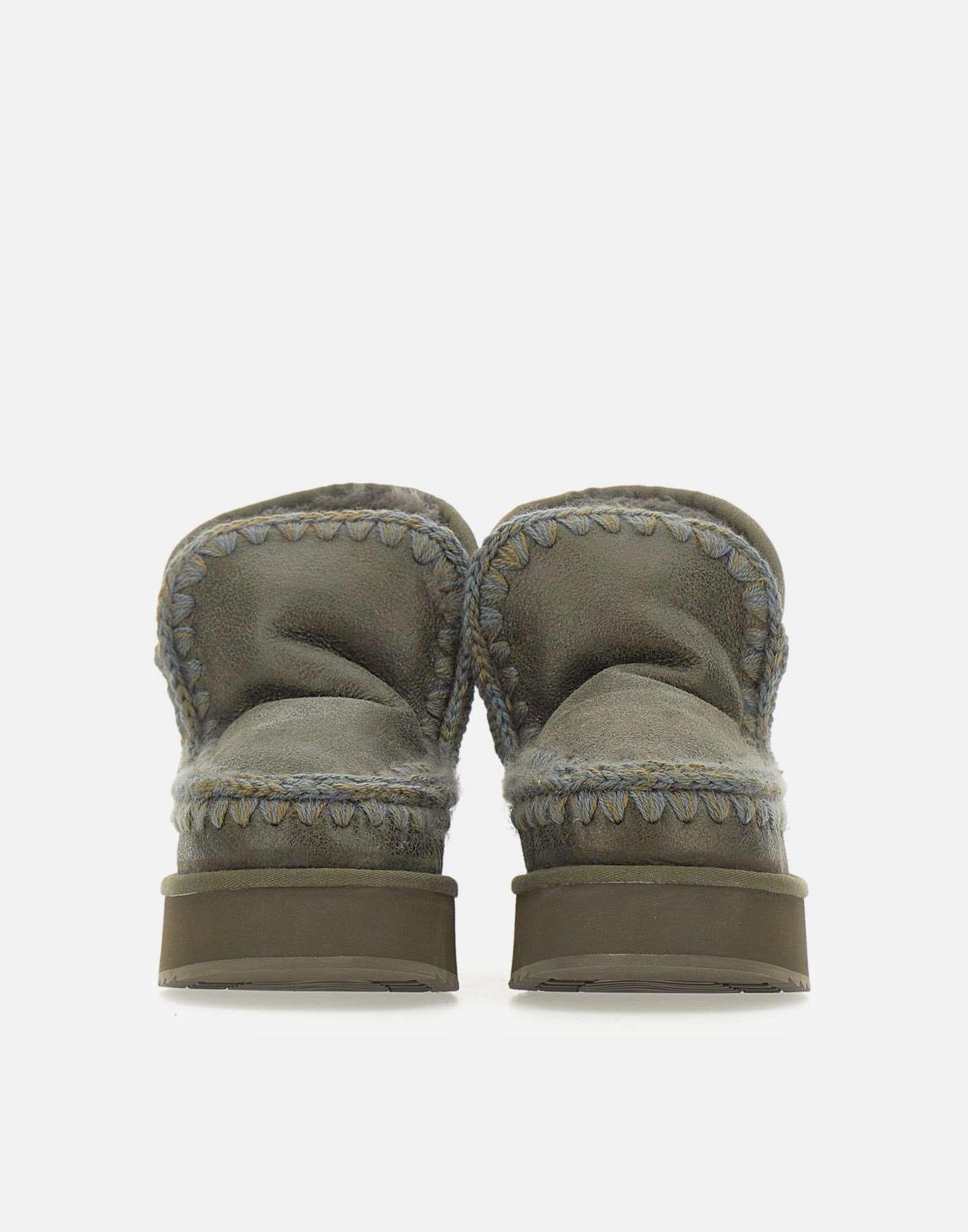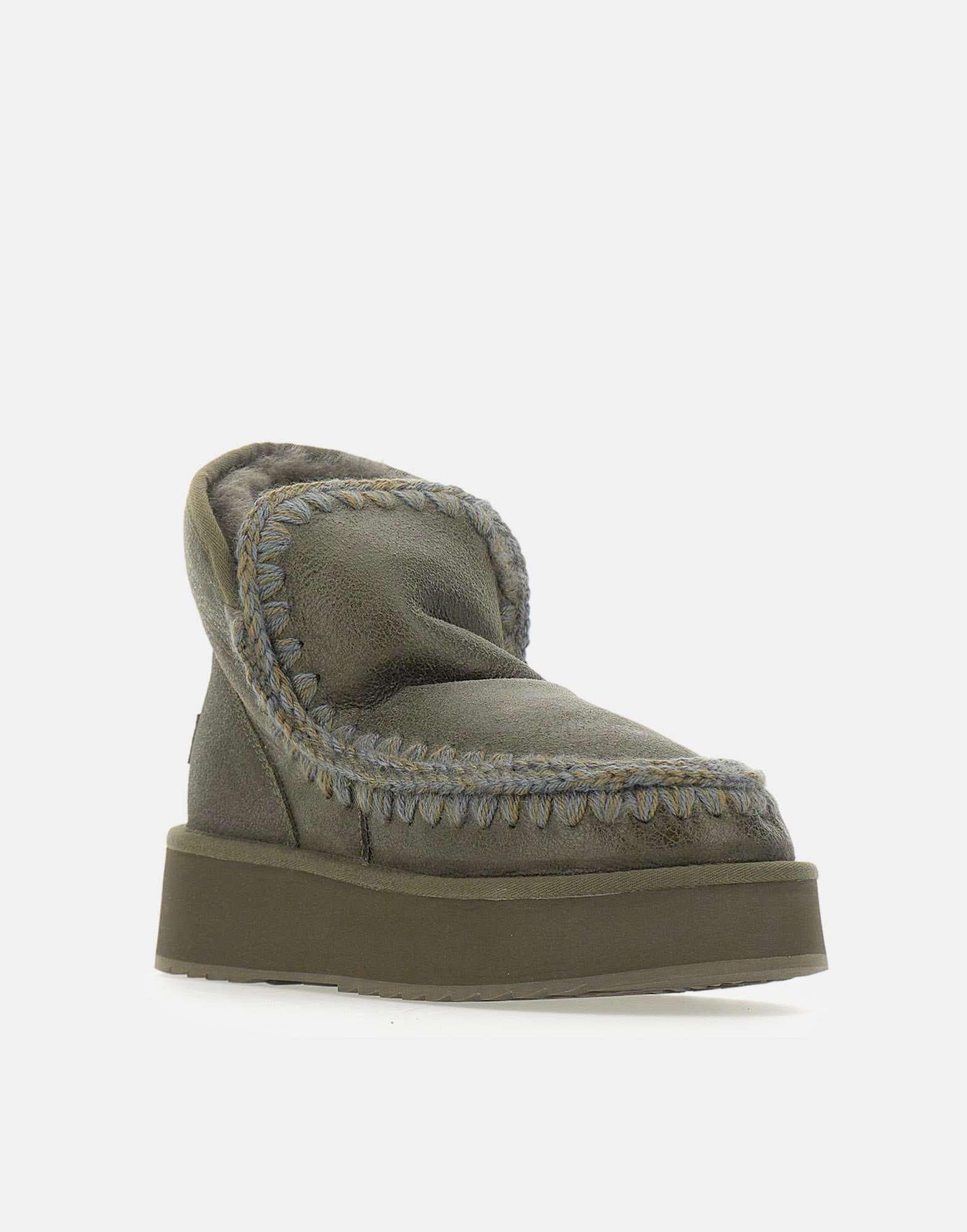 Stivaletti Mou "Mini Eskimo Platform Boot" in pelle scamosciata verde bosco e montone double-face, realizzati artigianalmente con le iconiche cuciture in lana alluncinetto tipiche del brand. Morbidi, caldi e resistenti, sono dotati di suola platform in gomma EVA che garantisce leggerezza e comfort prolungato. Altezza 18 cm, perfetti per un look cozy e contemporaneo. Calzata regolare.