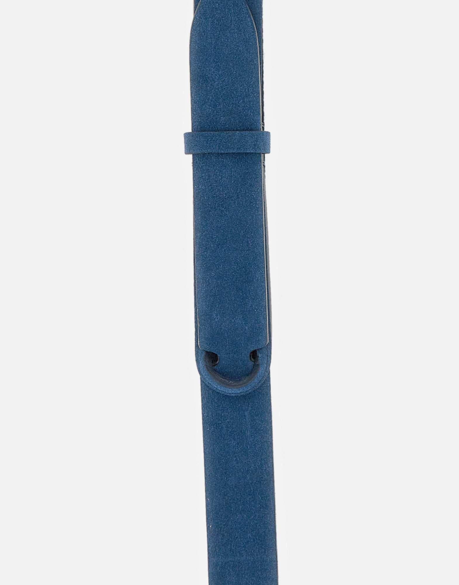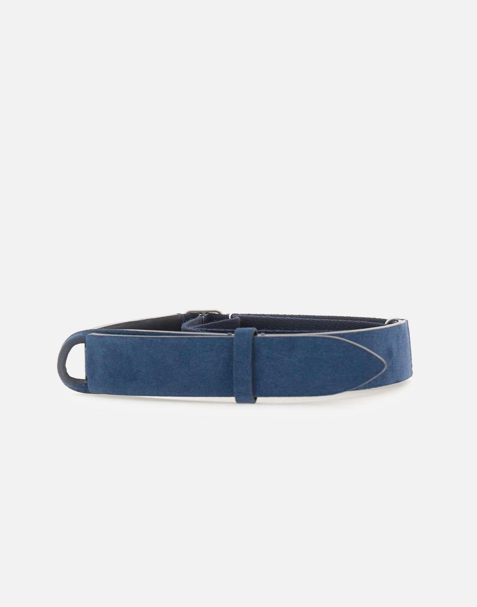 Cintura Orciani "Nobuckle" in camoscio e tessuto blu, dal design essenziale e contemporaneo. Priva di fibbia, presenta chiusura con anello scorrevole e finitura opaca nichel free. Taglia unica regolabile, altezza 3 cm, perfetta per completare look casual con un tocco sofisticato. Made in Italy.