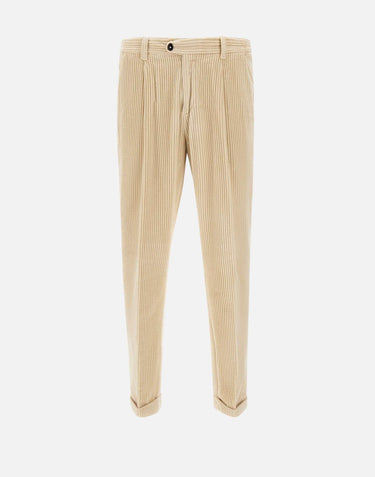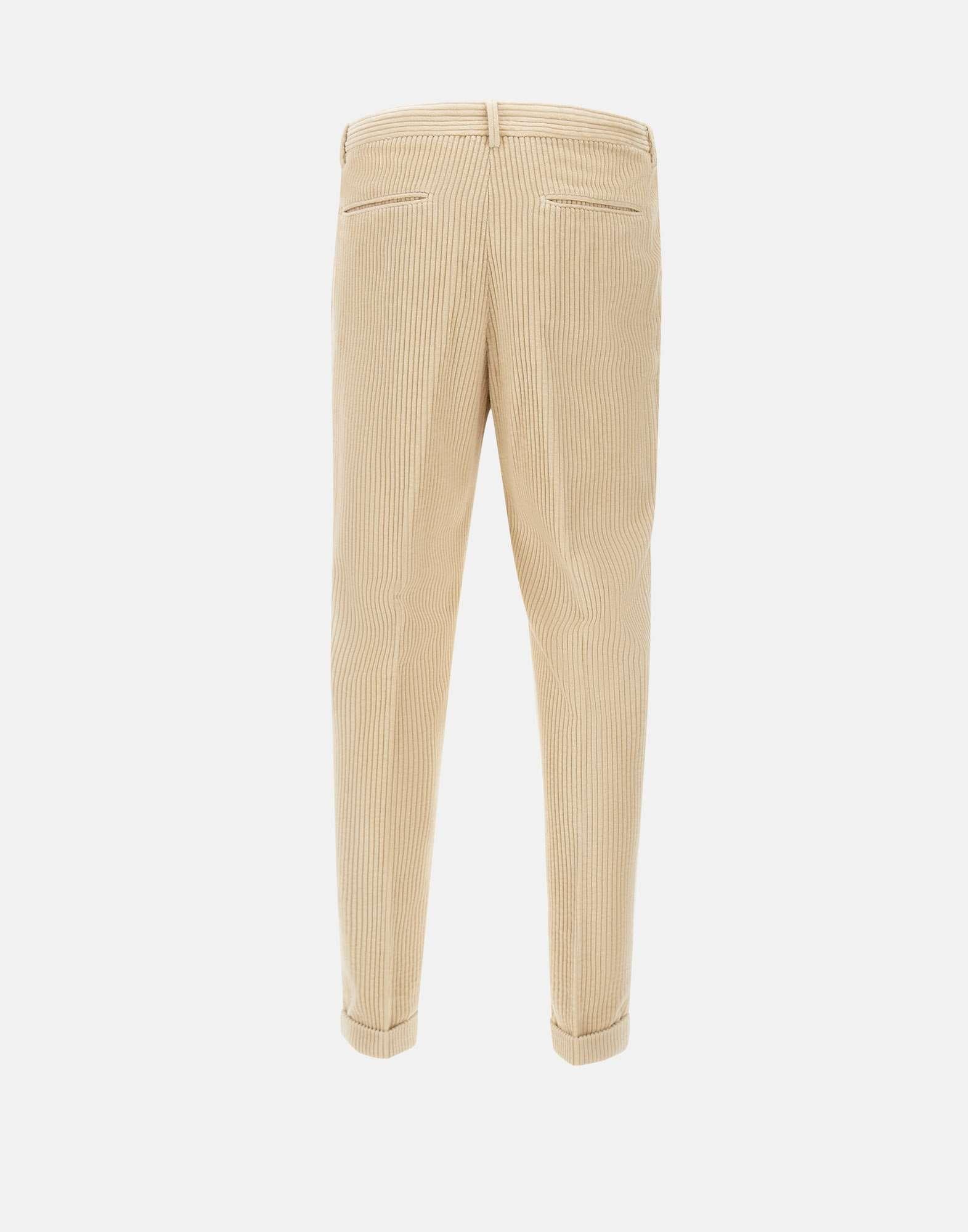Pantalone uomo Devore Incipit in cotone color panna a maxi costine, con raffinato effetto velluto. Il modello presenta chiusura con zip nascosta e bottone, tasche anteriori nascoste e tasche posteriori a filetto. La vestibilità regolare assicura comfort, mentre il risvolto sull'orlo di 3 cm aggiunge un tocco contemporaneo. Perfetto per look eleganti e versatili. Ampiezza fondo: 17cm. Made in Italy.