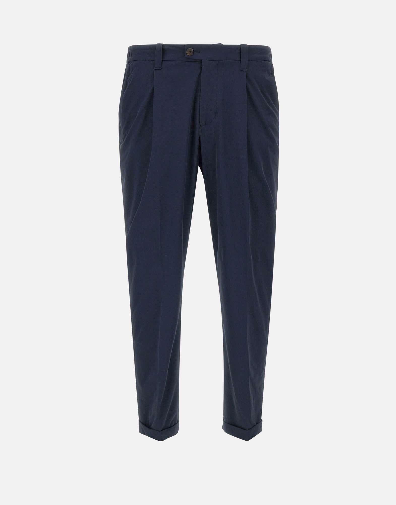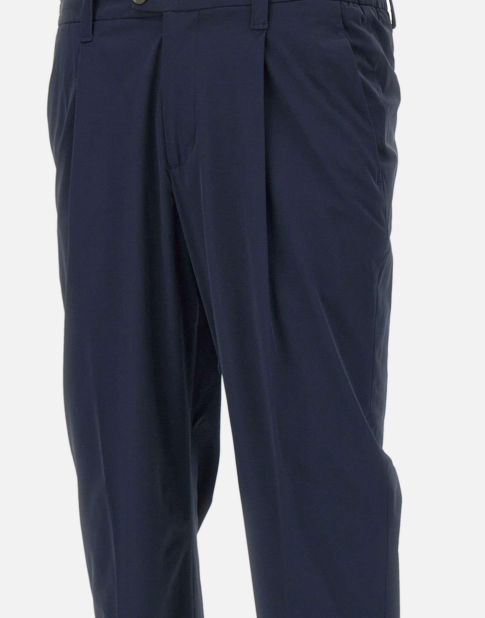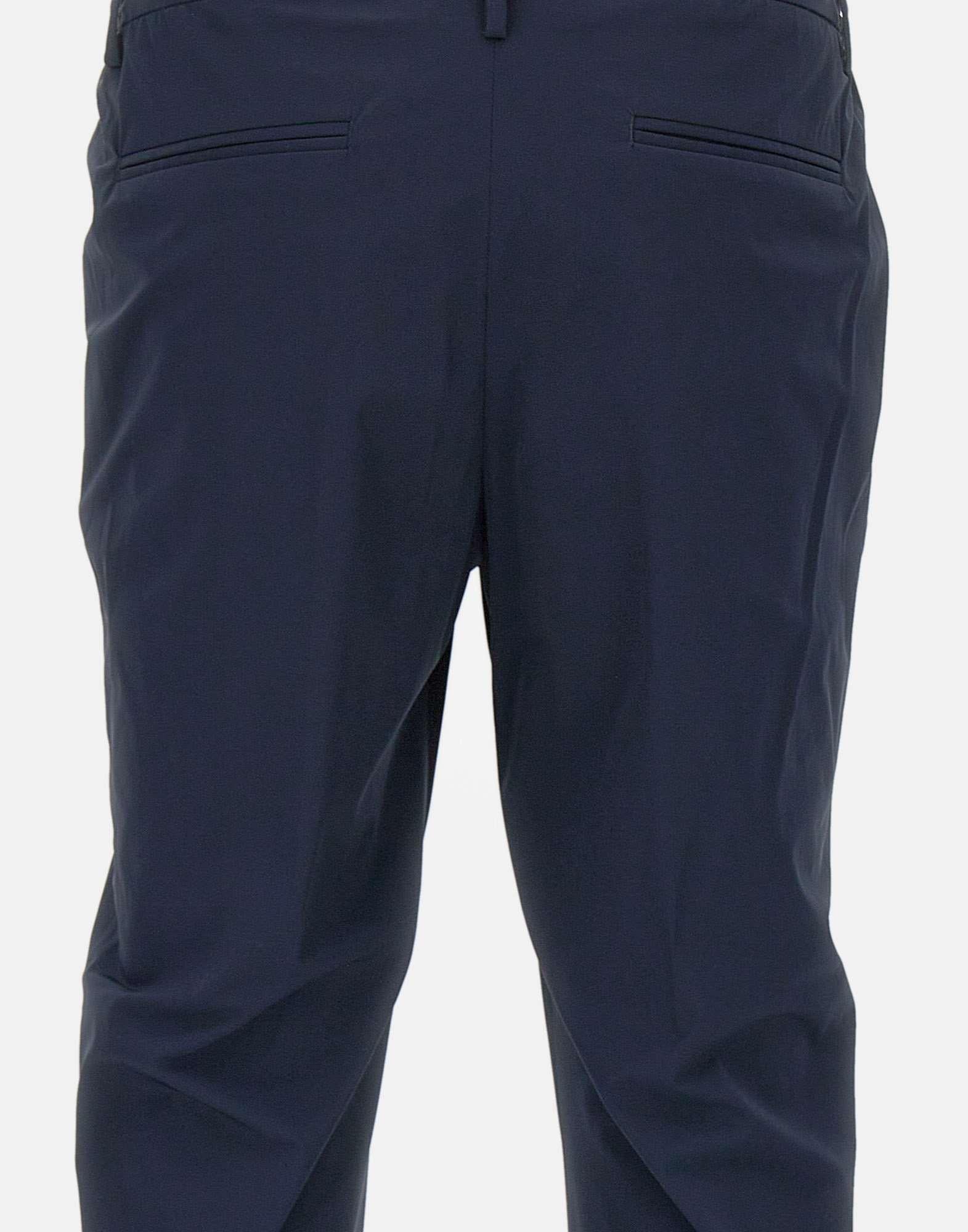 Pantaloni uomo Devore Incipit "DVR47" in tessuto Technical Comfort leggero, resistente e idrorepellente ultra comfort al tatto e all'indosso,colore blu, pince sul davanti, vita parzialmente elasticata con passanti per cintura, chiusura con zip e bottone, gamba dritta con fondo 17cm e risvolto 2,5cm, made in Italy, tapered fit