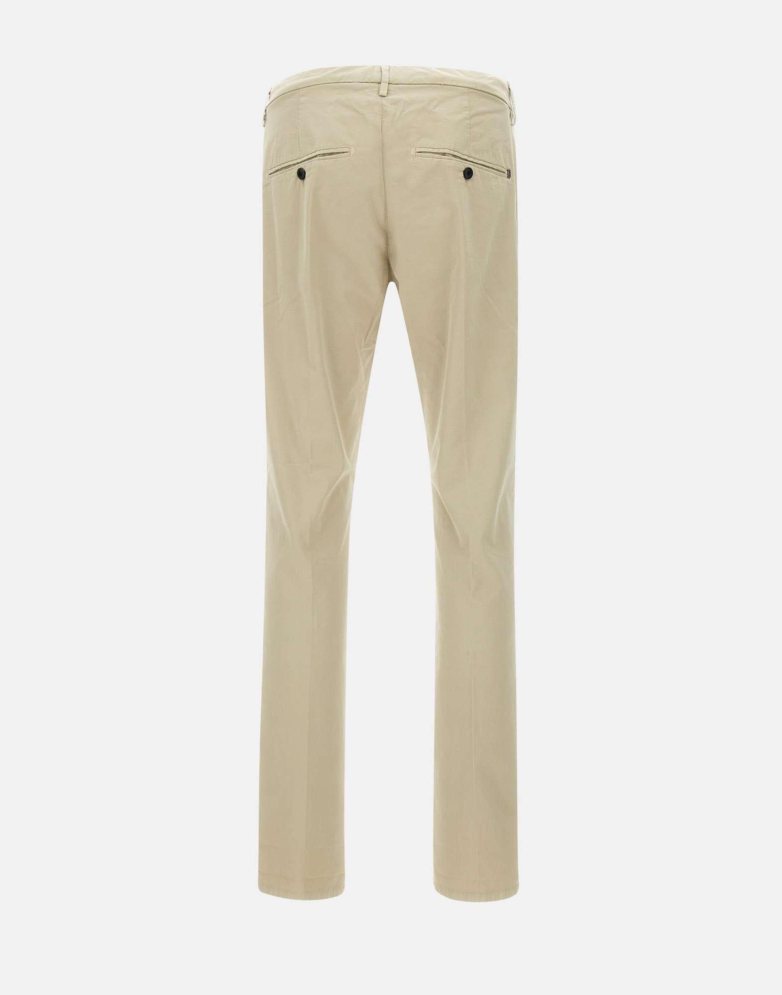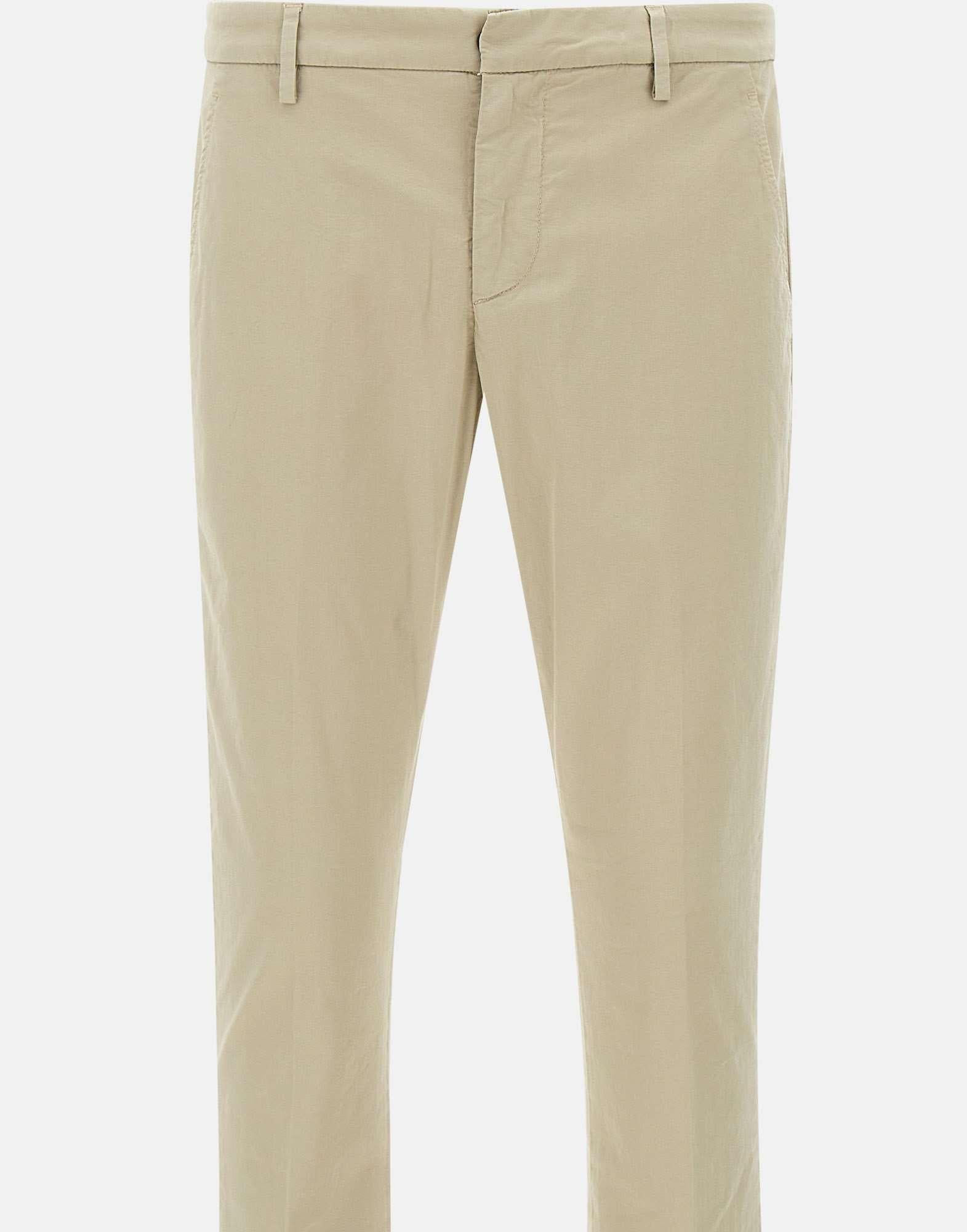 Pantaloni uomo Dondup "Gaubert" in cotone, sabbia, tessuto extra comfort al tatto e all'indosso, chiusura con bottone e zip, vita regolare con passanti per cintura, tasche laterali a filetto, tasche monofiletto sul retro con bottone e mini logo in metallo, slim fit, fondo 17cm, made in Italy