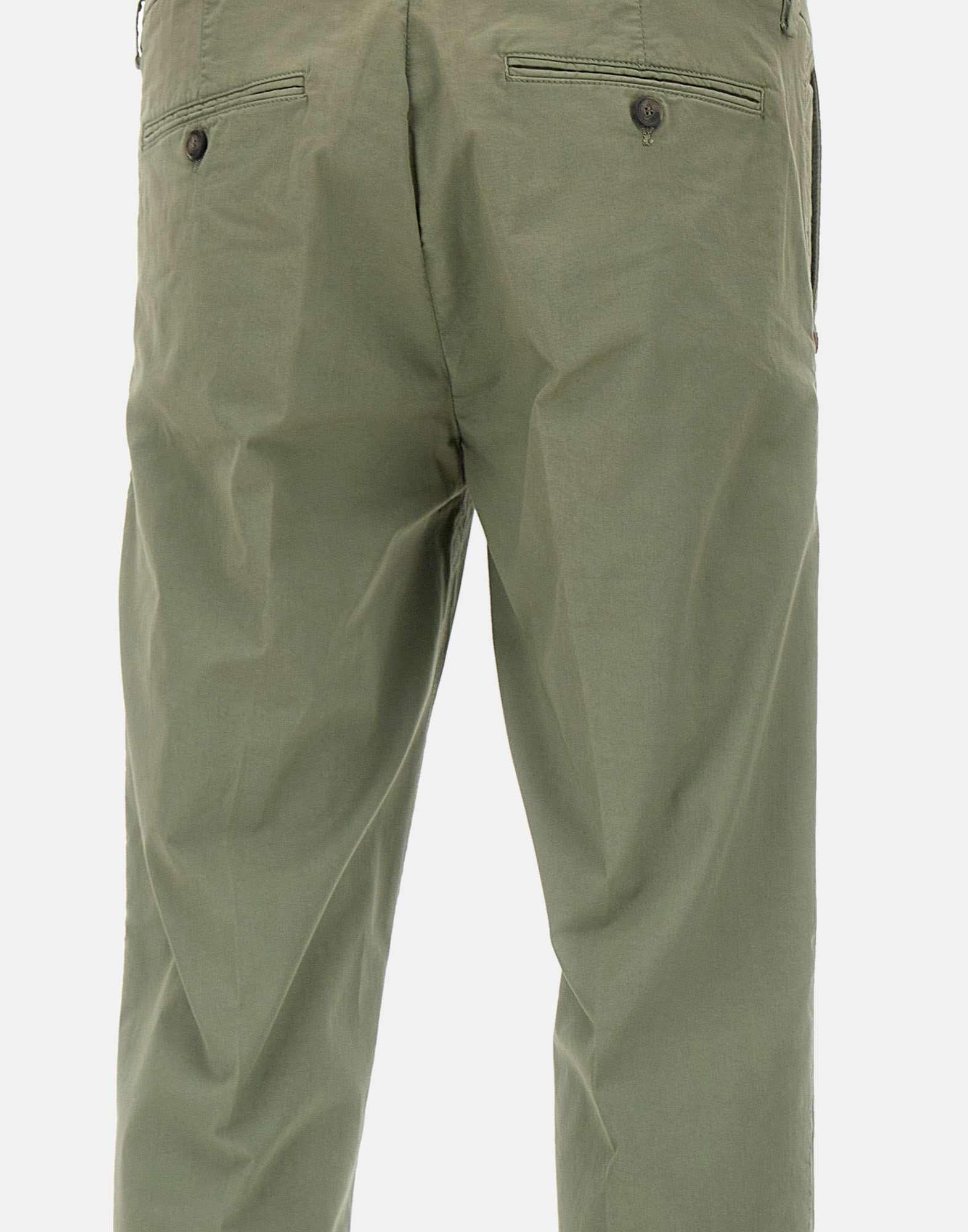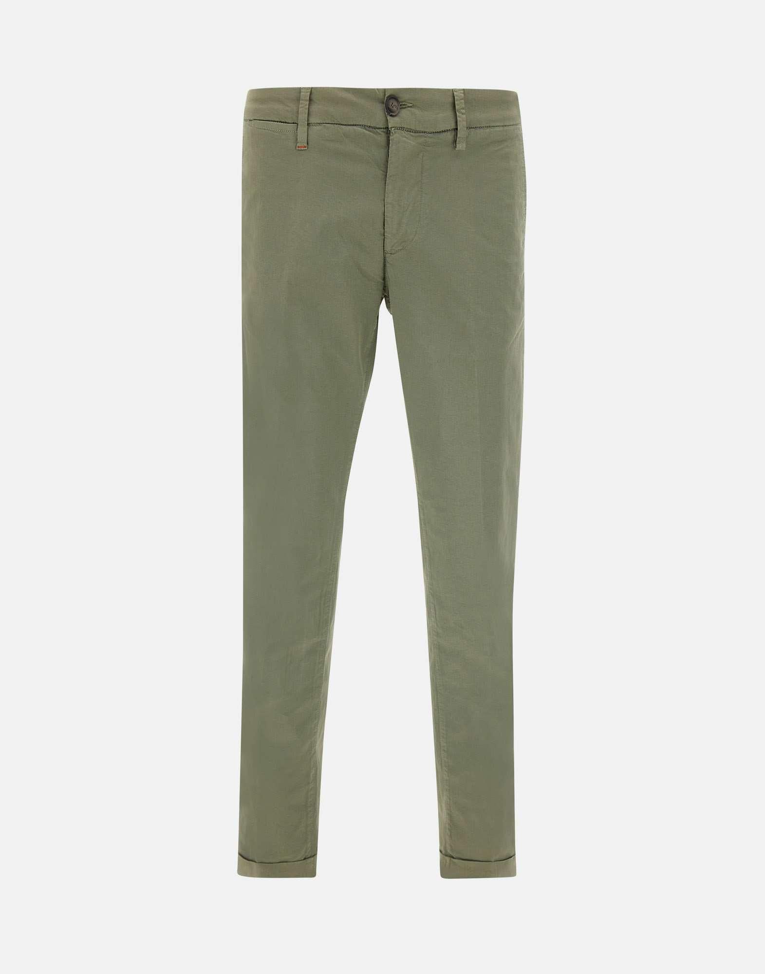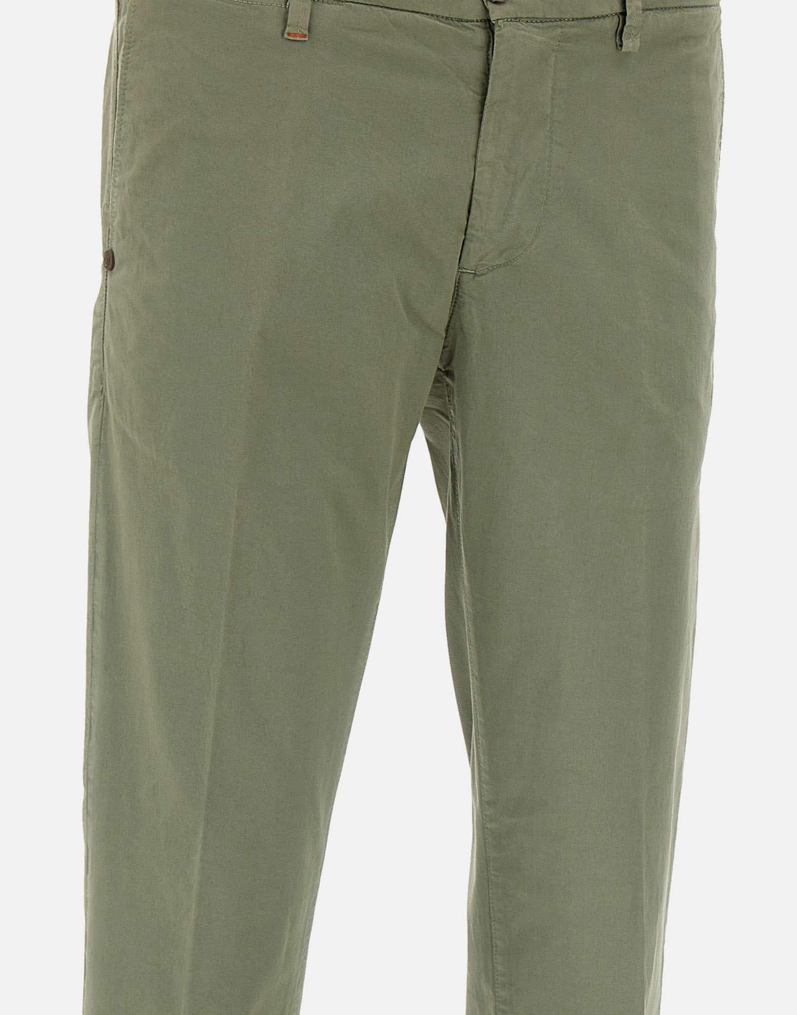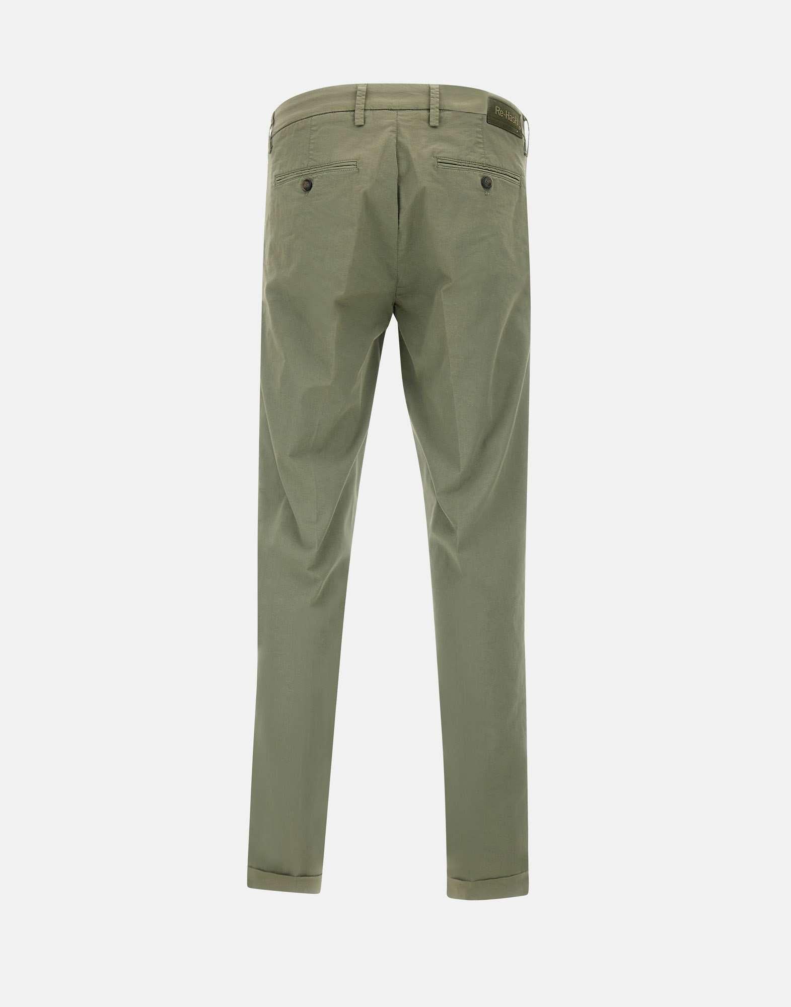 Pantaloni uomo Re-Hash " Mucha chinos" in cotone stretch, verde, chiusura con zip e bottone, tasche laterali a filetto, mini taschino frontale, vita regolare con passanti per cintura, risvolto al fondo, patch logo sul retro, slim fit, made in Italy.