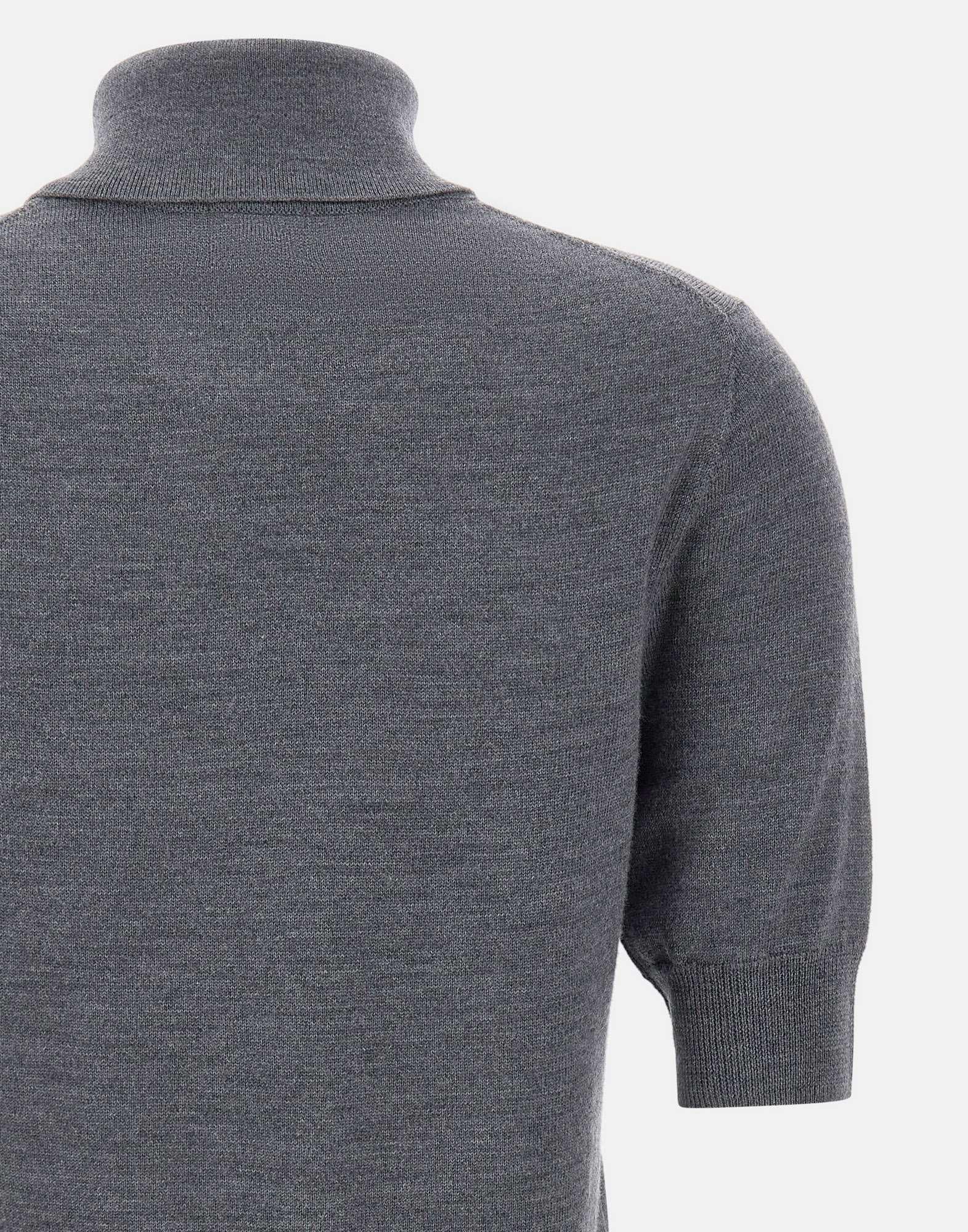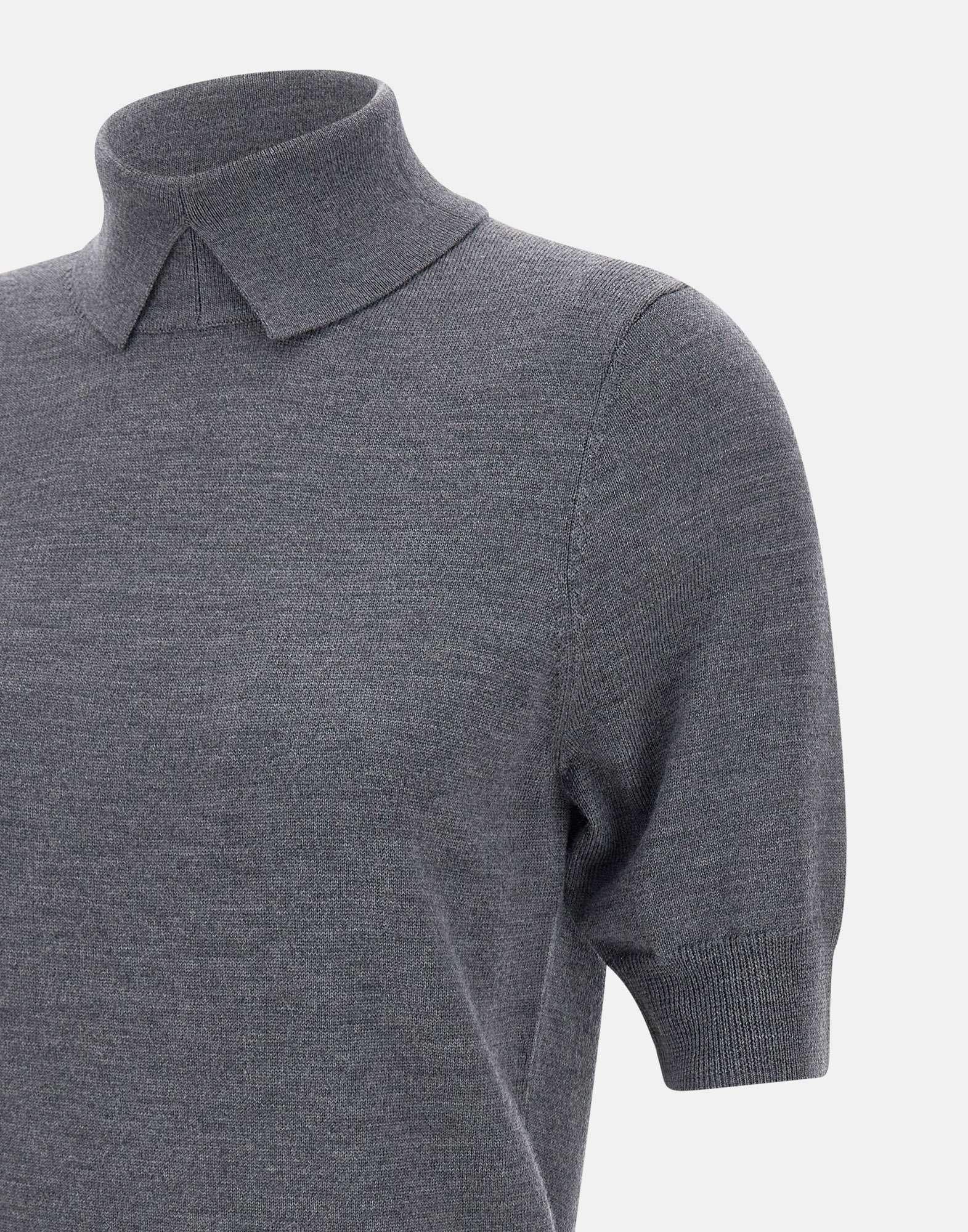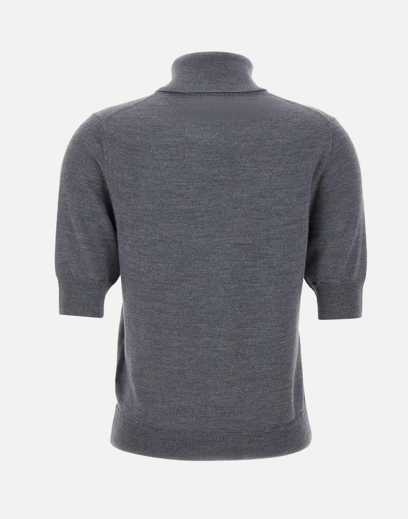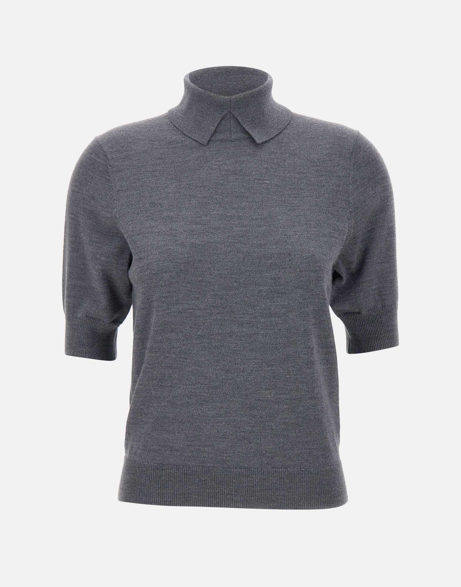 Maglia Herskind modello "Perry Knit Blouse", realizzata in pregiata lana merino extrafine. Proposta in colore grigio, presenta maniche corte, colletto alto e bordi a coste. Vestibilità regular, perfetta per look minimal e sofisticati