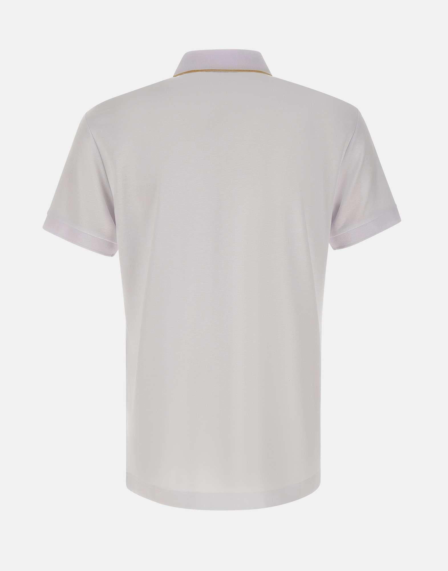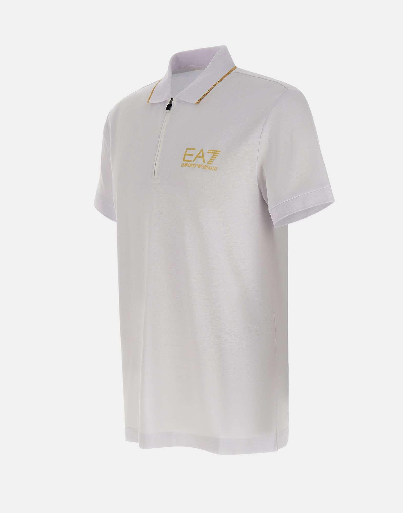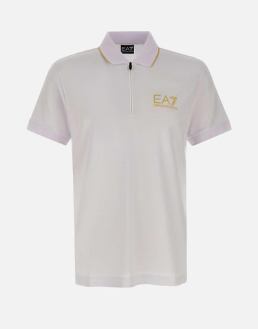 Polo uomo EA7 "Gold Label" realizzata in misto viscosa stretch color bianco, pensata per un look contemporaneo e pulito da luxury sportswear. Questa polo uomo a maniche corte si distingue per il dettaglio gold del logo EA7 sul petto e per il profilo dorato del colletto, che aggiunge un accento sofisticato senza perdere essenzialità. La chiusura con zip a 3/4 definisce uno stile dinamico e pratico, mentre la vestibilità slim valorizza la linea con un fit aderente. Una polo versatile, ideale per il tempo libero e per outfit casual dal gusto premium.