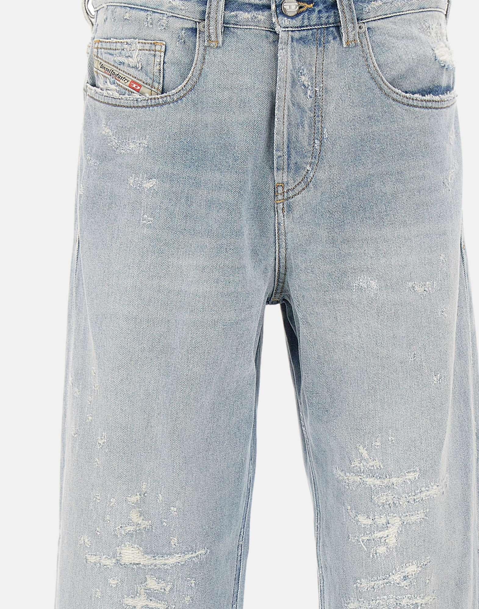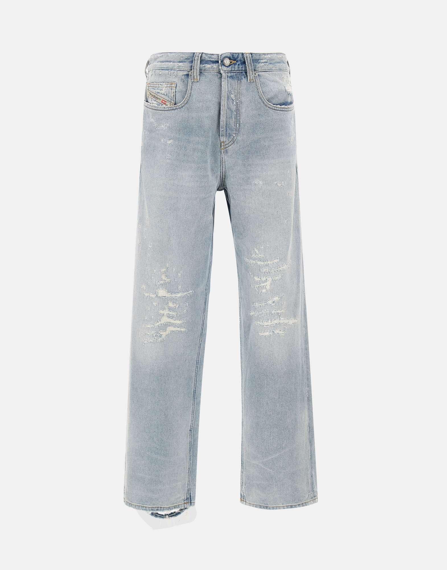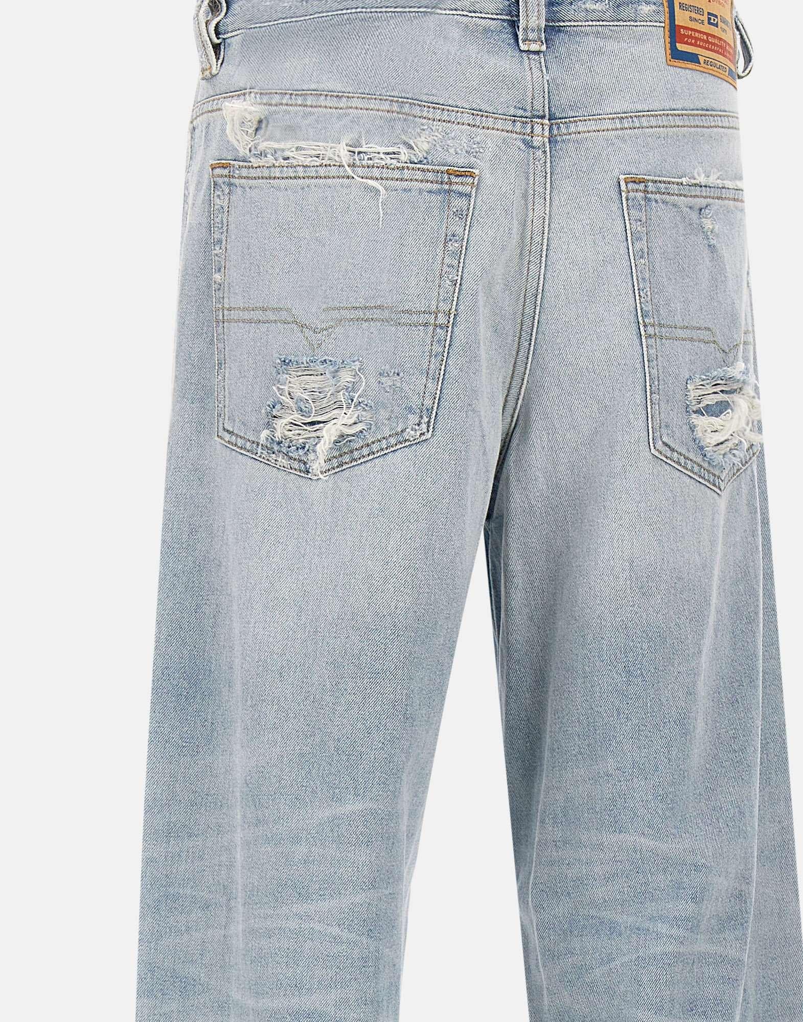 "Relaxed jeans 2001 d-macro 09m53" uomo Diesel, blu lavaggio chiaro, tessuto in denim di cotone biologico, vita bassa con passanti per cintura, gamba wide con fondo 24cm, dettagli destroyed all over, bordi sfrangiati, chiusura con bottoni, cinque tasche,