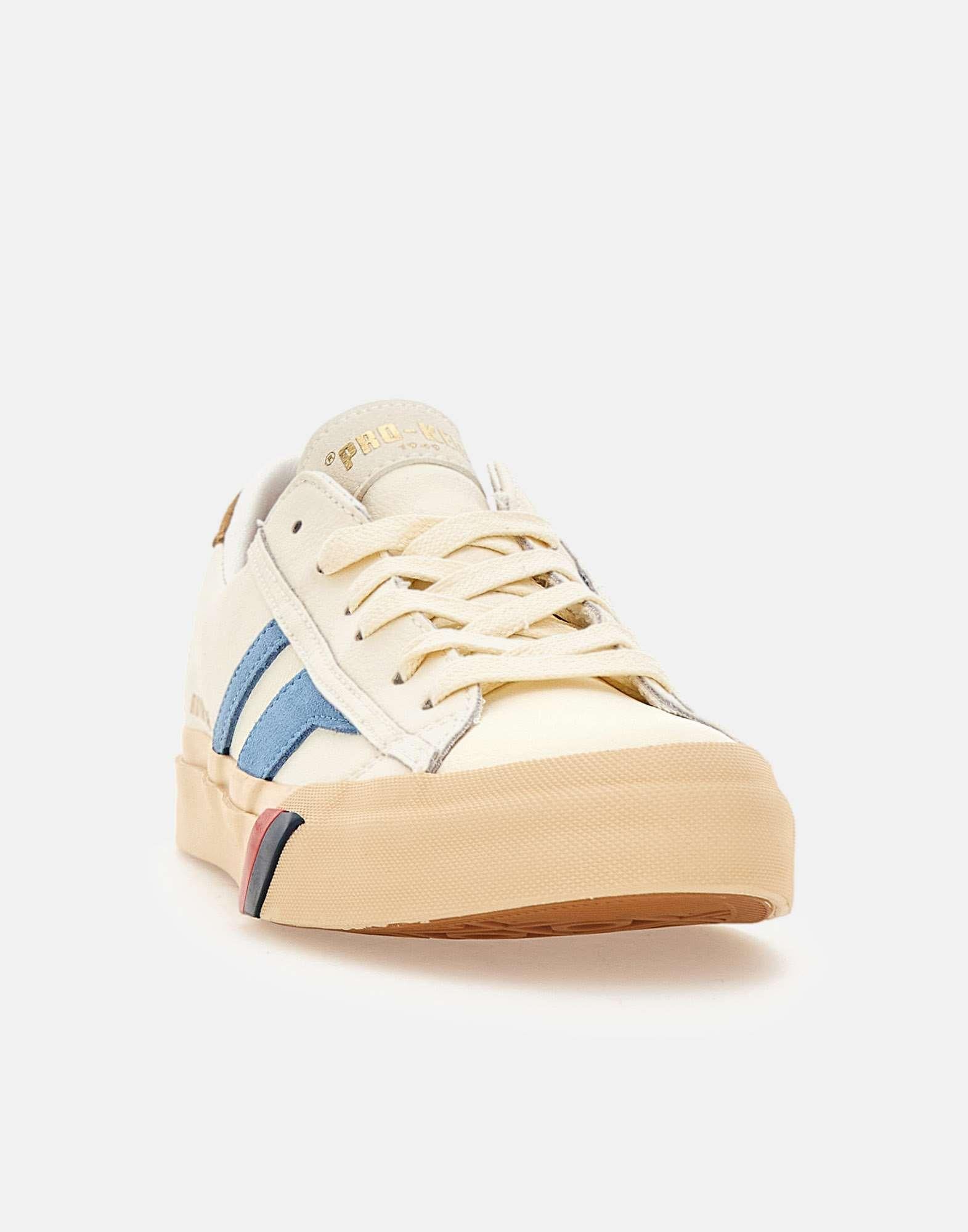 Sneakers donna Pro-Keds 1949 "ROYAL CLASSIC", con tomaia in pelle bianca, impreziosita da inserti in suede celesti e patch in pelle color cammello sul tallone. Il logo Pro-Keds è stampato sul lato esterno e sulla linguetta, mentre la suola in gomma color crema con iconica logatura rosso-blu, visibile anche sotto il battistrada, unisce estetica heritage e funzionalità. La fodera in pelle garantisce comfort superiore, mentre la fascia elastica interna facilita la calzata. Presenta doppio laccio in dotazione. Ispirata all'archivio Pro-Keds 1949, celebra l'eredità del brand con uno stile senza tempo. Altezza suola: 3 cm.