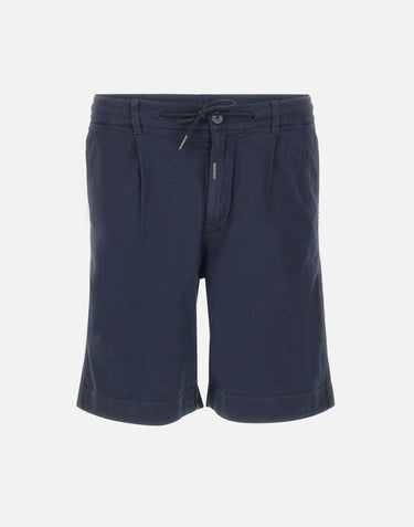 Shorts uomo Woolrich realizzati in misto lino e cotone color blu, pensati per un guardaroba estivo essenziale e curato con un'estetica pulita. Le pinces definiscono una linea ben strutturata per un look fresco e disinvolto, mentre la vita elasticizzata con coulisse aggiunge comfort e praticità. Il modello presenta chiusura con bottone e zip, passanti in vita con passante posteriore rifinito col logo, tasche sui fianchi e tasche a filetto sul retro per una funzionalità equilibrata. Vestibilità regular fit, ideale per outfit casual e smart casual.