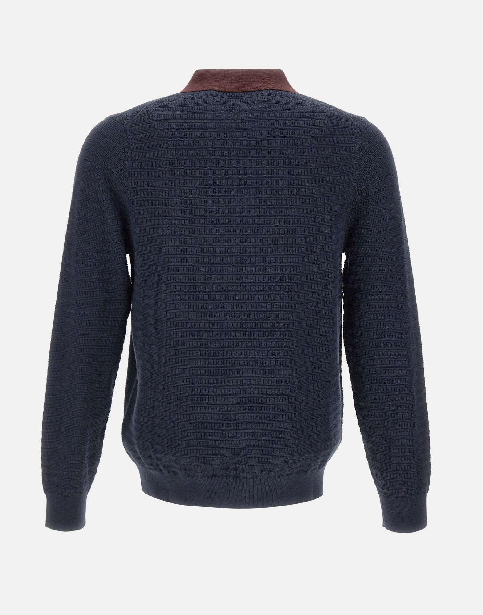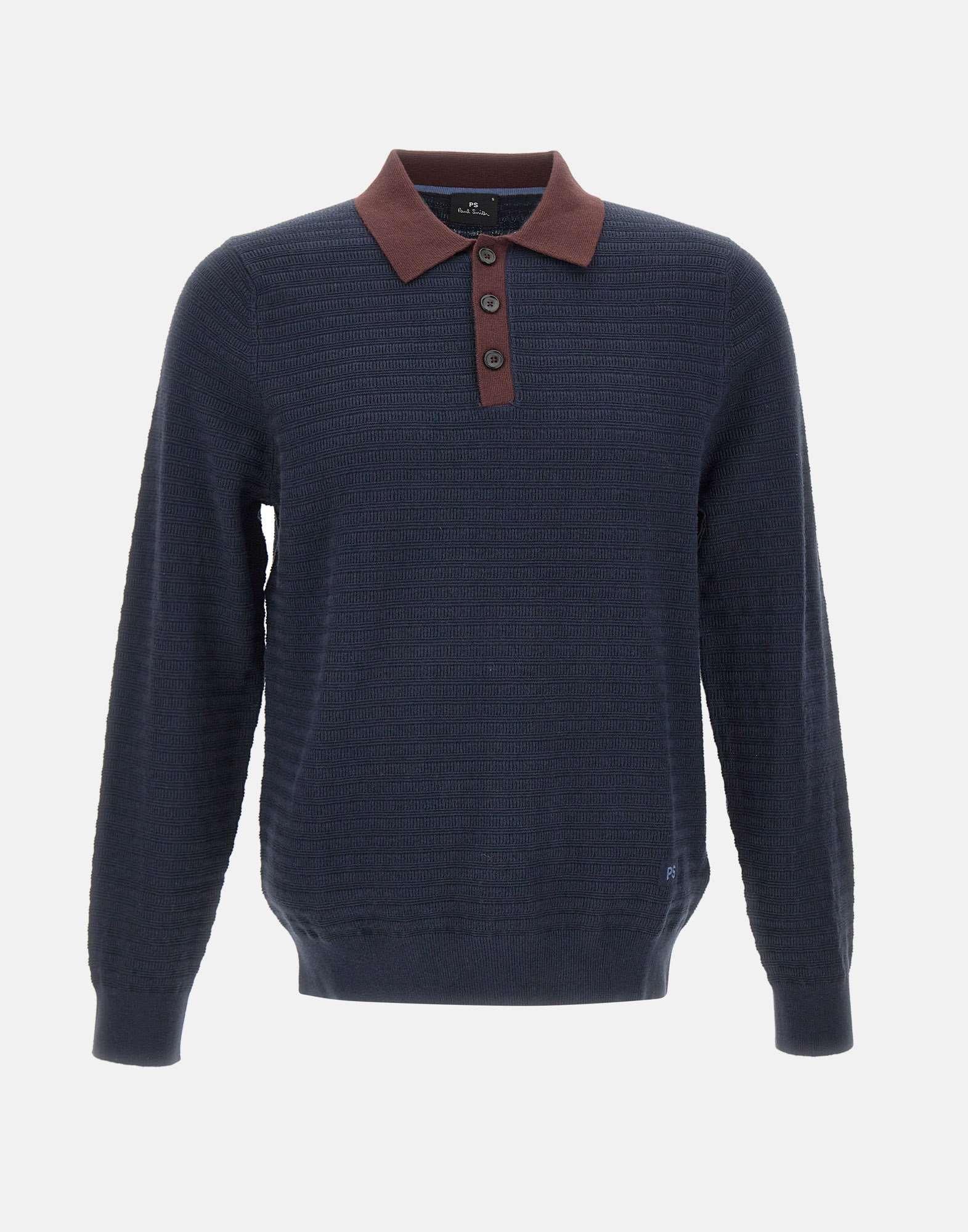 Maglia PS Paul Smith "Sweater Polo" in misto cotone e lana colore blu, con trama operata che aggiunge profondità e carattere al design. Presenta colletto classico a contrasto borgogna, chiusura con tre bottoni, maniche lunghe e bordi a costine per una vestibilità definita. Un capo raffinato e versatile dal regular fit, perfetto per look casual eleganti. Lavaggio delicato.