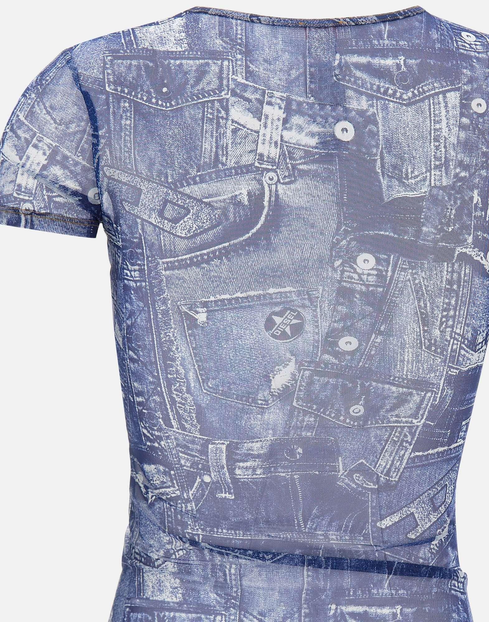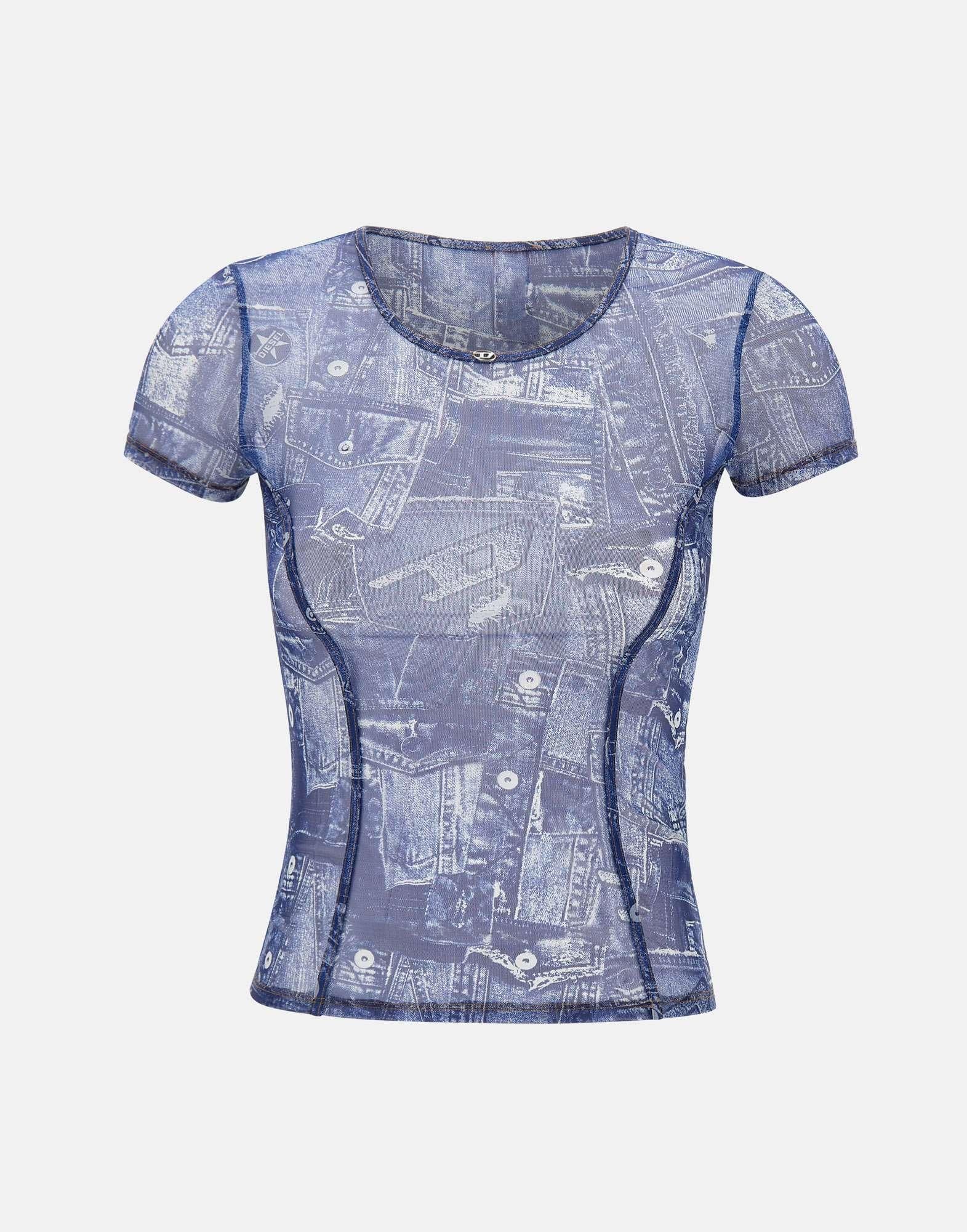 T-shirt donna Diesel "Kasia-Dnm" in tessuto blu trasparente con stampa effetto denim, dal carattere audace e contemporaneo. Presenta girocollo, maniche corte e impunture decorative sul fronte, arricchita da un piccolo logo metallico sul bordo del collo. La vestibilità slim valorizza la silhouette, perfetta per look moderni e distintivi.