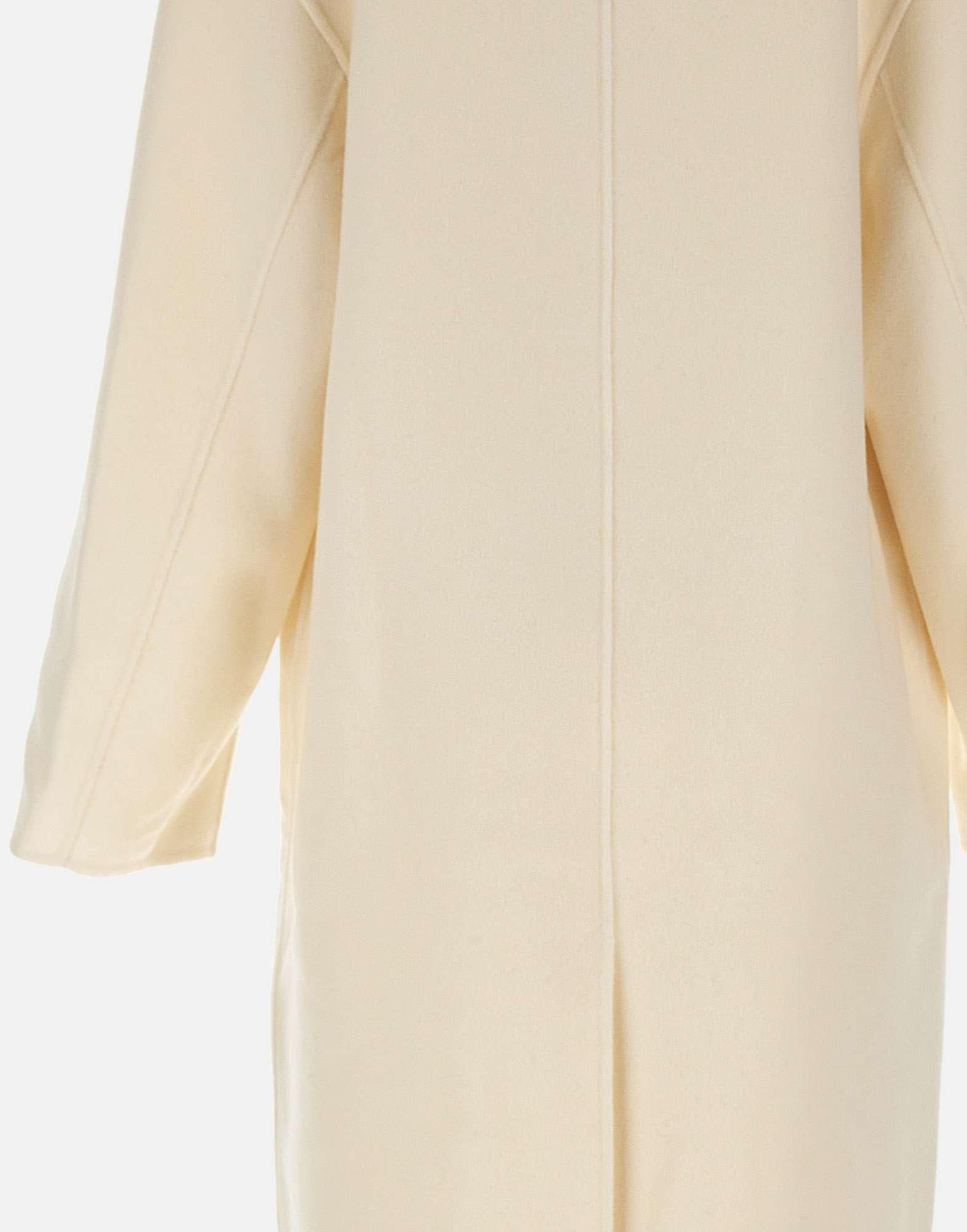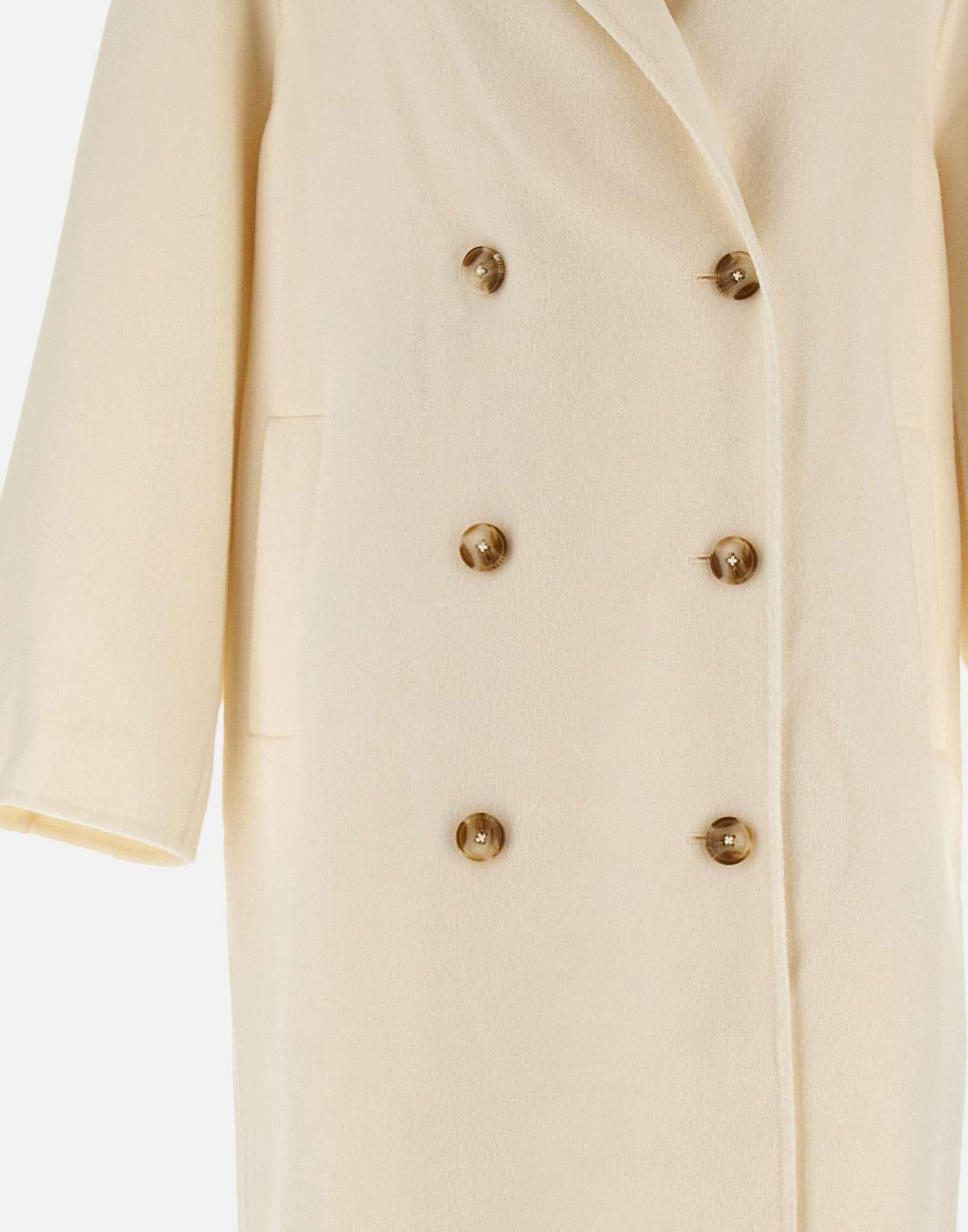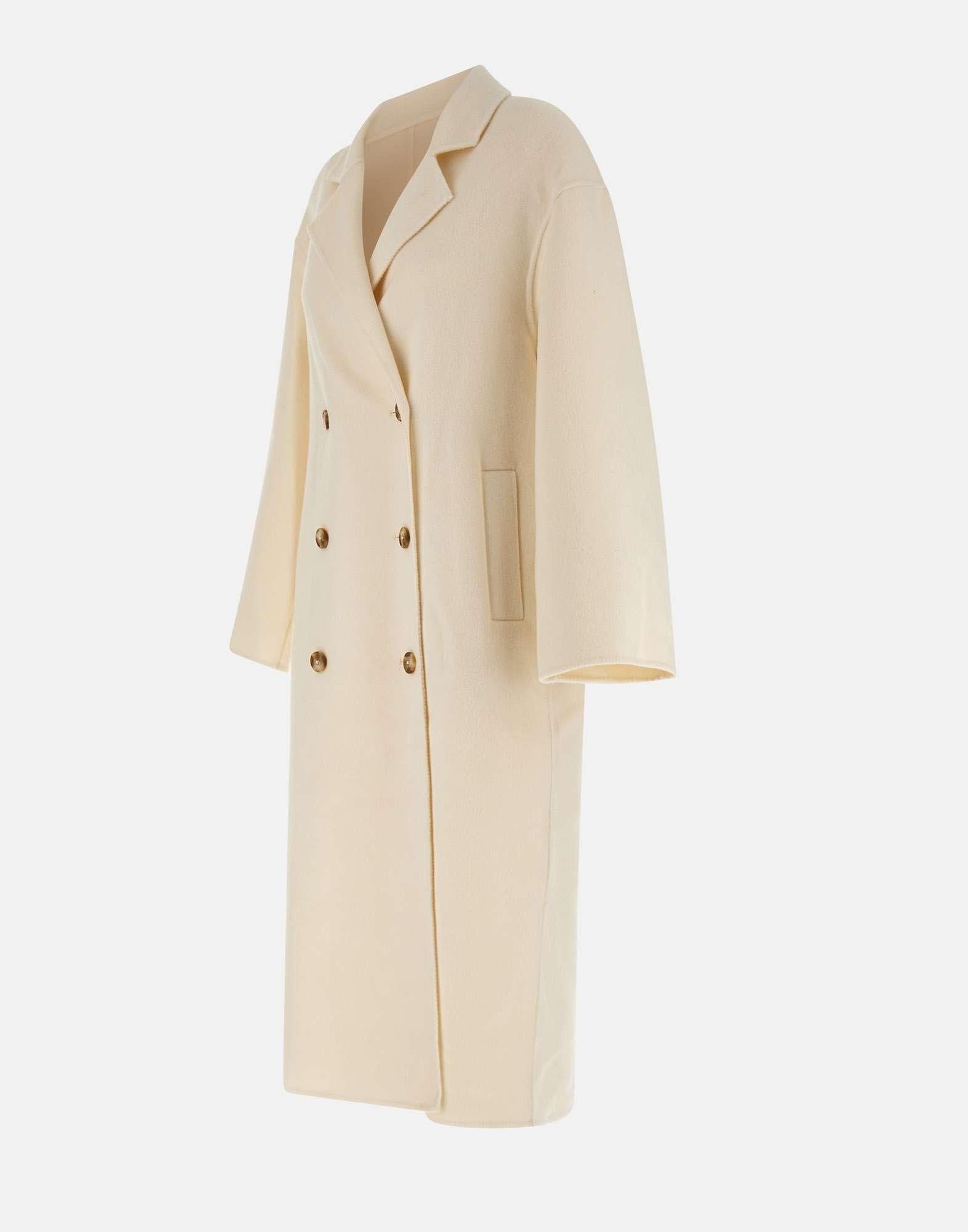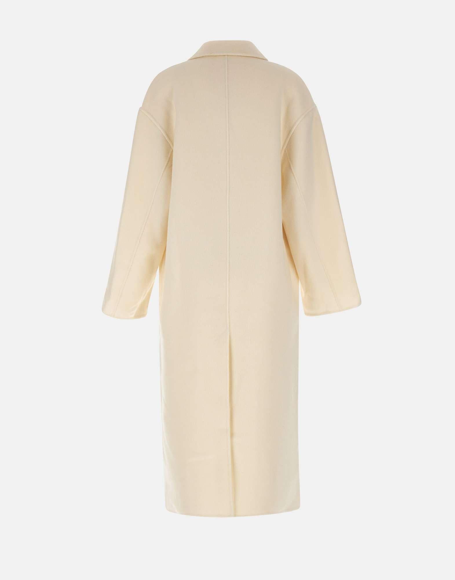 Cappotto Loulou De Saison modello "Borneo", colore panna, realizzato in pregiato misto lana e cashmere. Dalla linea lunga e sofisticata, presenta chiusura doppiopetto con bottoni a contrasto, rever a lancia e tasche laterali a filo. Lo spacco centrale sul retro e le spalle raglan completano il design, offrendo una vestibilità rilassata ideale per look eleganti e moderni.