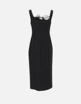 Abito Blumarine, nero, in cady crepe, midi, scollo quadrato con decoro rosa ricamata ad intaglio con strass, senza maniche, spacco frontale sulla gamba, foderato, gioco di tagli a definire la silhouette, slim fit, made in Italy