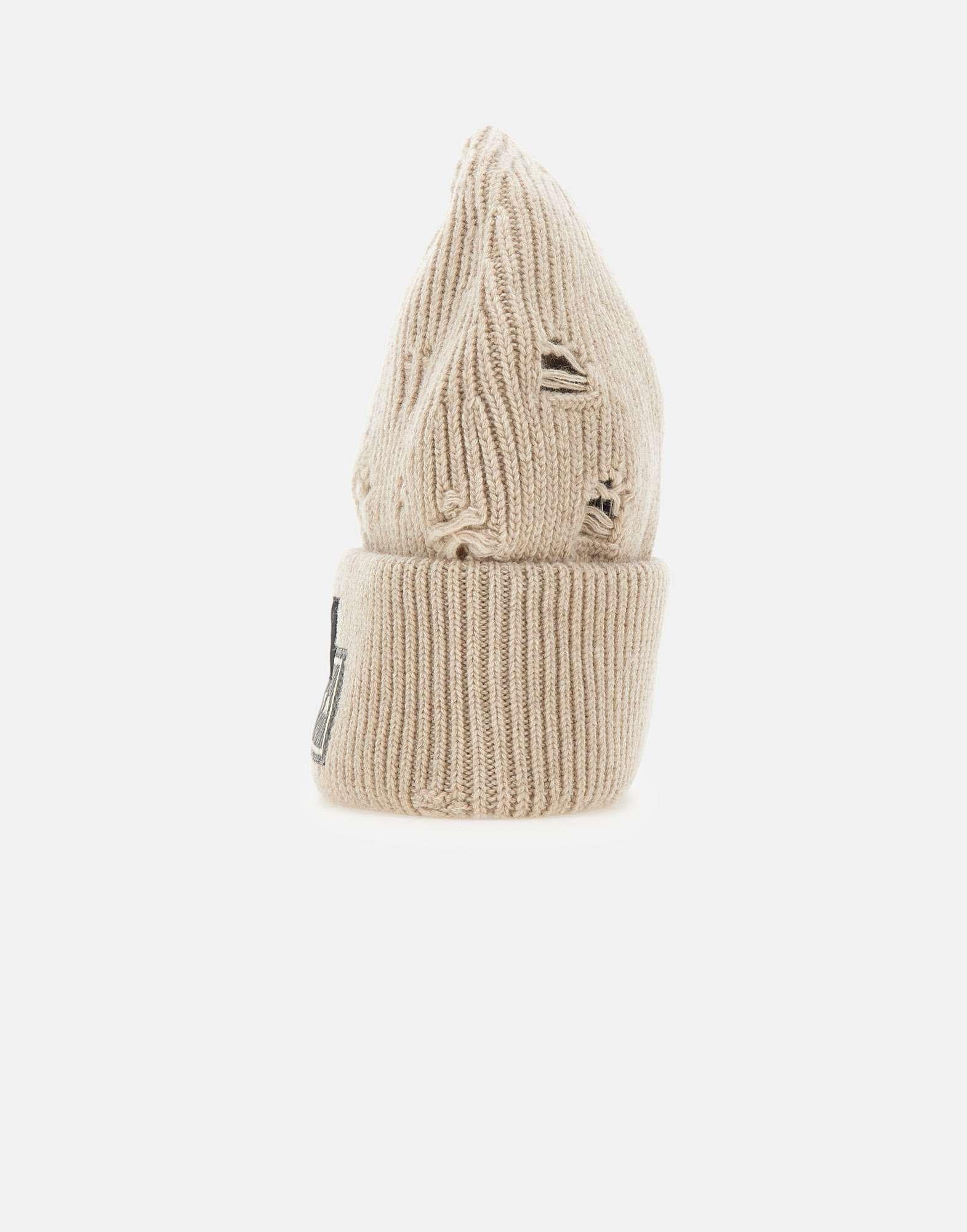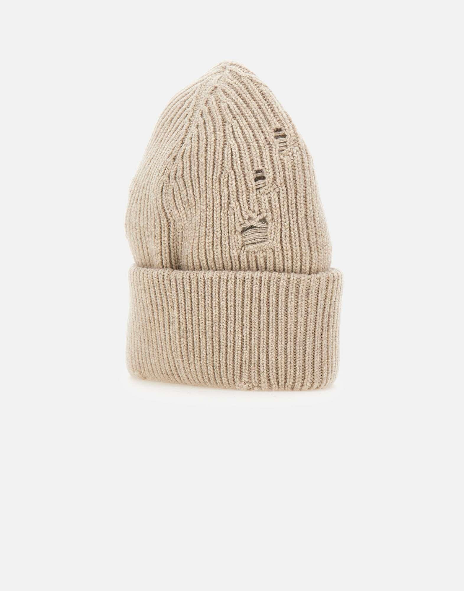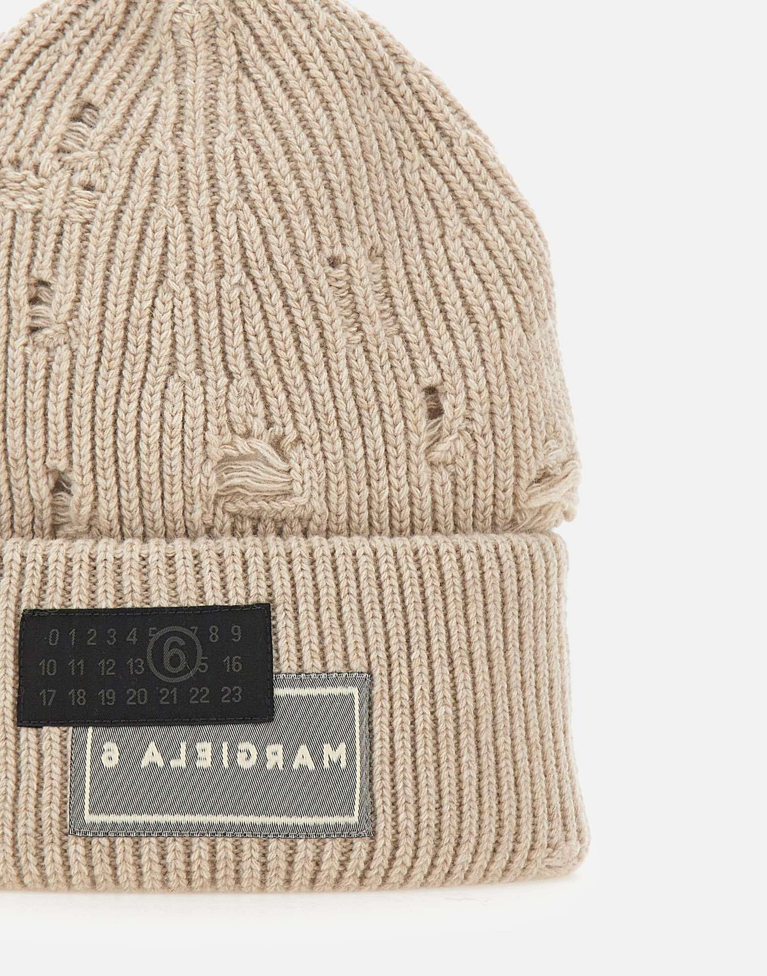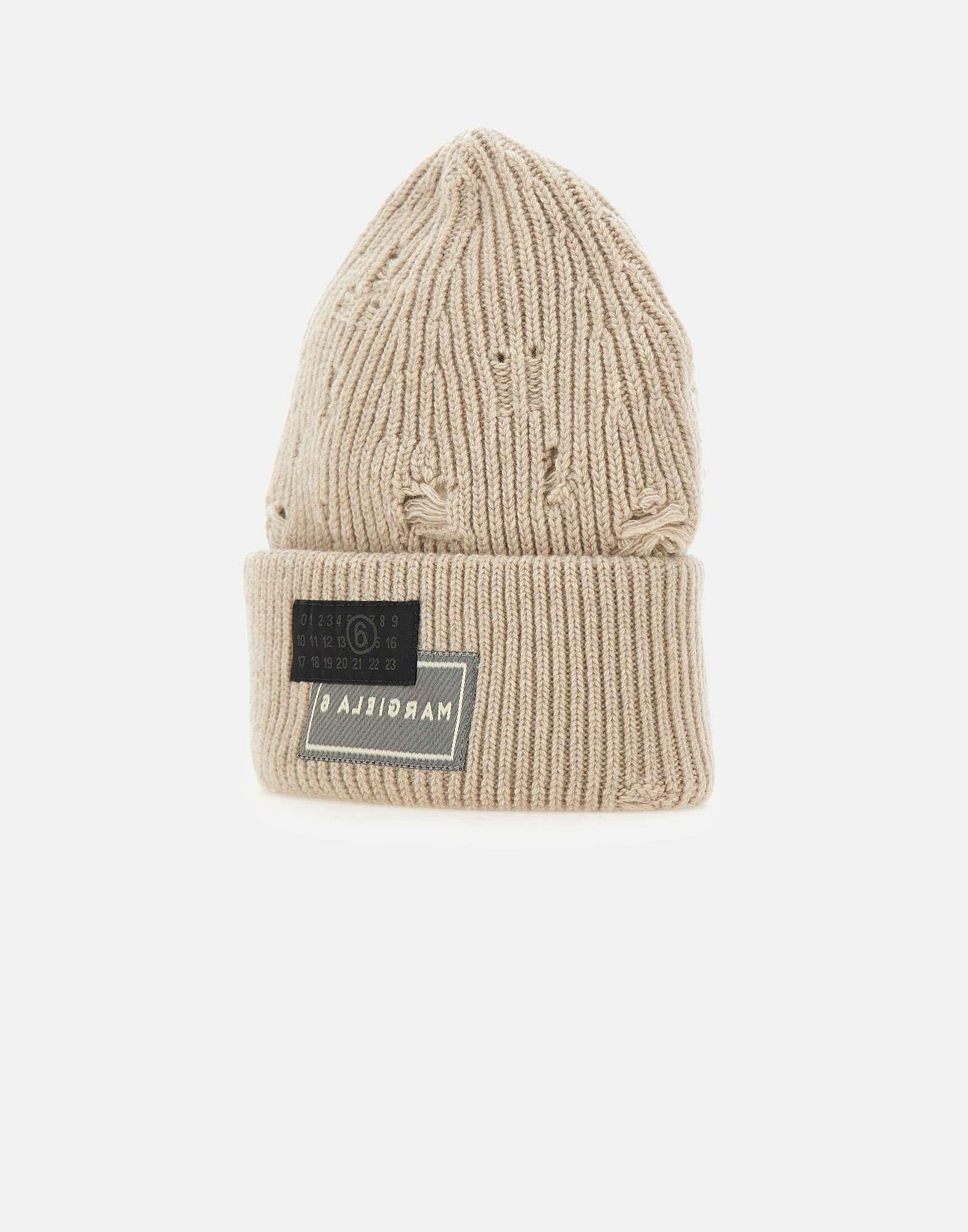 Berretto MM6 Maison Margiela in lana color ecrù, caratterizzato da un design minimalista con maglia a coste e risvolto. Dettagli destroyed e la caratteristica grafica numerica della Maison aggiungono un tocco distintivo e iconico. Realizzato in Italia, è proposto in taglia regolare.