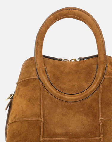 Borsa Staud "Naomi Mini Satchel" in pelle scamosciata color cognac, caratterizzata da raffinato design patchwork. Dotata di doppio manico superiore, chiusura con zip a due vie, metalleria dorata e tracolla regolabile e removibile per un look versatile. Presenta piedini al fondo per maggiore stabilità. Dustbag in tessuto inclusa. Dimensioni: 24x9x16 cm.