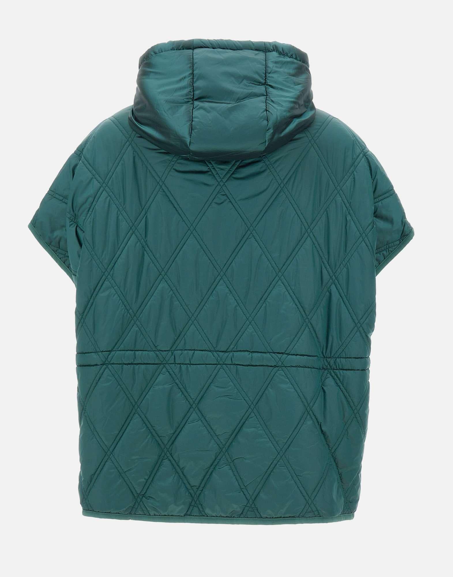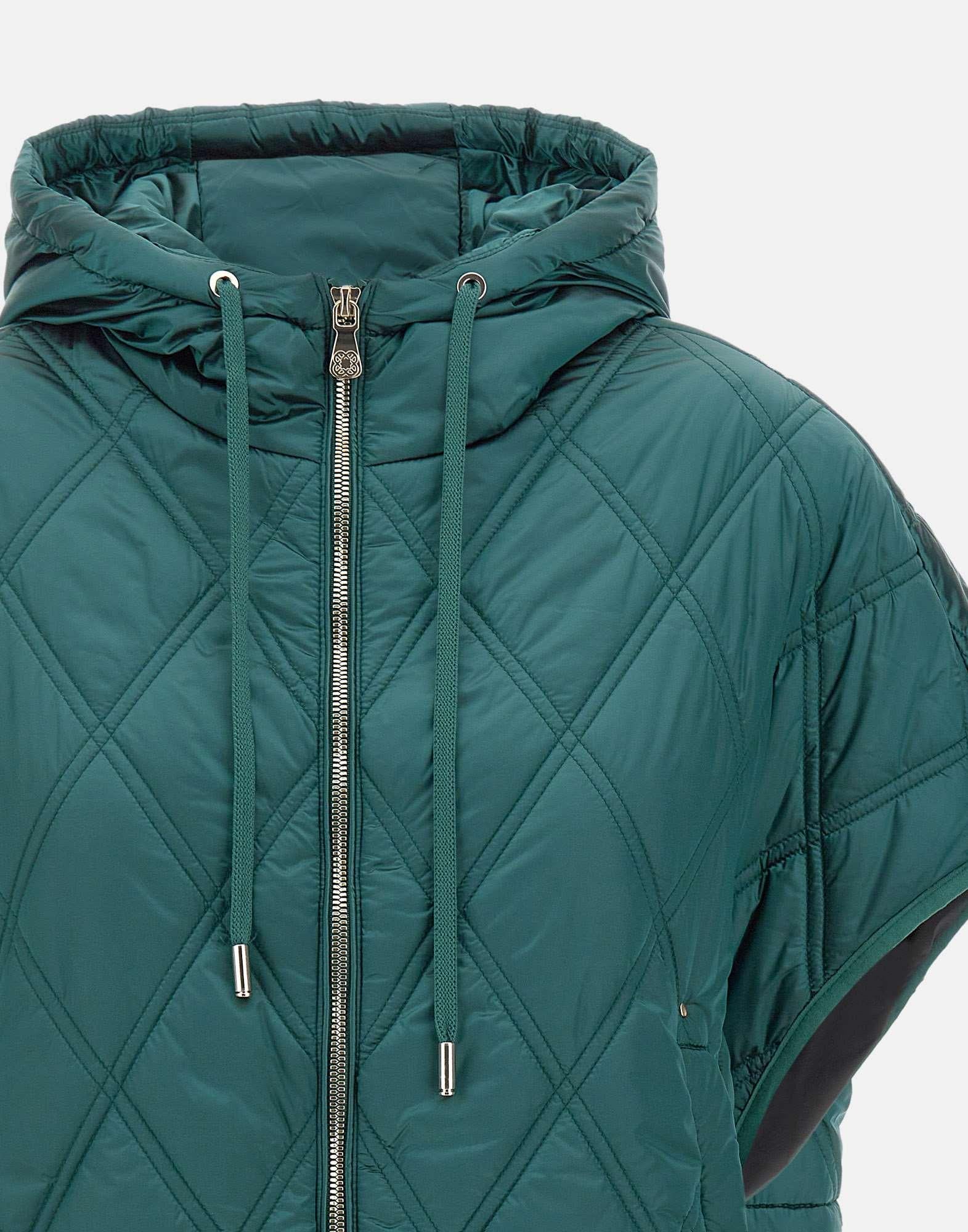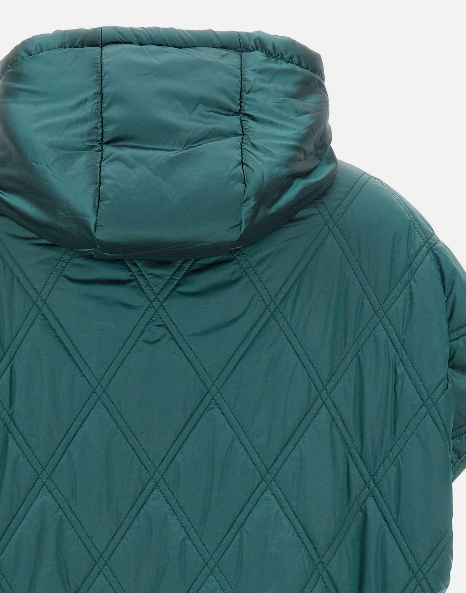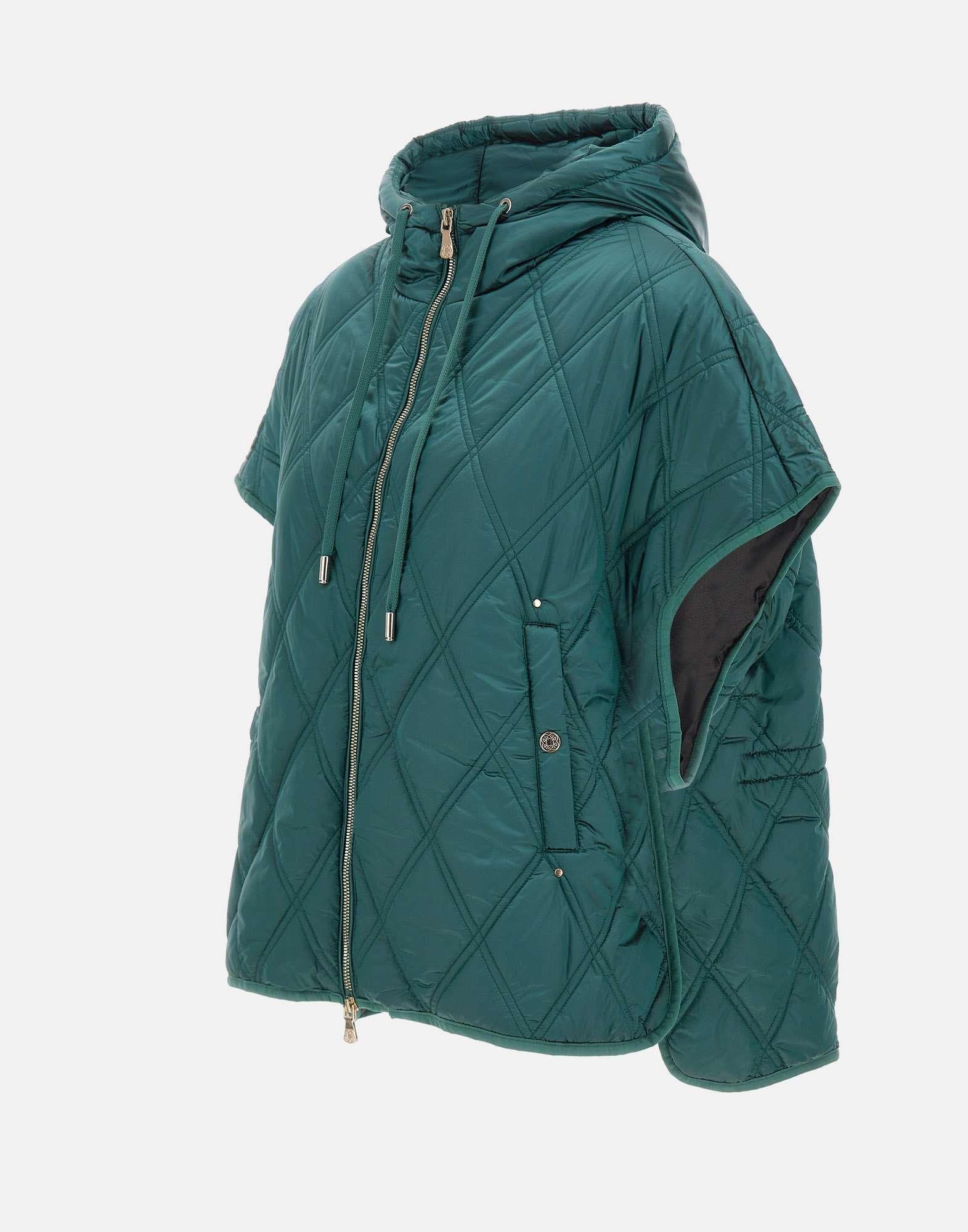 Cappa Elena Mirò in verde bottiglia, realizzata con imbottitura sintetica e trapuntatura a rombi che unisce comfort e stile. Il modello è smanicato, con un ampio giromanica, tasche laterali con bottoni e cappuccio regolabile con coulisse. La chiusura frontale è con zip a due vie arricchita da metalleria dorata. Vestibilità relaxed fit per un look elegante e pratico.