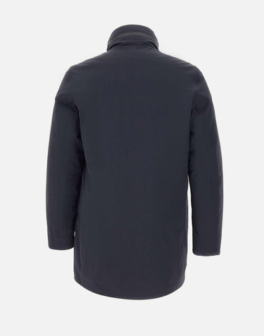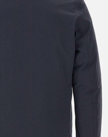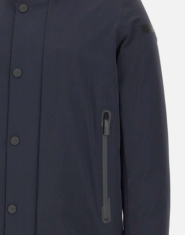 Giacca uomo RRD modello "Montecristo Floating Raincoat Jkt", proposta in blu, lunghezza tre quarti, dal design contemporaneo e minimalista. Realizzata in tessuto Stratofabric impermeabile e traspirante, con costruzione totalmente nastrata e finitura esterna in tessuto Montecristo dal touch liscio. La chiusura integrale presenta zip a doppio cursore e bottoni, mentre le ampie tasche sono dotate di zip termo applicate. Collo alto con cappuccio integrato e imbottitura in piuma d’anatra 90/10 con esclusivo sistema Floating Shield, che assicura fit impeccabile, calore e comfort alla vestibilità regular. Completa il modello il taschino interno con doppio filetto arancione fluo, l’etichetta a cuore "Made with love, designed in Tuscany" e il logo nero a microiniezione sulla manica sinistra.