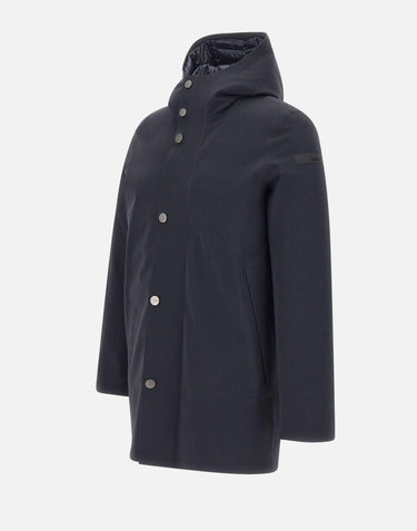 Parka uomo RRD "Surflex Winter Down Under Floating Parka Jkt" colore blu navy, dal design minimalista ed elegante con cappuccio fisso avvolgente. Realizzato in tessuto SURFLEX con costruzione Laser Glue Lock e membrana Stratofabric #3, è completamente impermeabile e resistente agli agenti atmosferici. Chiusura frontale con zip a doppio cursore nascosta da patta con bottoni a pressione e ampie tasche laterali a pistagna. Imbottitura in piuma danatra 90/10 con tecnologia Floating Shield per una vestibilità impeccabile e massimo comfort. Interno con taschino a zip invisibile rifinito da doppio filetto arancione fluo e tag "Made with love, designed in Tuscany". Logo a microiniezione nero sulla manica.