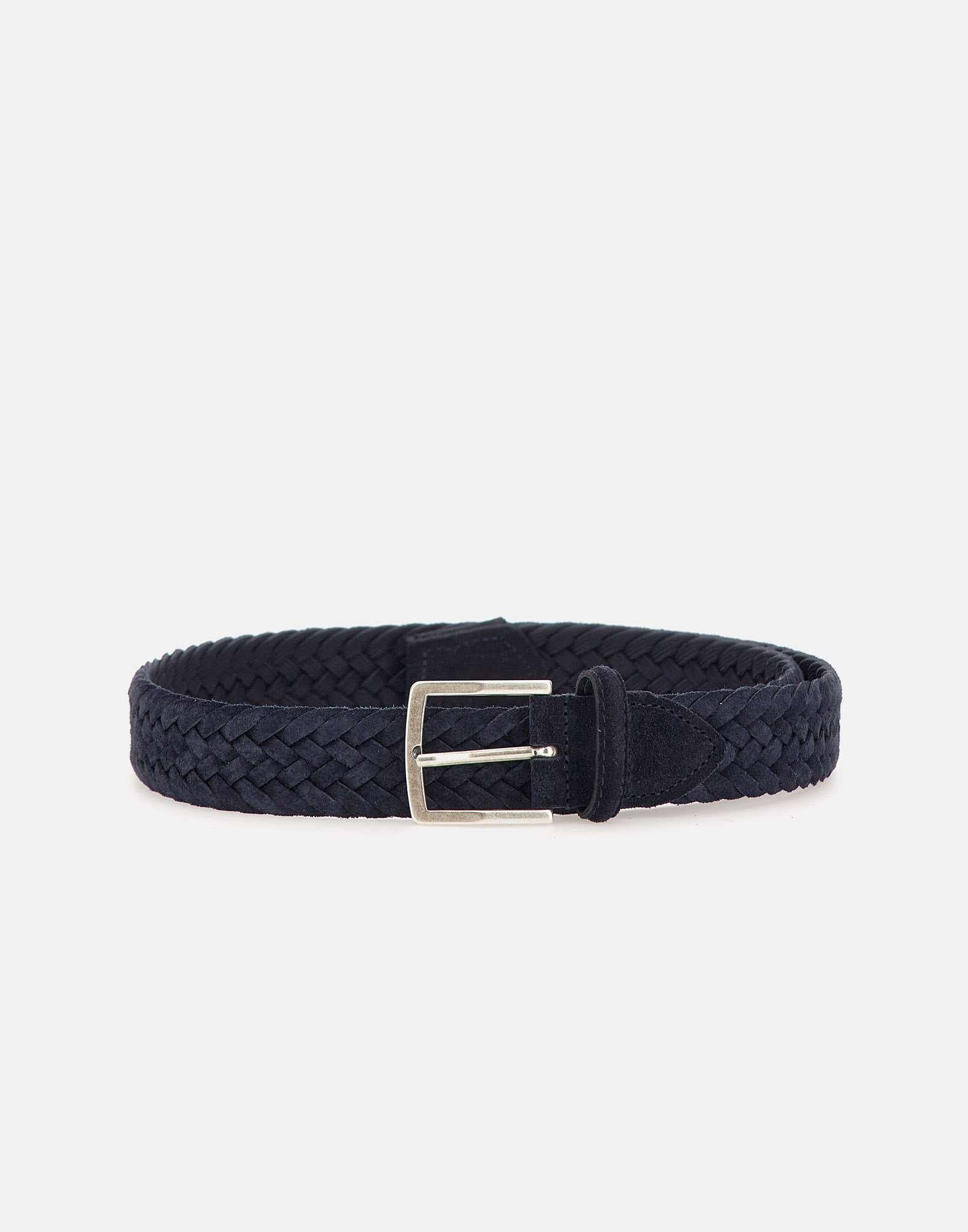 Cintura uomo Athison, blu, in pelle scamosciata, prima cintura intrecciata al mondo ad essere realizzata completamente con fili ottenuti da scarti di vera pelle riciclata e tagliati finemente in strisce a sezione circolare, senza fori, fibbia ad ardiglione silver. Made in Italy. Larghezza 3cm