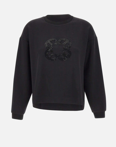 Felpa Elena Mirò, realizzata in tessuto misto viscosa, proposta in colore nero. Caratterizzata da maniche lunghe, scollo tondo e fondo asimmetrico con spacchetti laterali. Il davanti è impreziosito da un motivo floreale ricamato con paillettes che aggiunge luce ed eleganza al capo. Vestibilità regular.