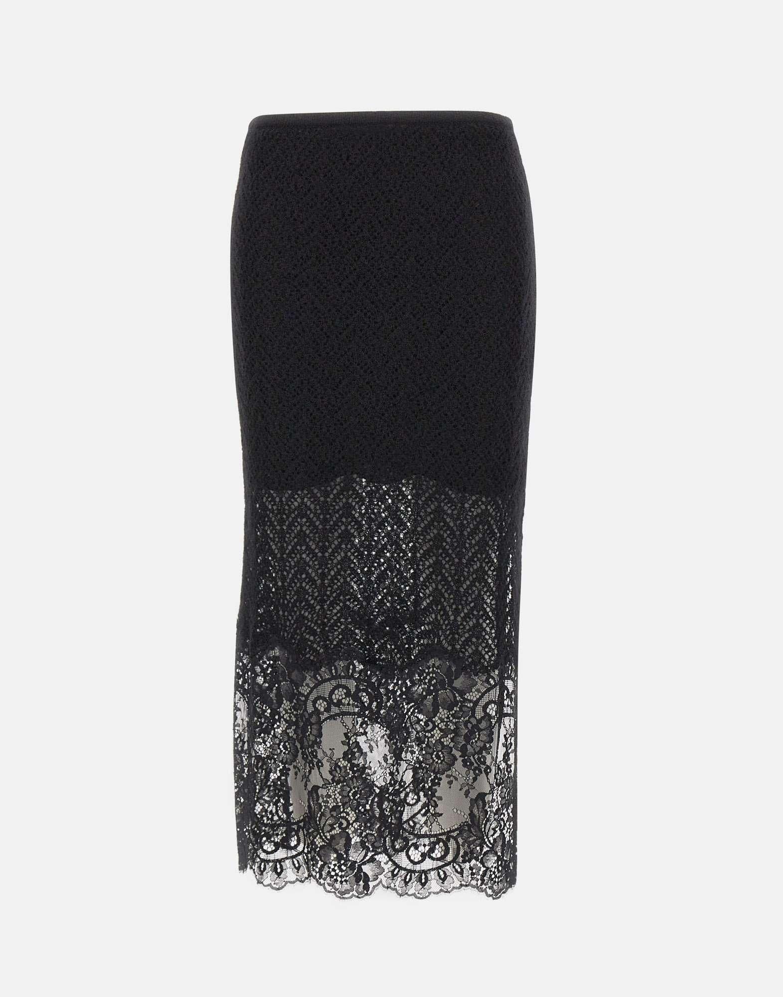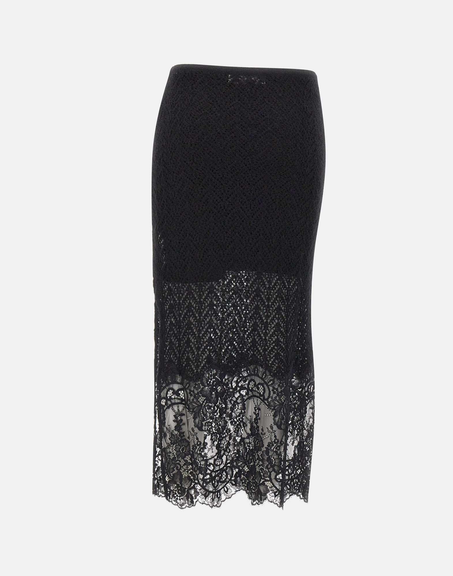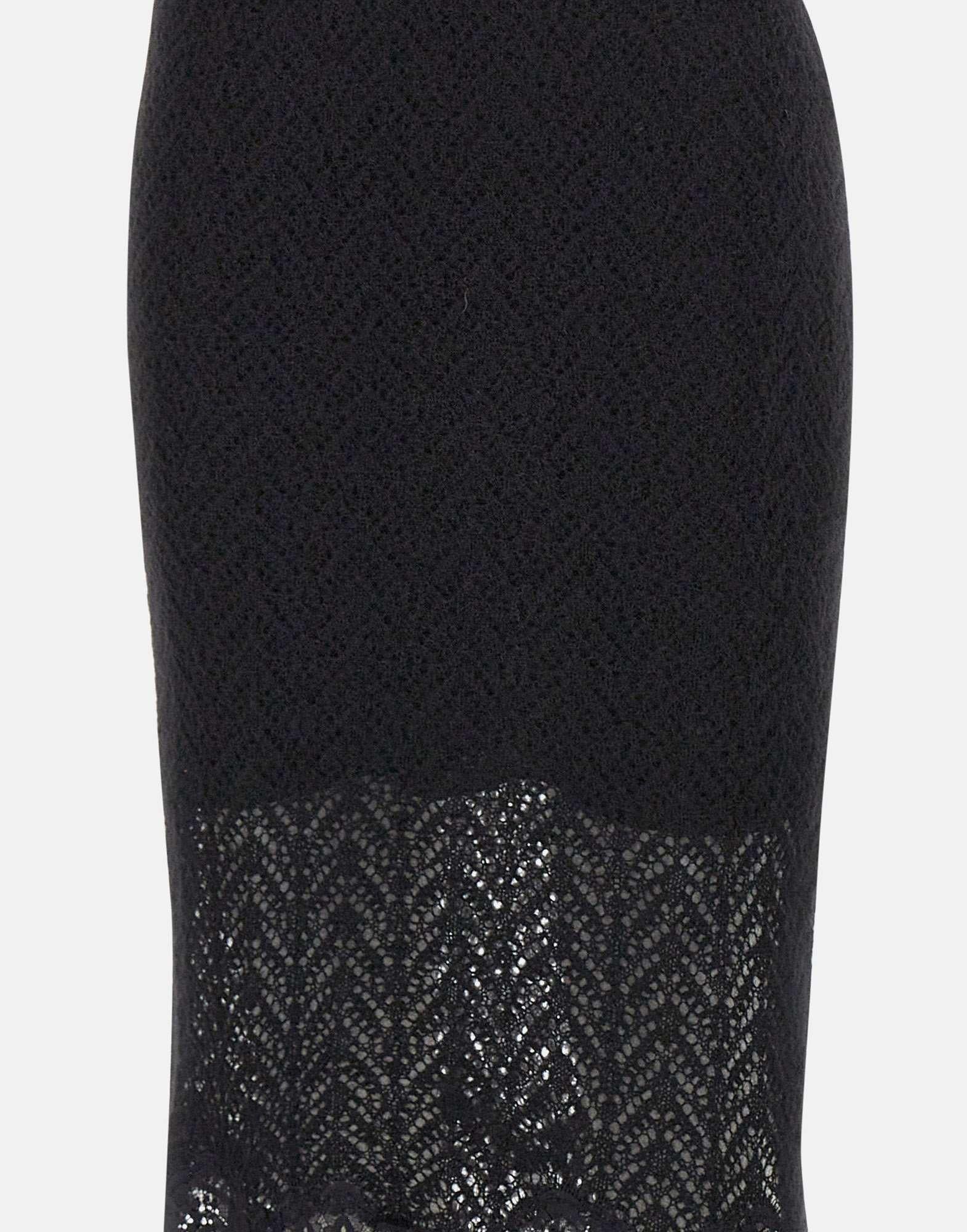 Gonna Blumarine, colore nero, in maglia misto mohair, trama operata, dettagli in pizzo sul fondo, vita elasticata, modello longuette, regular fit, mini sottoveste inclusa, made in Italy.