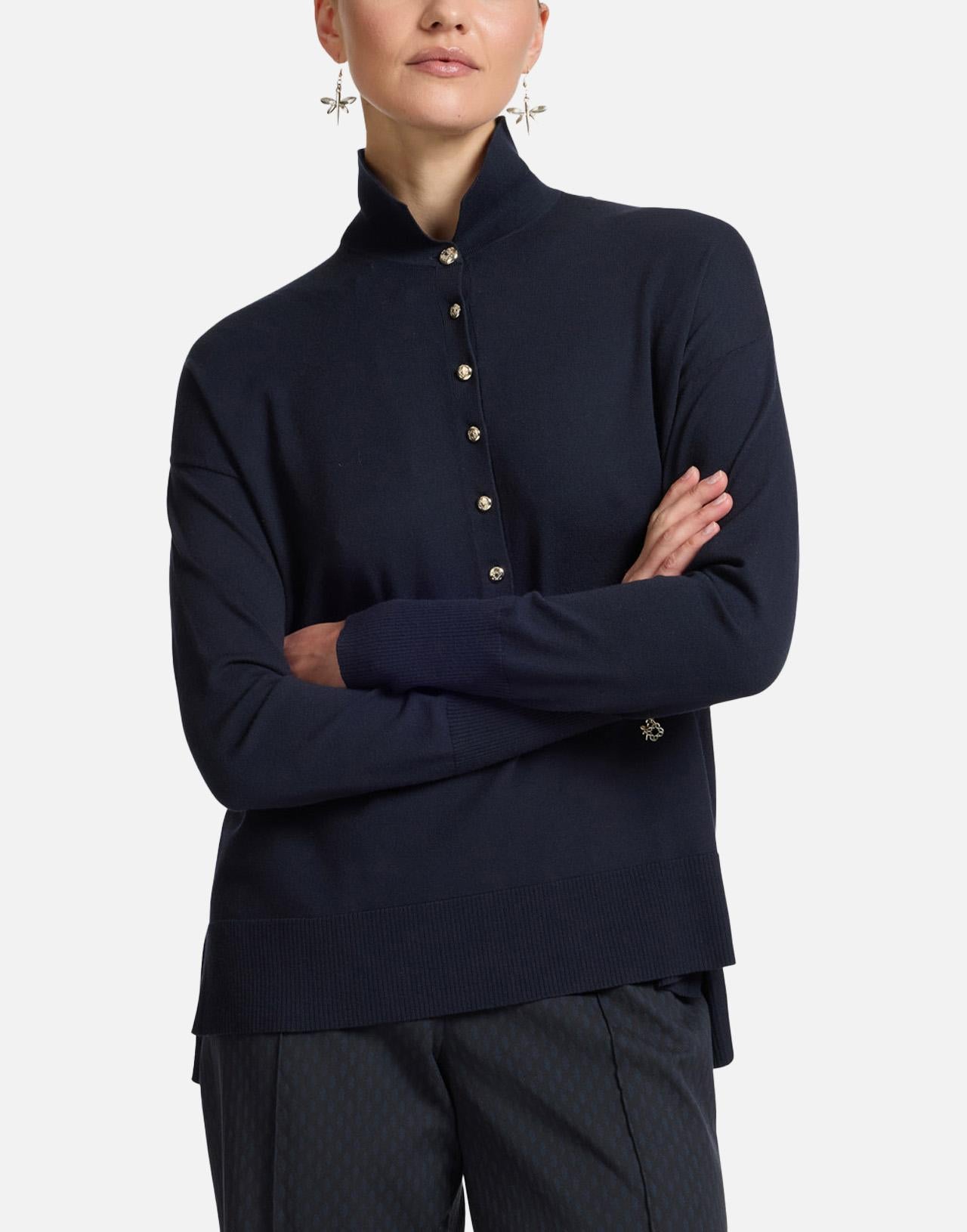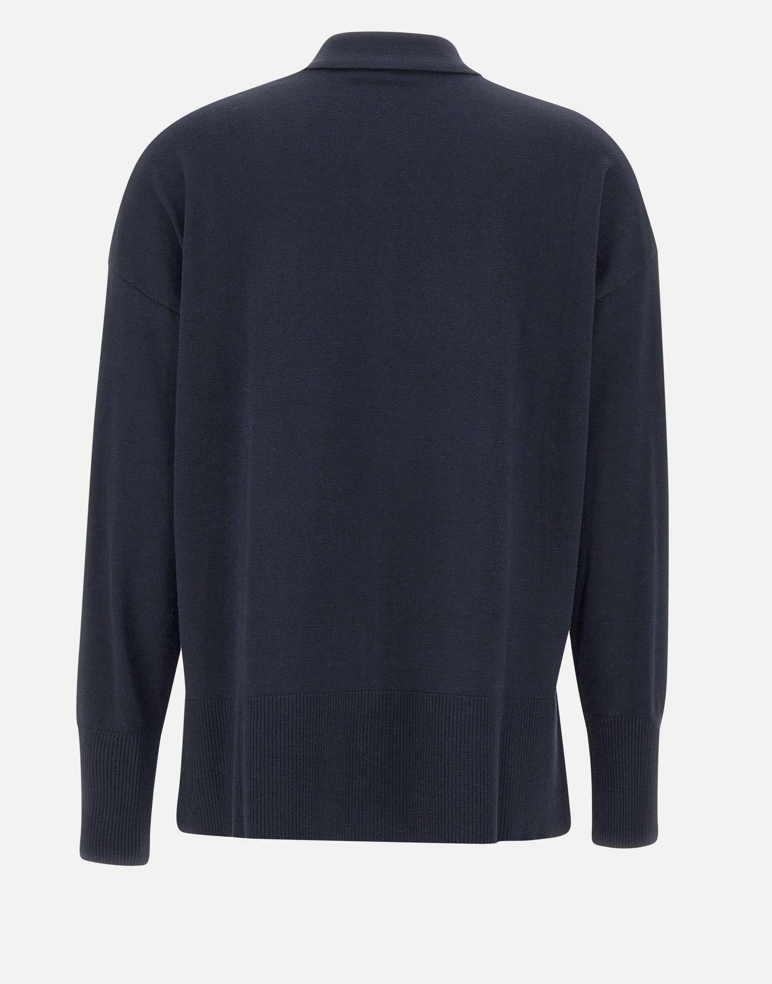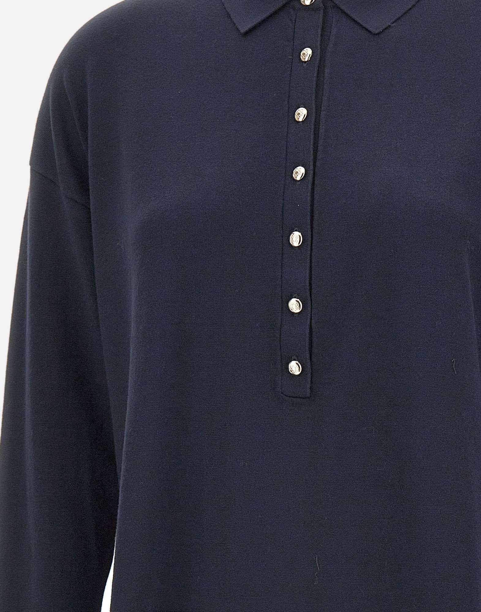 Maglia Elena Mirò in misto viscosa blu navy, modello polo con colletto classico e chiusura con bottoncini gioiello. Presenta maniche lunghe, spacchetti laterali al fondo e logo ricamato che aggiunge un tocco distintivo. I bordi a costine completano il design. Vestibilità regular, perfetta per look eleganti da giorno.