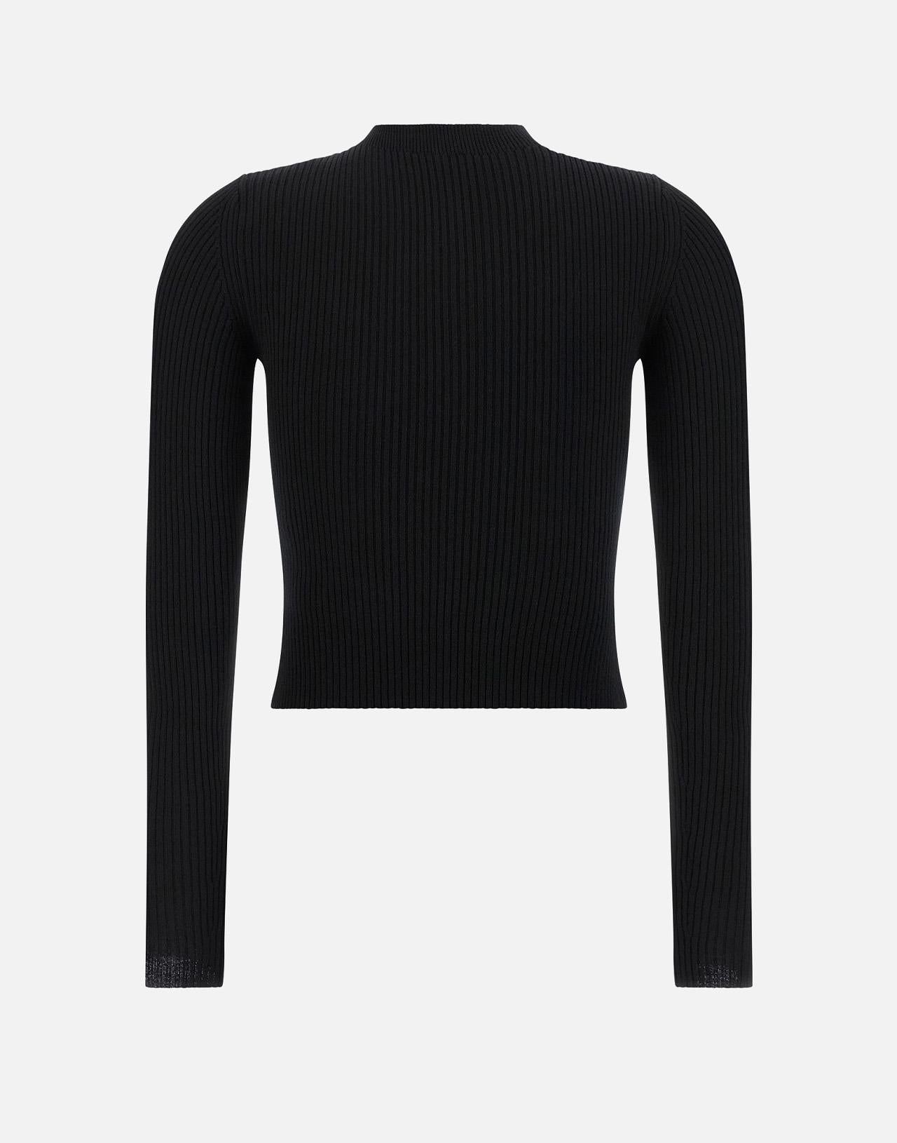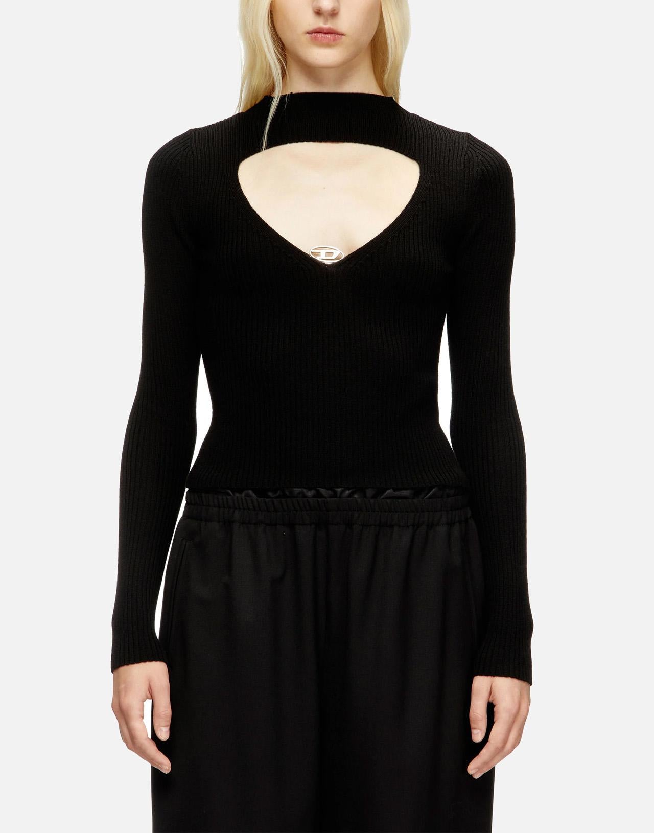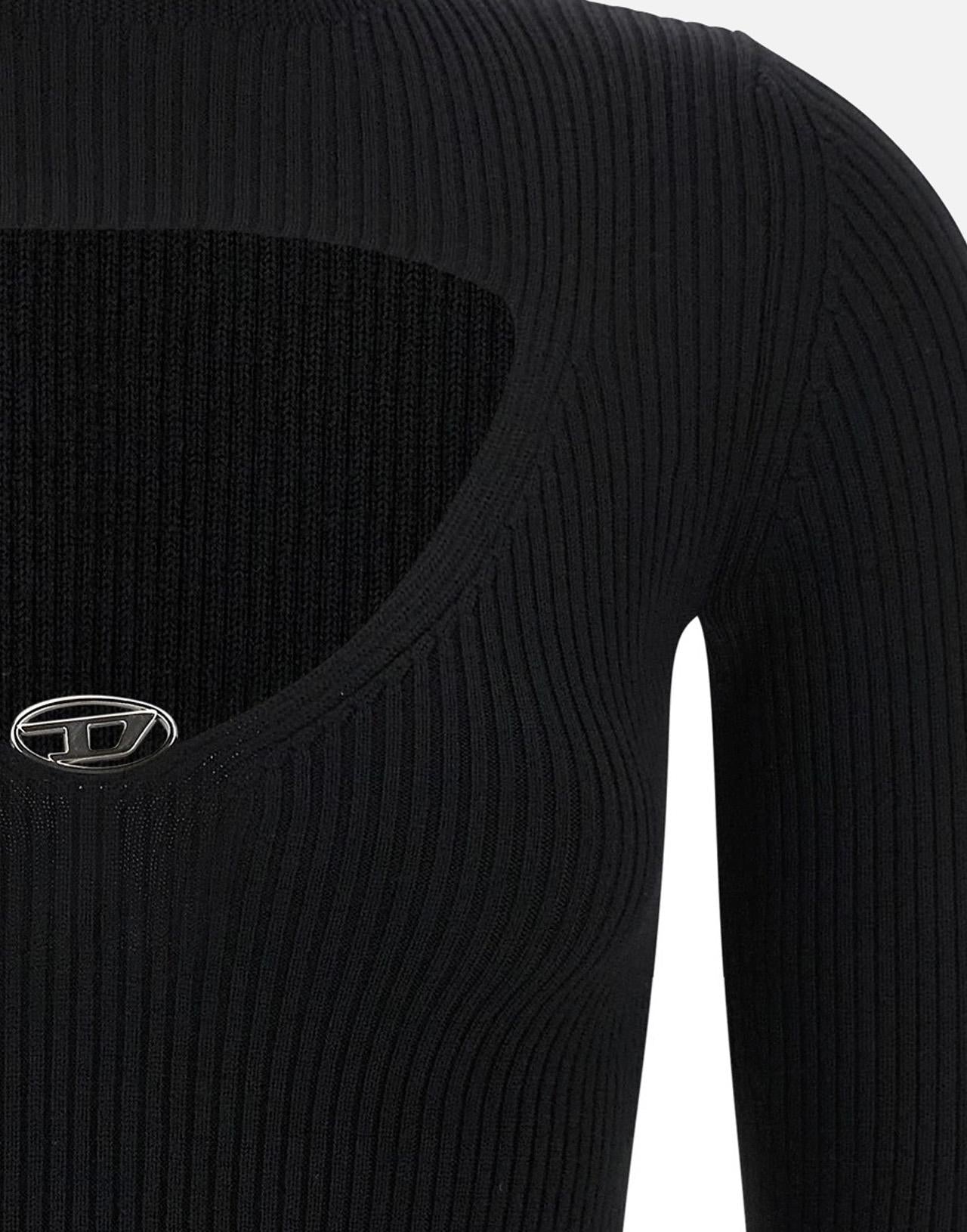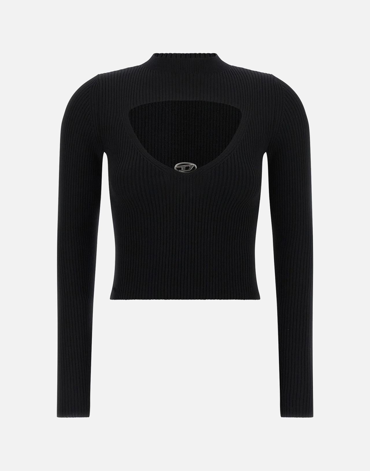 Maglia Diesel "M Olina", colore nero, maniche lunghe, trama a coste, dettaglio cut-out sul davanti con applicazione placca logo oval D silver, silhouette aderente, regular fit, made in Italy.