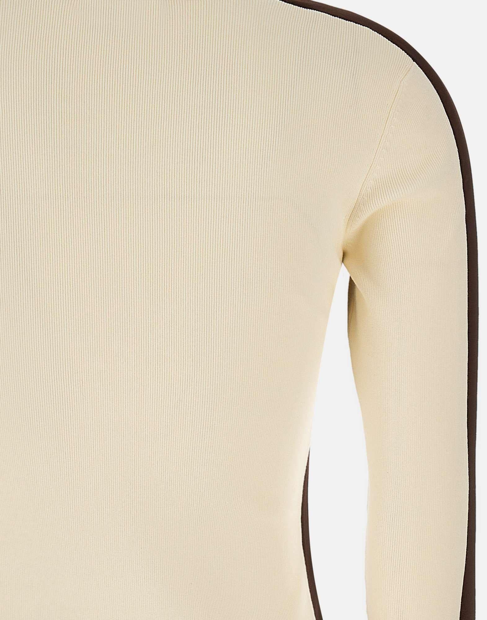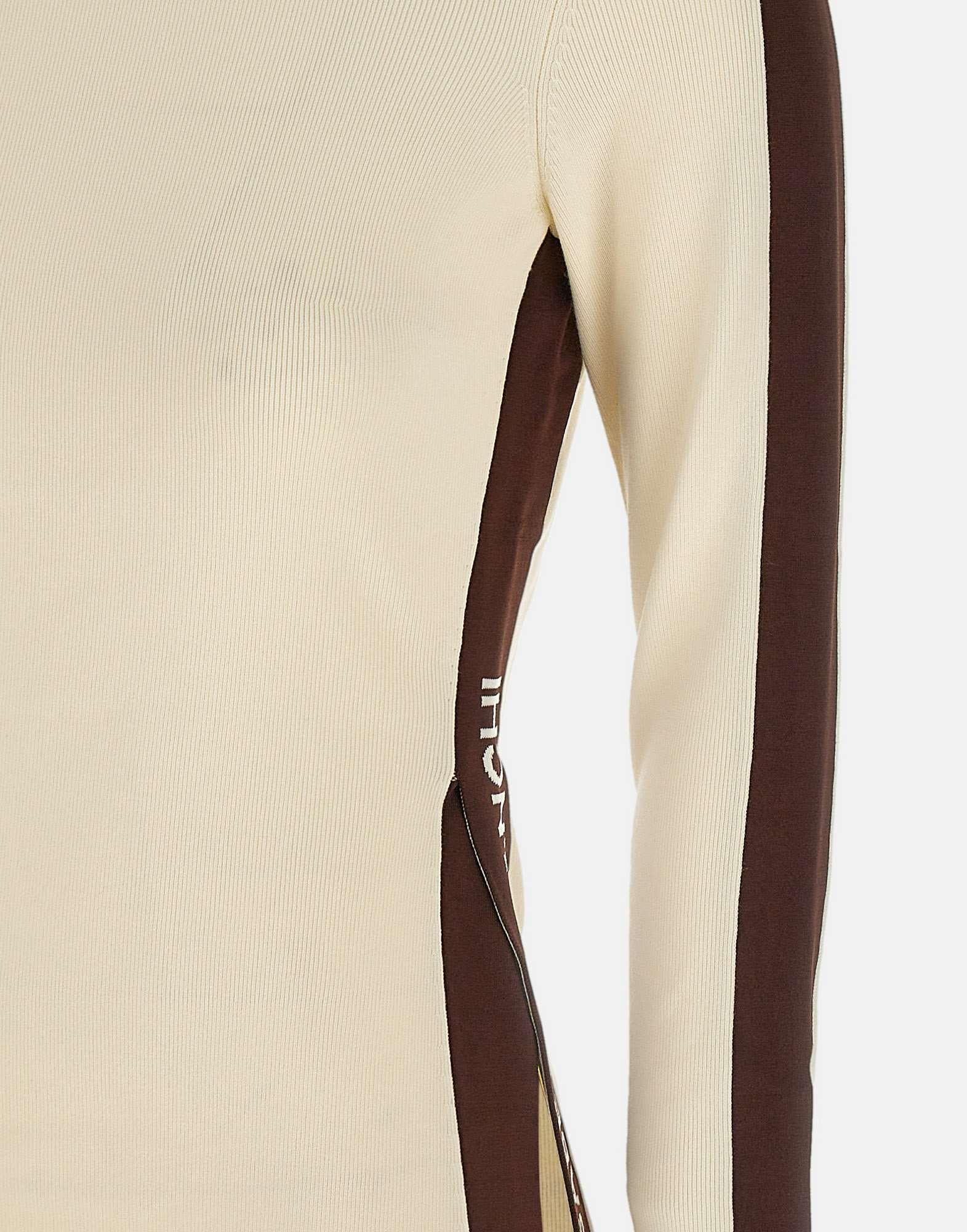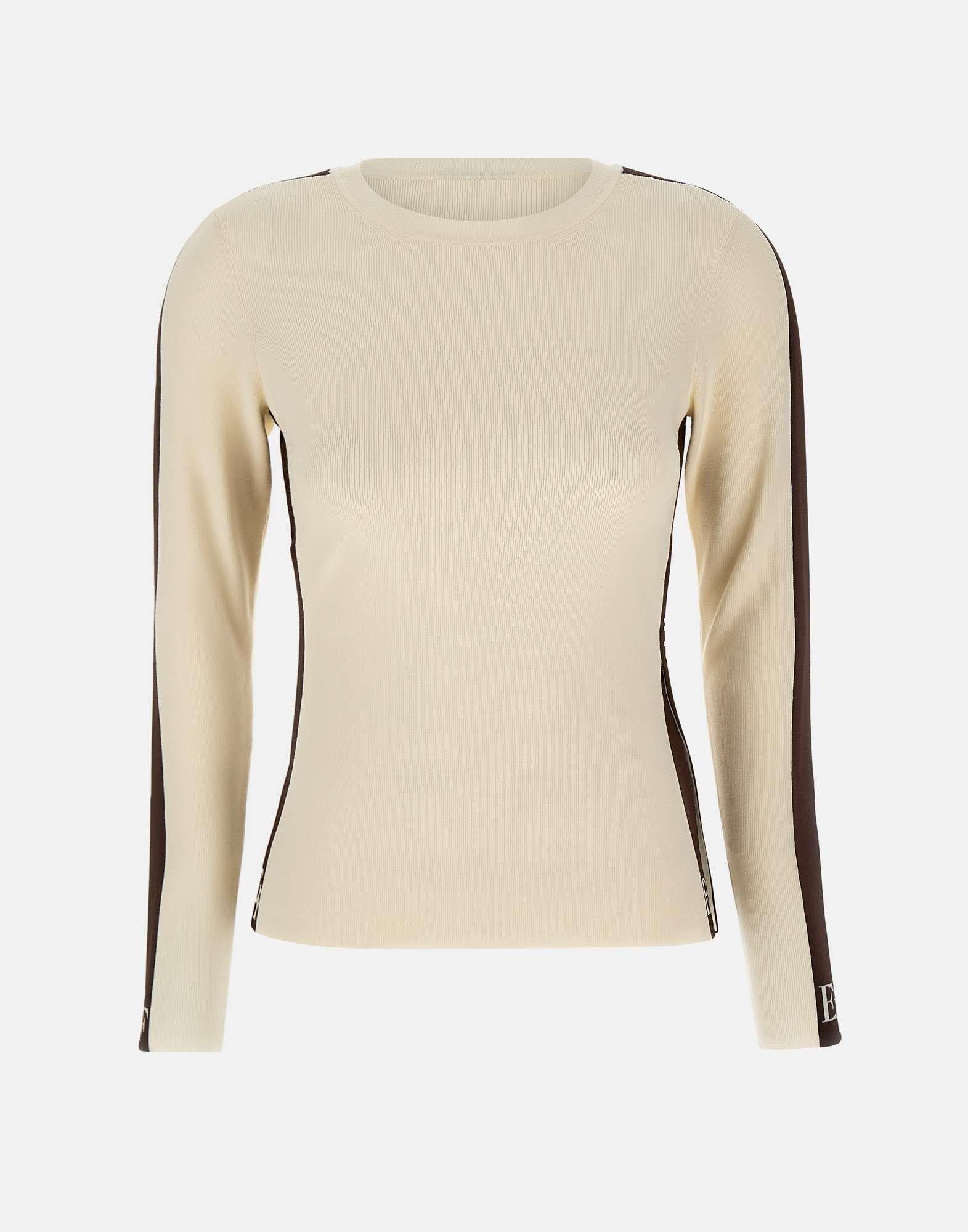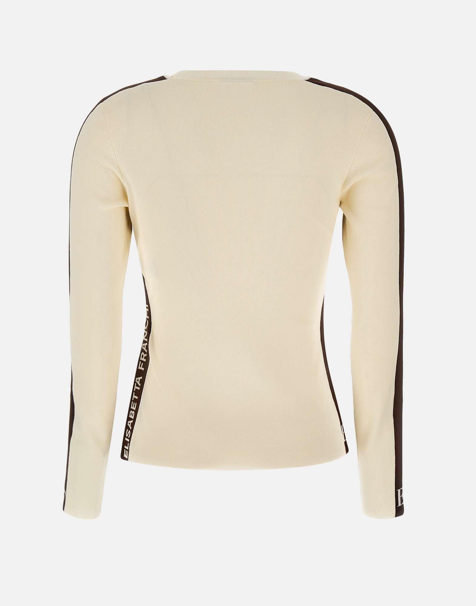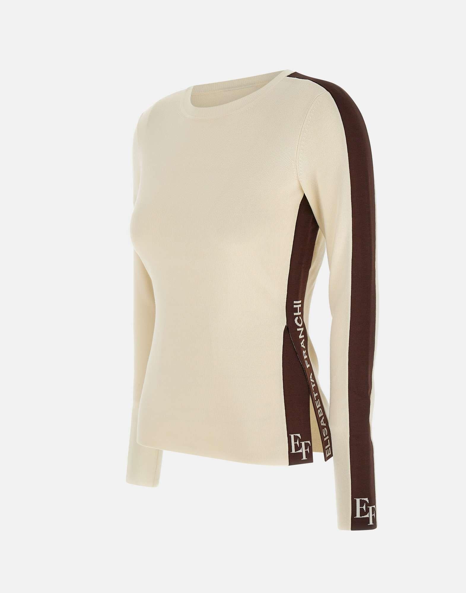 Maglia Elisabetta Franchi "Urban" in viscosa, panna e cioccolato, con girocollo e maniche lunghe. Le bande in viscosa lucida creano un raffinato contrasto di texture, mentre i loghi intarsiati a contrasto donano un tocco grafico e contemporaneo. Spacchetto laterale al fondo per maggiore movimento. Vestibilità slim. Lunghezza 60 cm per la taglia 40 IT.